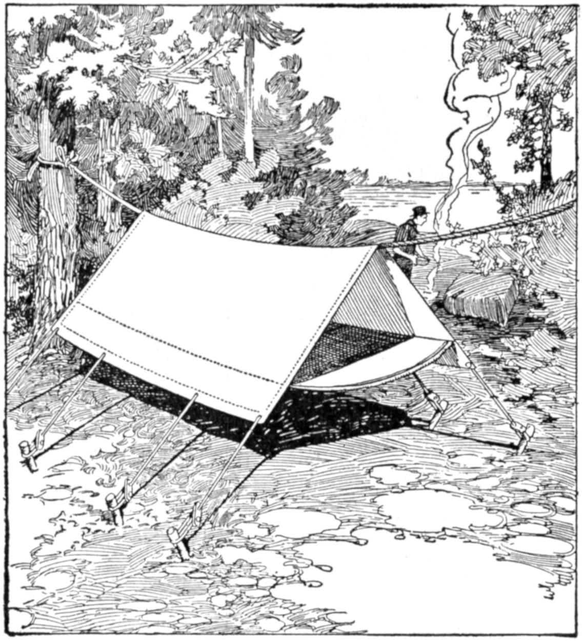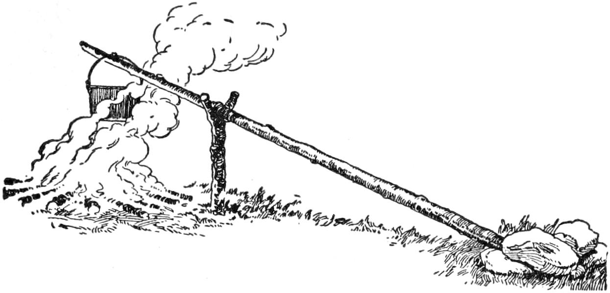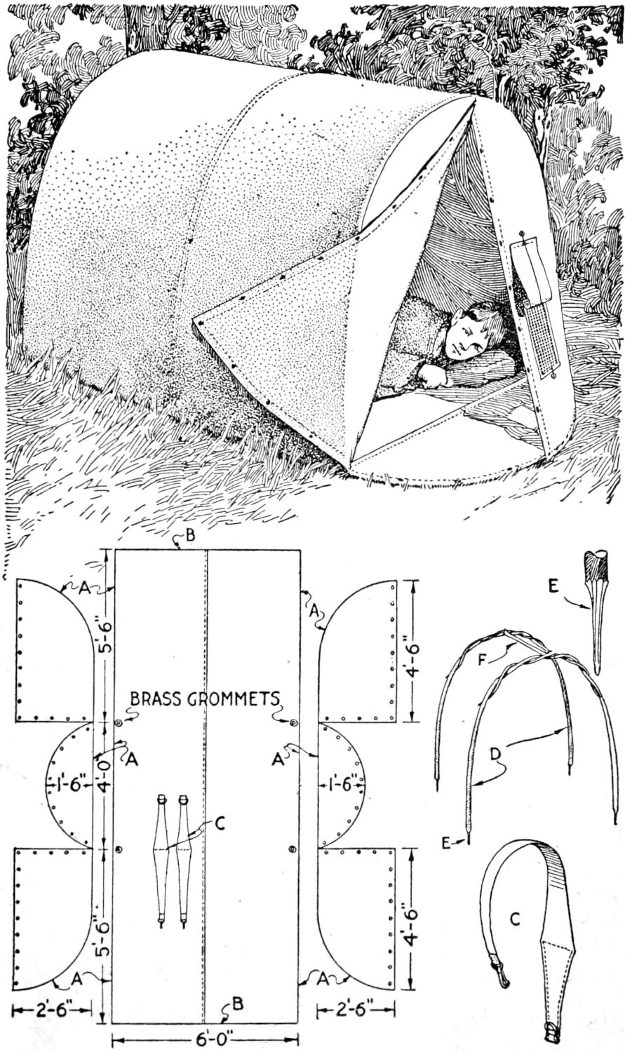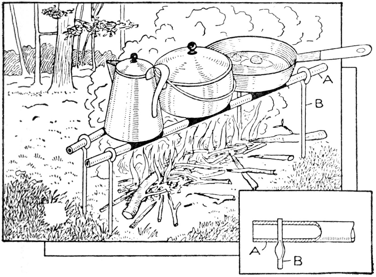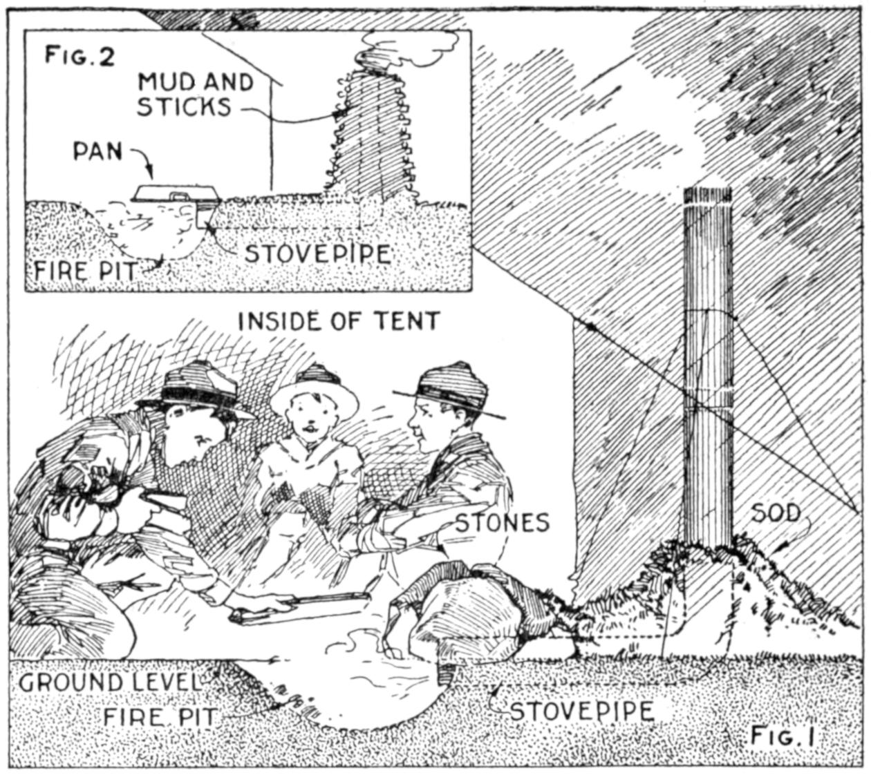 While conducting a boys’ camp in summer we experienced a severe sleet storm. Our tents were not equipped with stoves and I faced a double problem: to keep the boys warm and to keep them contented. The difficulty was solved by having them construct emergency camp stoves, as shown, using iron stovepipe, and other material at hand. One length of pipe is laid under the side of the tent about 4 in. in the ground, as in Fig. 1. An elbow mounted in sod connects with the chimney. A stone at the front of the stove regulates the draft, and stones placed upon the pipe hold the heat. The arrangement diagrammed in Fig. 2 is built with one length of pipe or a stone conduit. A hole is dug into the ground, about 10 in. deep. Over this is placed a pan, and an opening is made at the front for the fuel. The chimney is made of stones and sticks picked up around the camp, and plastered with mud. Coffee may be boiled or small cooking done on this stove.—William H. Leach, Alden, N. Y.