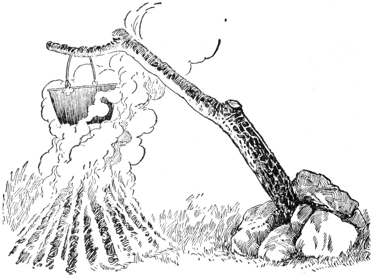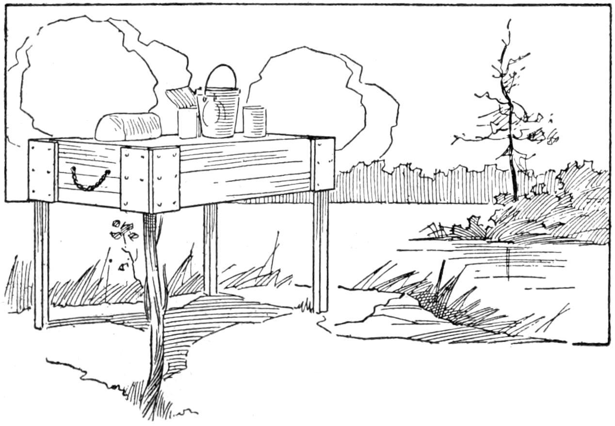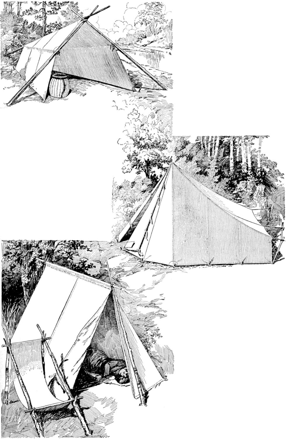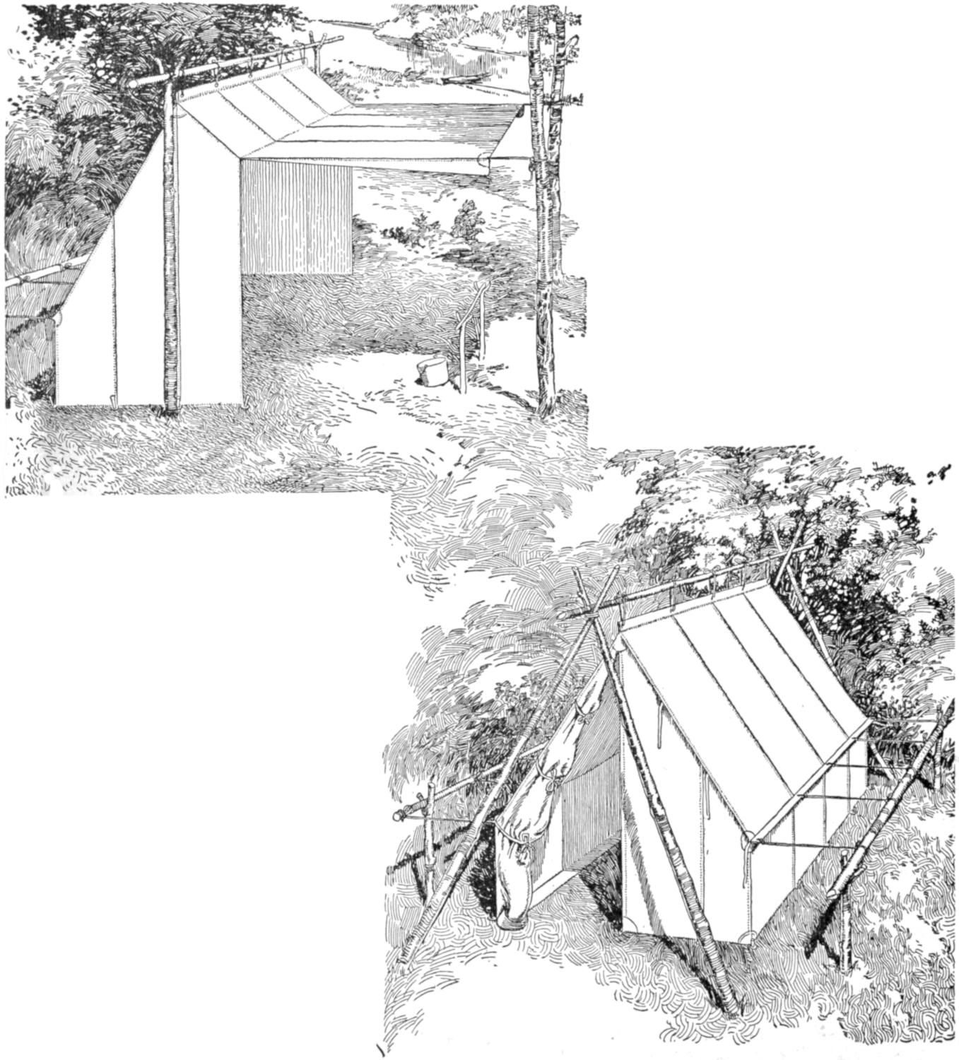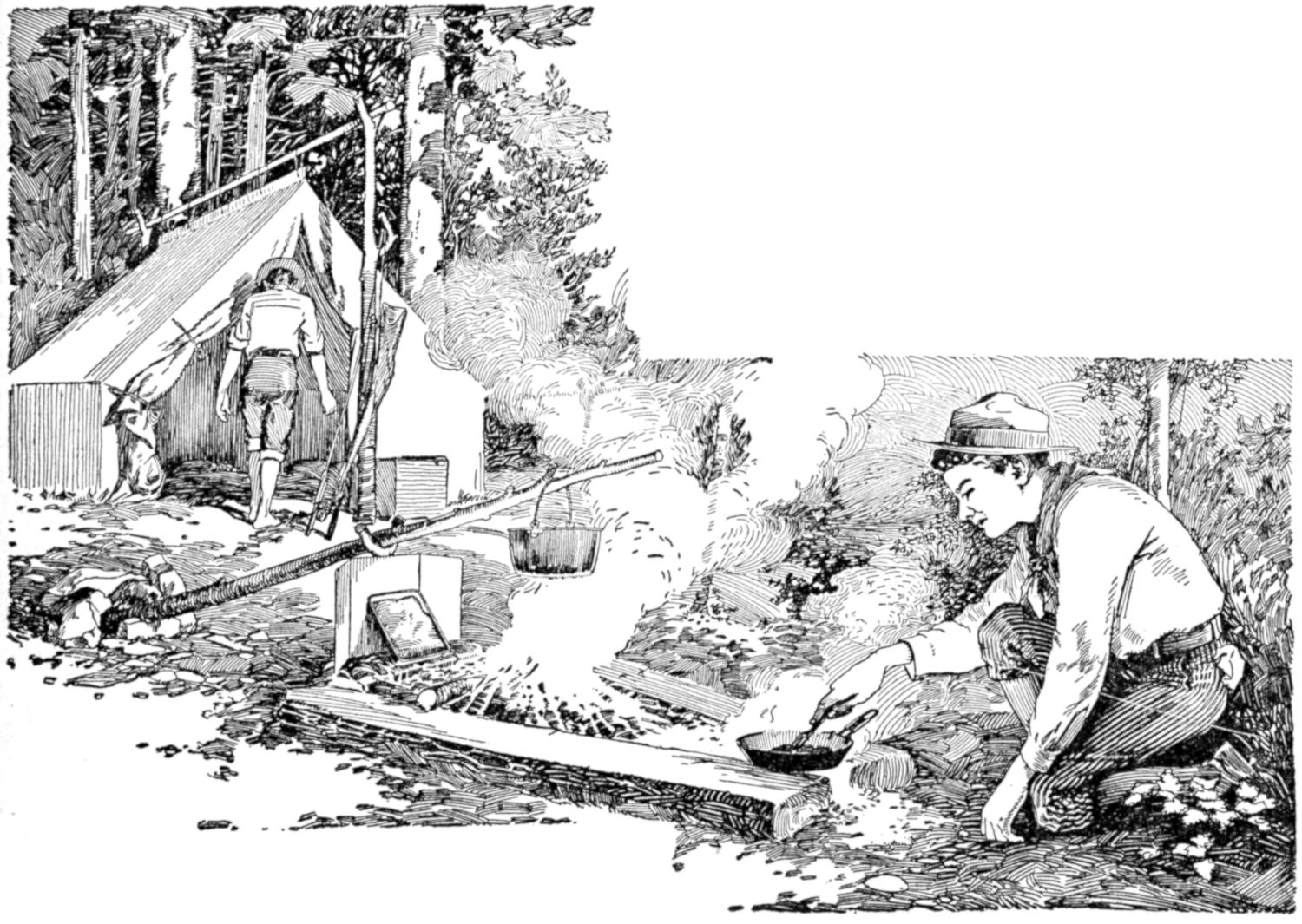While conducting a boys’ camp in summer we experienced a severe sleet storm. Our tents were not equipped with stoves and I faced a double problem: to keep the boys warm and to keep them contented. The difficulty was solved by having them construct emergency camp stoves, as shown, using iron stovepipe, and other material at hand. One length of pipe is laid under the side of the tent about 4 in. in the ground, as in Fig. 1. An elbow mounted in sod connects with the chimney. A stone at the front of the stove regulates the draft, and stones placed upon the pipe hold the heat. The arrangement diagrammed in Fig. 2 is built with one length of pipe or a stone conduit. A hole is dug into the ground, about 10 in. deep. Over this is placed a pan, and an opening is made at the front for the fuel. The chimney is made of stones and sticks picked up around the camp, and plastered with mud. Coffee may be boiled or small cooking done on this stove.—William H. Leach, Alden, N. Y.
