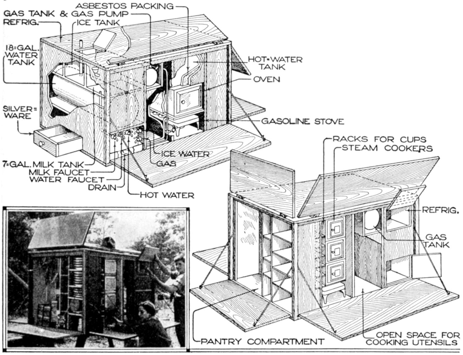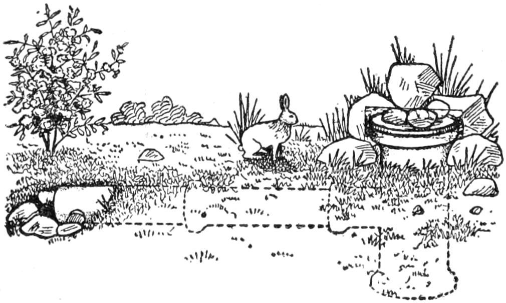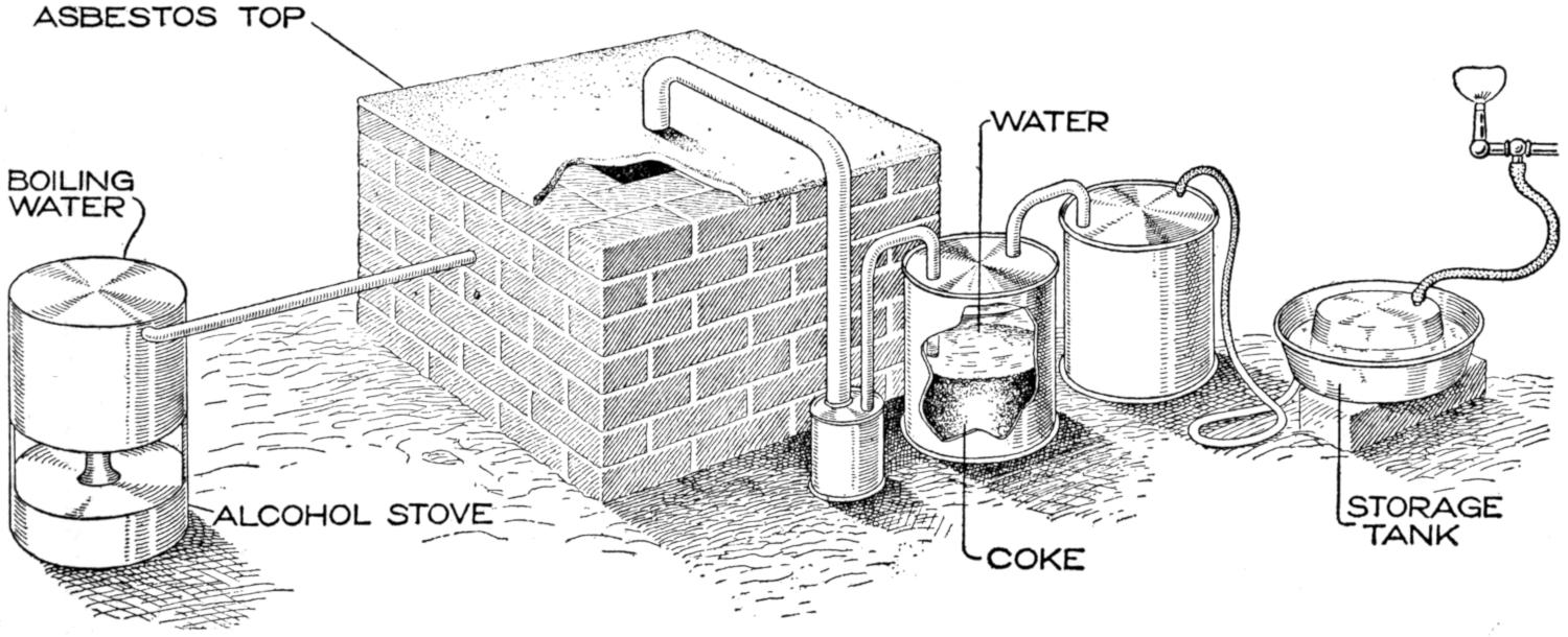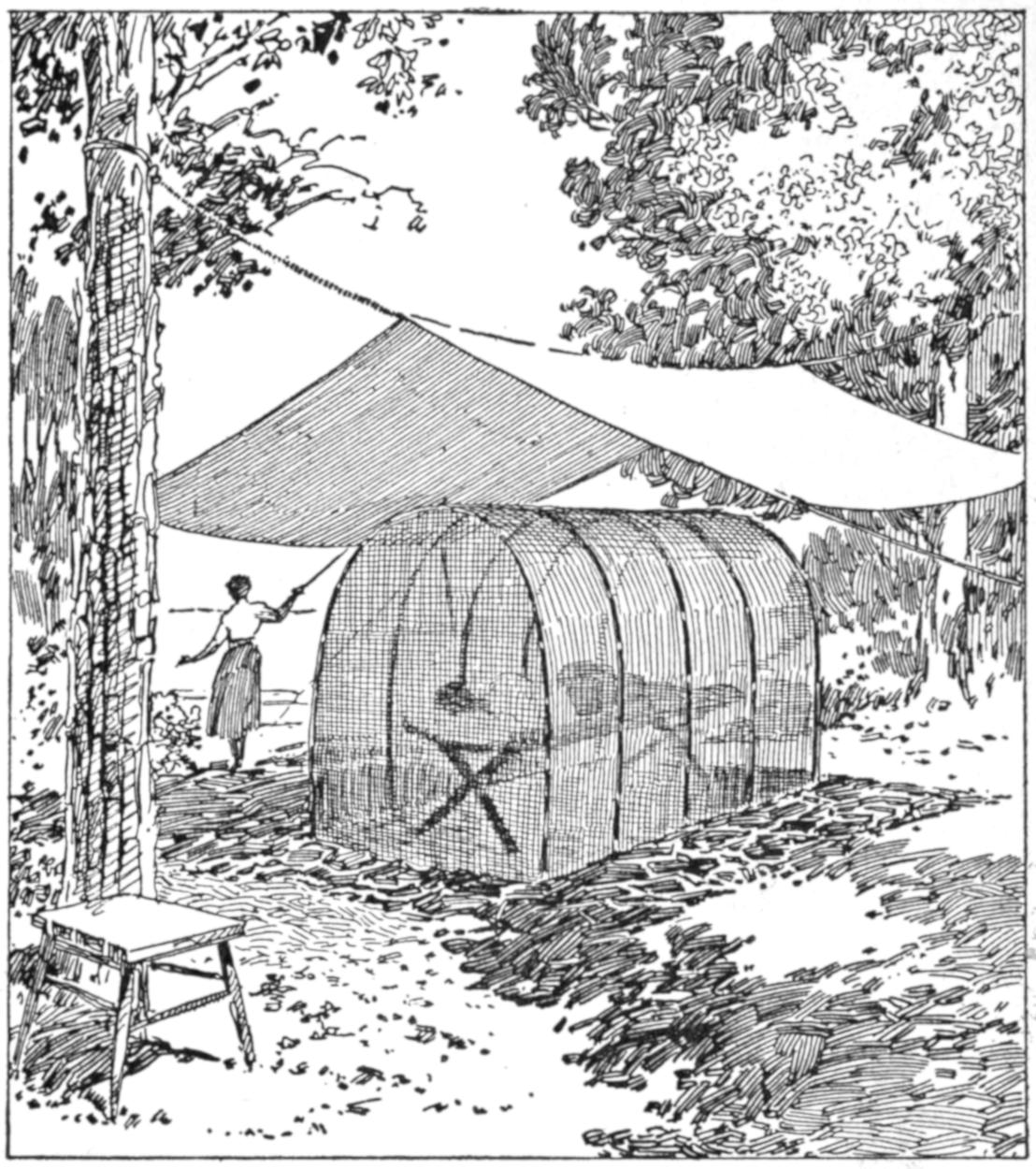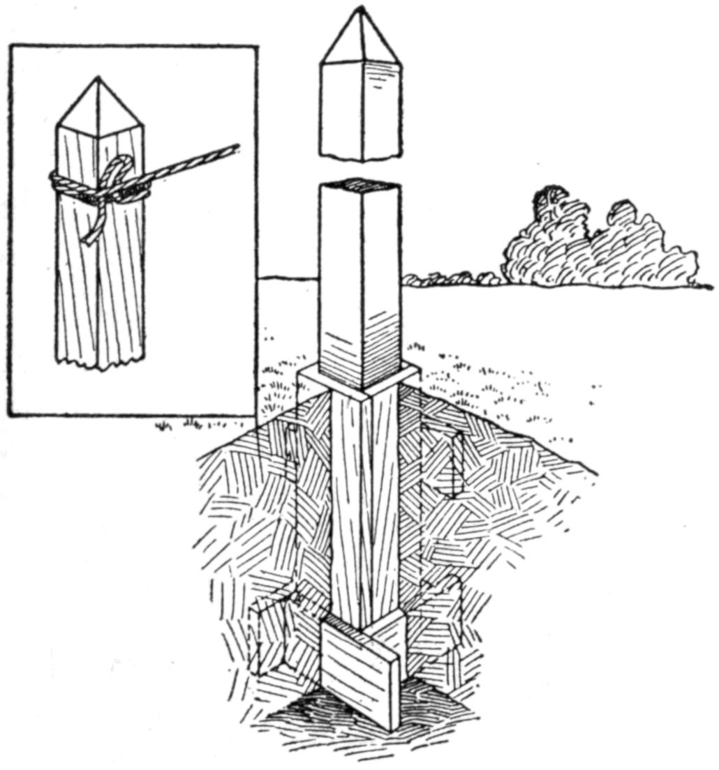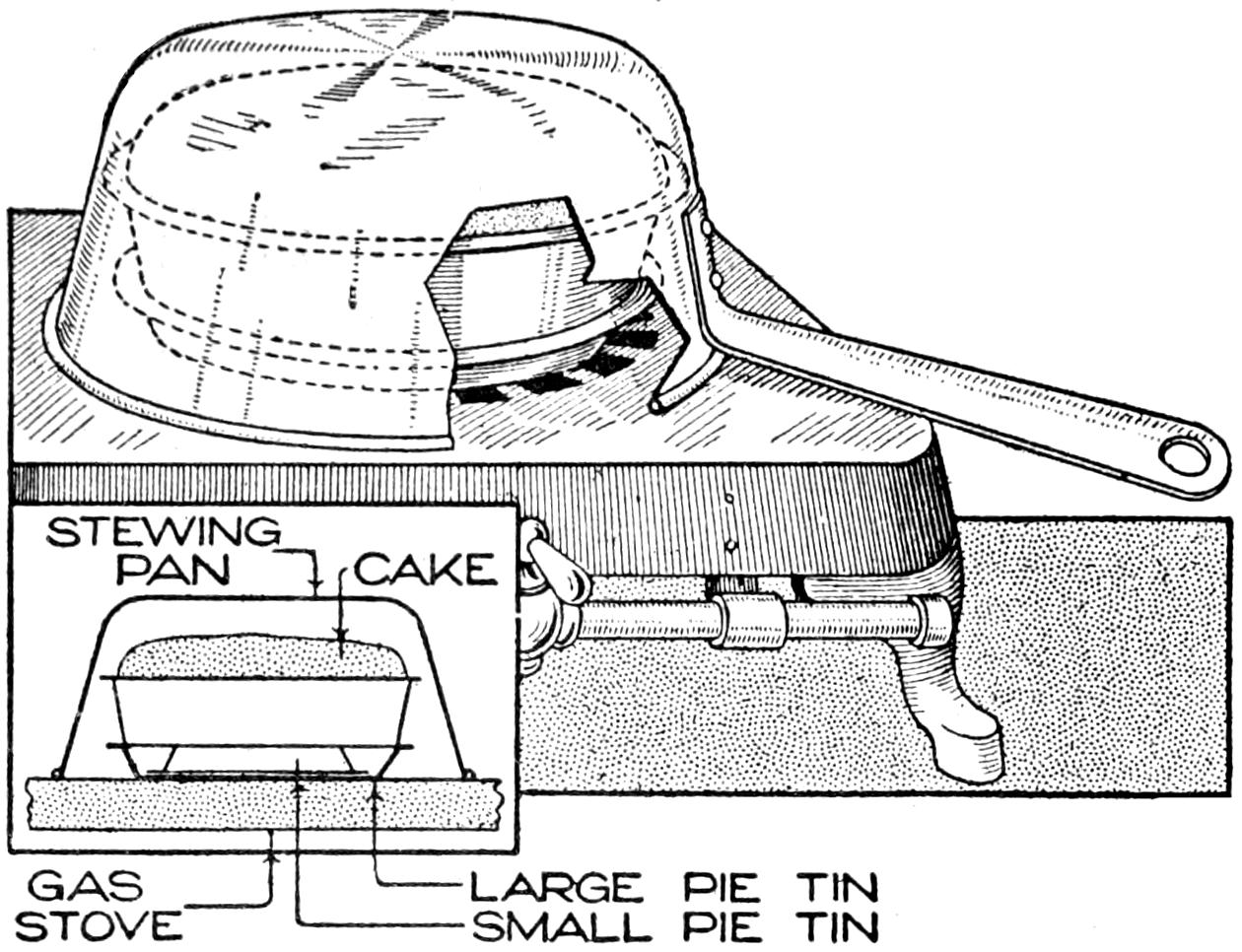 While conducting a boys’ camp in summer we experienced a severe sleet storm. Our tents were not equipped with stoves and I faced a double problem: to keep the boys warm and to keep them contented. The difficulty was solved by having them construct emergency camp stoves, as shown, using iron stovepipe, and other material at hand. One length of pipe is laid under the side of the tent about 4 in. in the ground, as in Fig. 1. An elbow mounted in sod connects with the chimney. A stone at the front of the stove regulates the draft, and stones placed upon the pipe hold the heat. The arrangement diagrammed in Fig. 2 is built with one length of pipe or a stone conduit. A hole is dug into the ground, about 10 in. deep. Over this is placed a pan, and an opening is made at the front for the fuel. The chimney is made of stones and sticks picked up around the camp, and plastered with mud. Coffee may be boiled or small cooking done on this stove.—William H. Leach, Alden, N. Y.