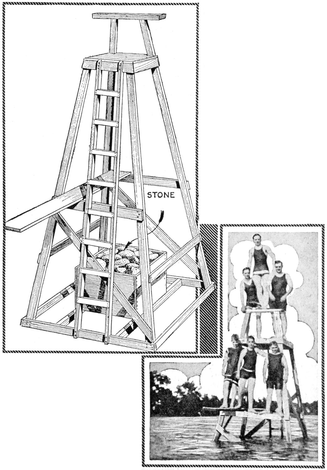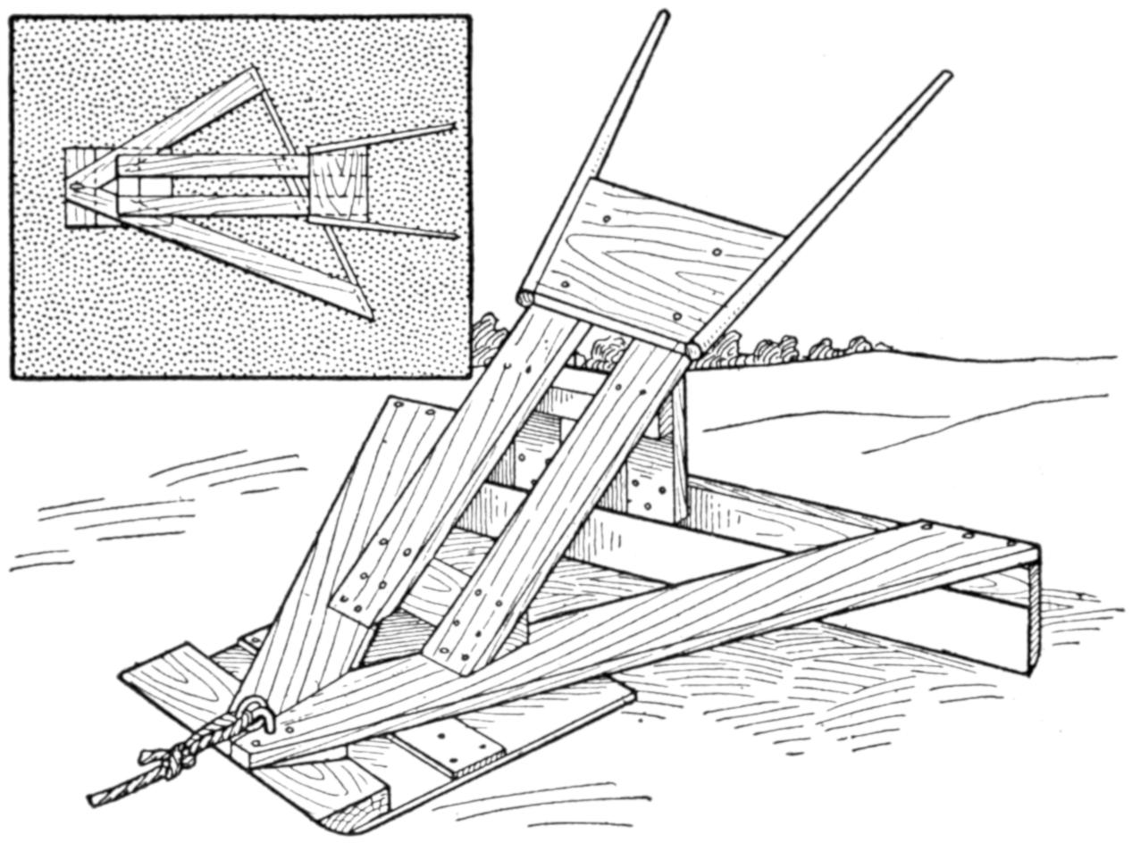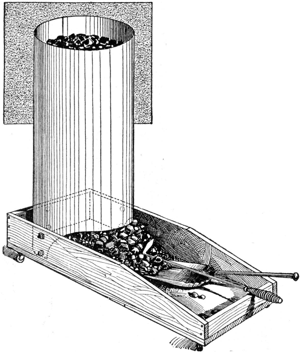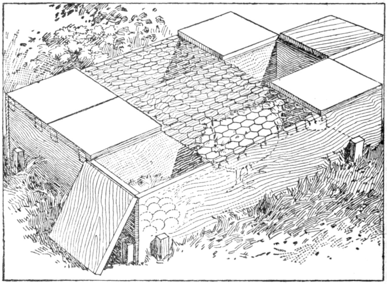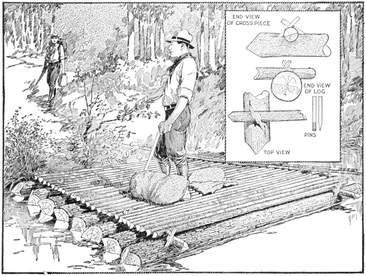 While conducting a boys’ camp in summer we experienced a severe sleet storm. Our tents were not equipped with stoves and I faced a double problem: to keep the boys warm and to keep them contented. The difficulty was solved by having them construct emergency camp stoves, as shown, using iron stovepipe, and other material at hand. One length of pipe is laid under the side of the tent about 4 in. in the ground, as in Fig. 1. An elbow mounted in sod connects with the chimney. A stone at the front of the stove regulates the draft, and stones placed upon the pipe hold the heat. The arrangement diagrammed in Fig. 2 is built with one length of pipe or a stone conduit. A hole is dug into the ground, about 10 in. deep. Over this is placed a pan, and an opening is made at the front for the fuel. The chimney is made of stones and sticks picked up around the camp, and plastered with mud. Coffee may be boiled or small cooking done on this stove.—William H. Leach, Alden, N. Y.