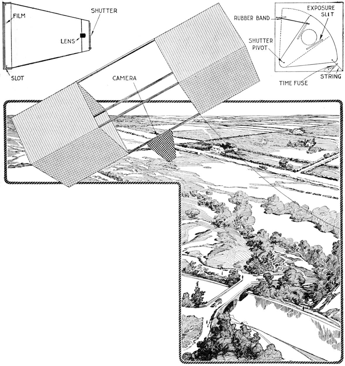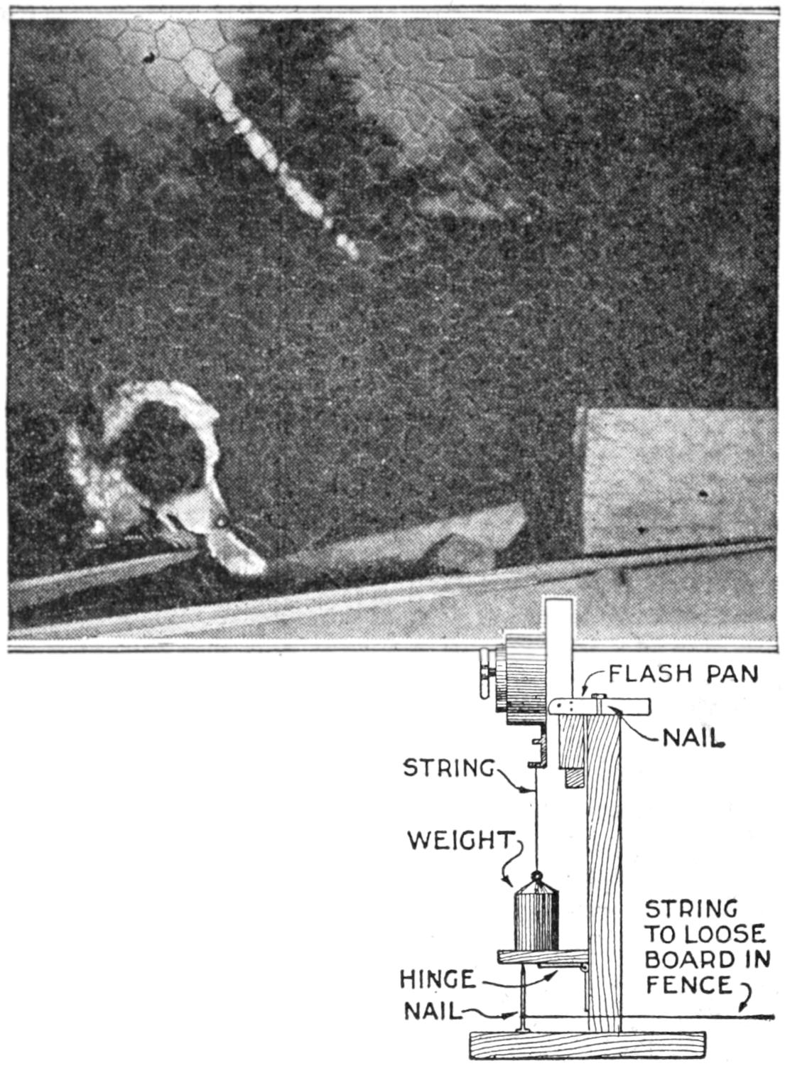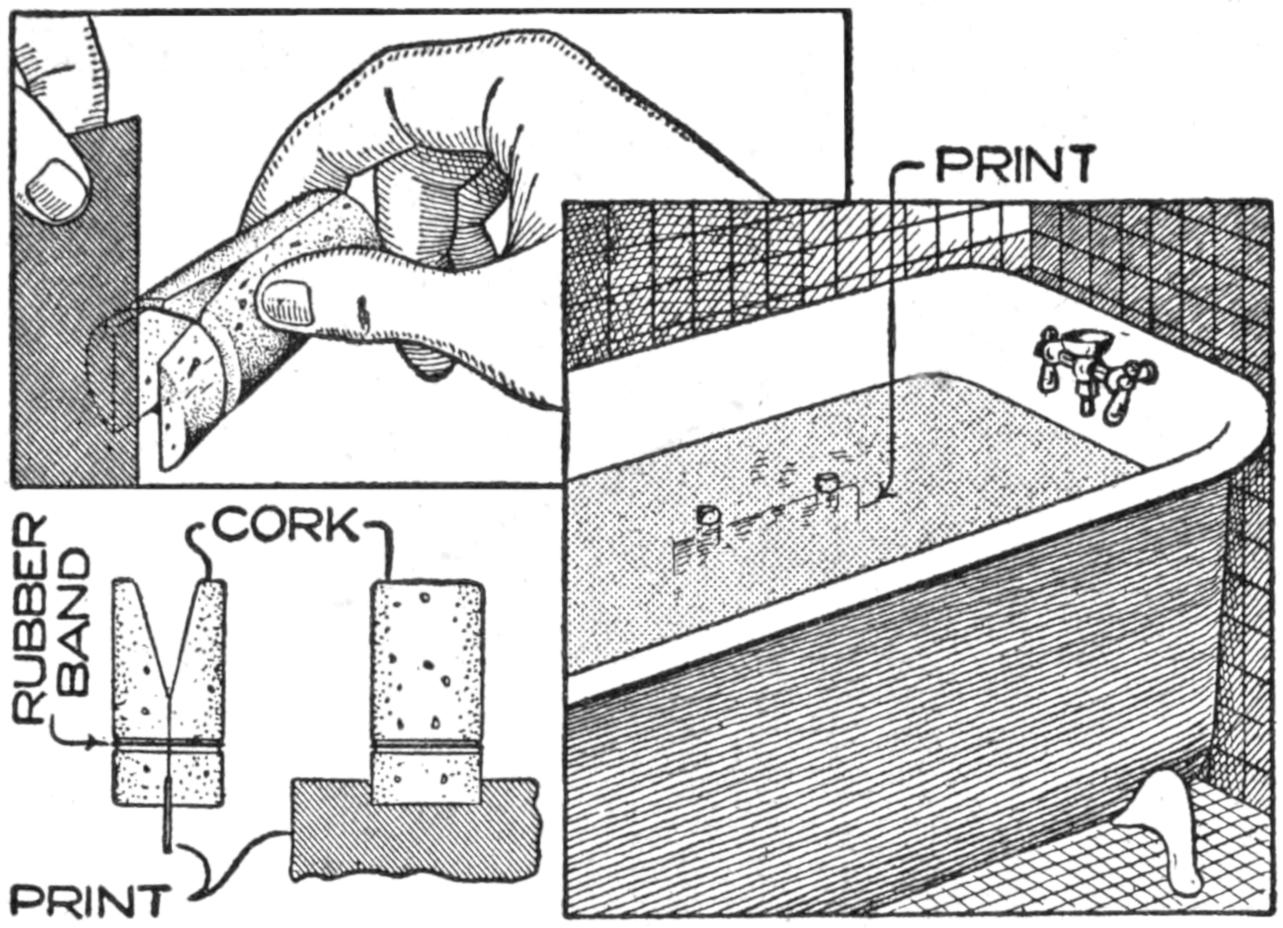 It is usually disappointing to the amateur photographer, when taking pictures of groups of which he is a member, not to be able to be in the pictures. However, most amateurs can construct a release arrangement, in a few minutes, that operates with satisfaction. A clothespin of the clip type is used. The spring should be weakened by bending it from the wood, so that it has just enough tension to bring the jaws of the clothespin together without a snap. Whittle the inner sides of the handles, as shown, so that the jaws accommodate the plunger of the shutter. Then saw a slot in the handles, ¹⁄₄ in. deep and ¹⁄₈ in. wide. Drill a ³⁄₁₆-in. hole in the whittled depression of one of the jaws, and cut a ¹⁄₈-in. slot to it, as shown. The small trigger piece is cut of hard wood. It should fit its slot snugly, at the other end of the pin.