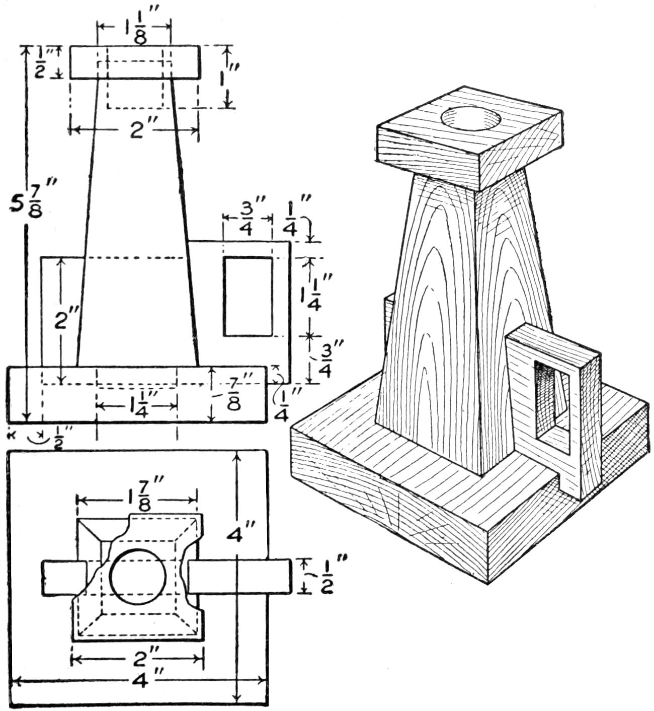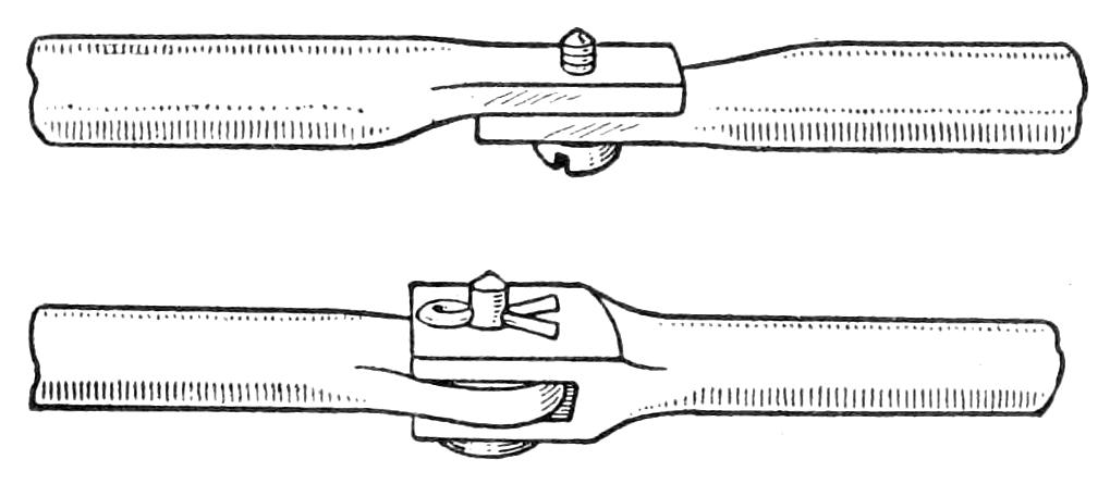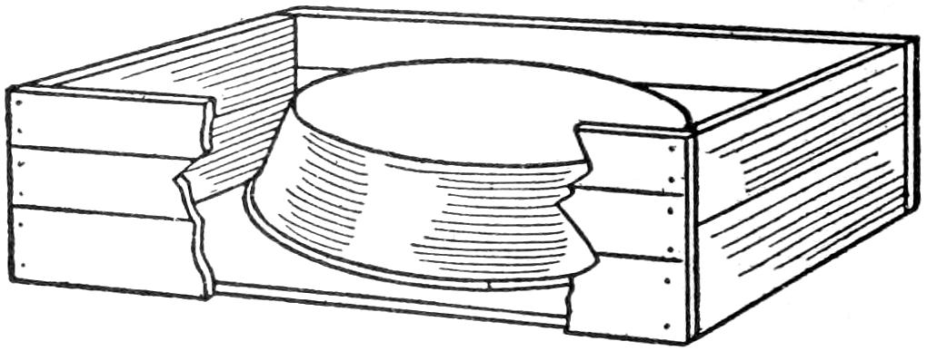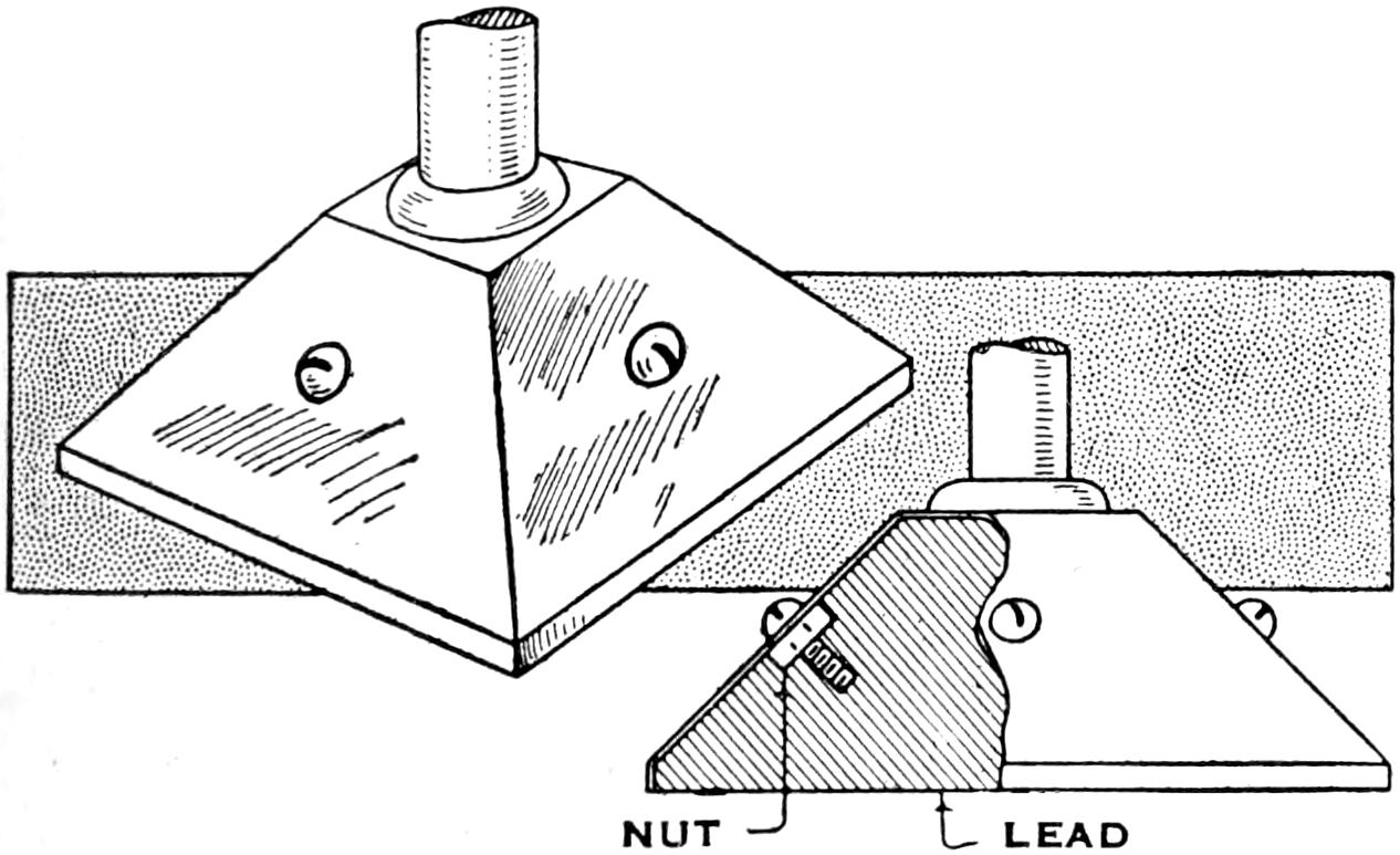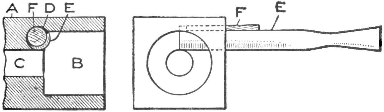 Also make a small wooden plug, and set it in the center, its point touching the pattern, and pour the plaster around it. When the mold is dry remove this plug, thus forming the sprue hole, through which the molten lead is poured into the mold.