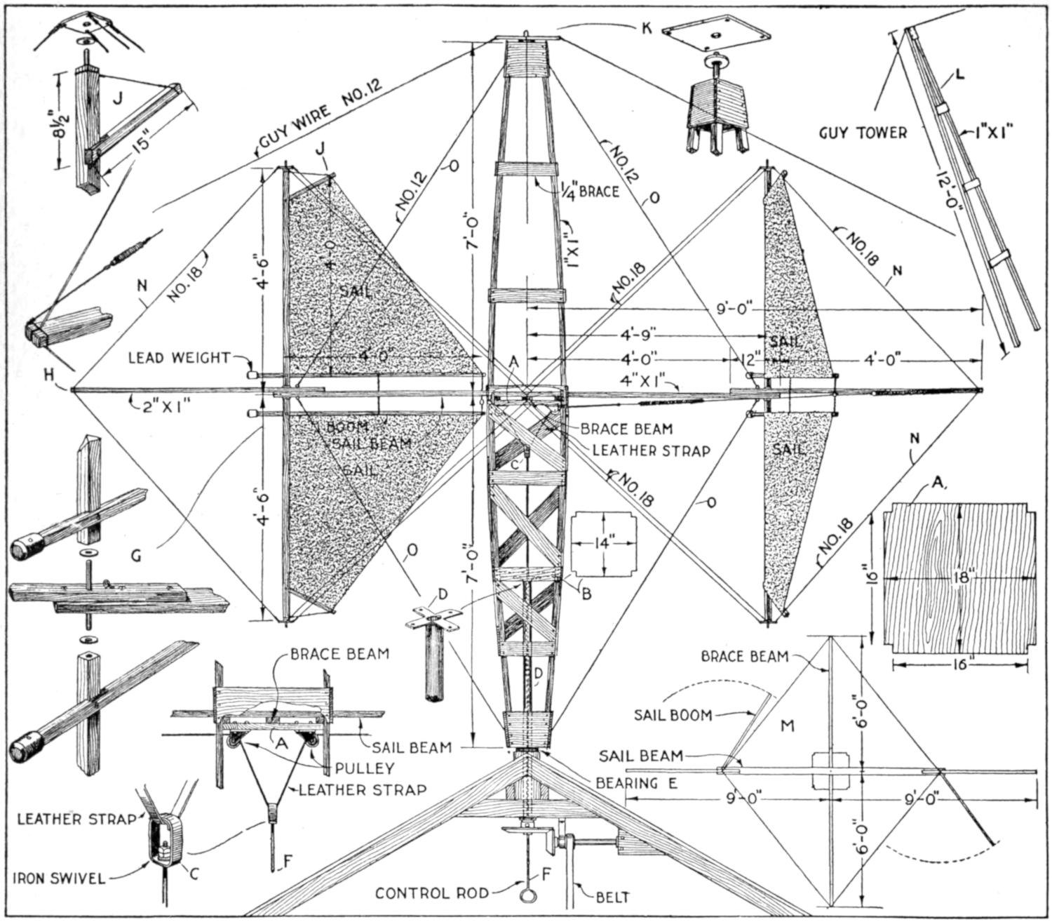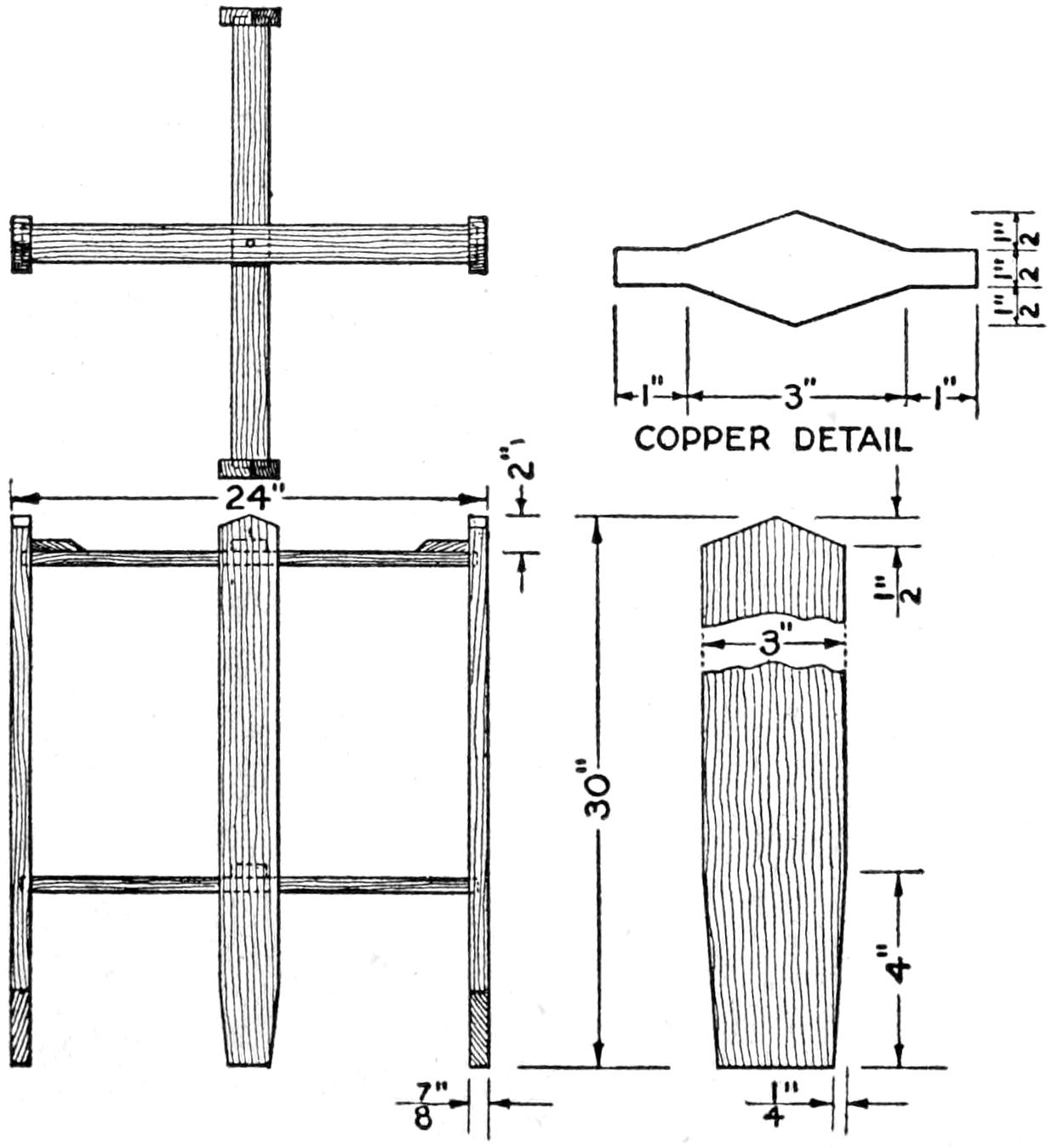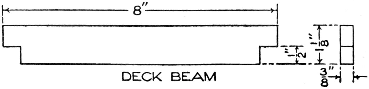 The construction may be begun with the chassis and the running gear. Fit the wheels with ⁵⁄₈-in. axles, as shown in the assembly views, Figs. 1, 2, and 3, and detailed in Fig. 4. Fit the ends of the axles to the hubs of the wheels, providing the threaded ends with lock nuts. Make the wooden supports for the frame, as detailed in Fig. 6. The axles are fastened into half-round grooves, cut in the bottoms of the supports, and secured by iron straps, as shown in Fig. 4, at A. Make the sidepieces for the main frame 2¹⁄₂ by 3¹⁄₄ in. thick, and 9 ft. 4 in. long, as detailed in Fig. 7. Mortise the supports through the sidepieces, and bore the holes for the bolt fastenings and braces. Glue the mortise-and-tenon joints before the bolts are finally secured. Provide the bolts with washers, and lock the nuts with additional jam nuts where needed. Keep the woodwork clean, and apply a coat of linseed oil, so that dirt and grease cannot penetrate readily.