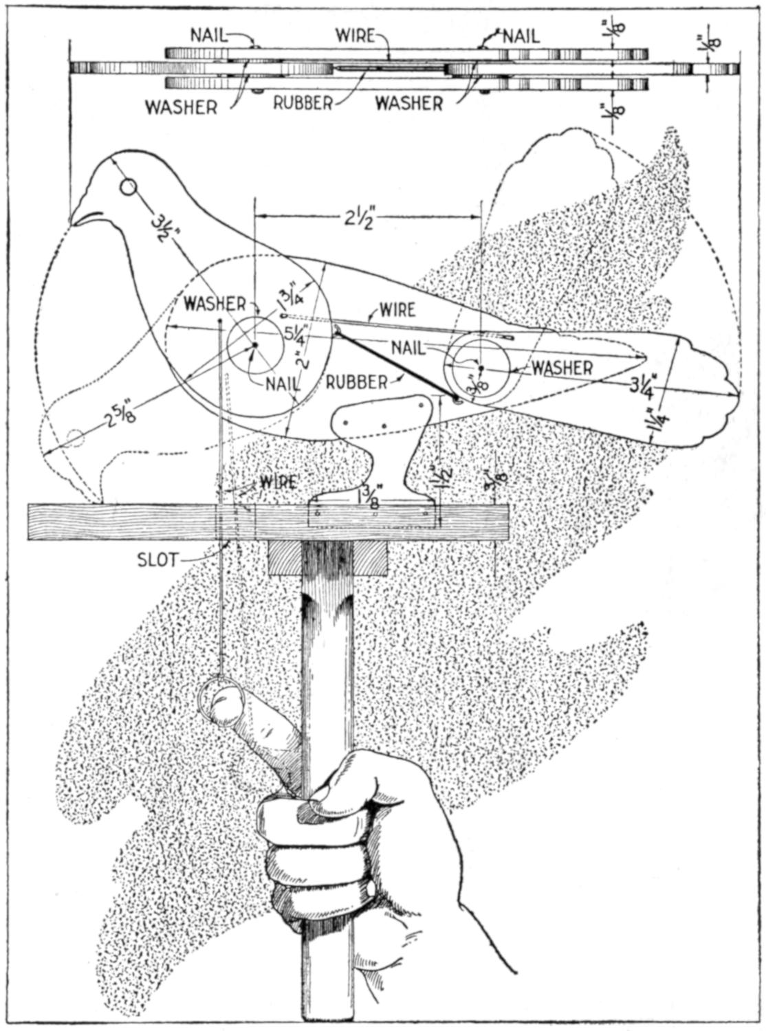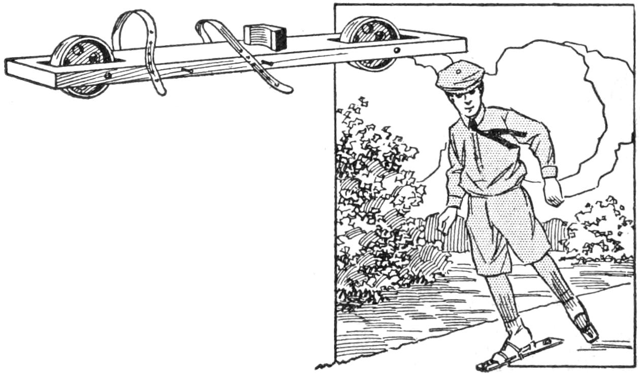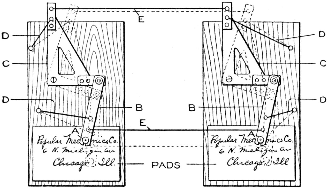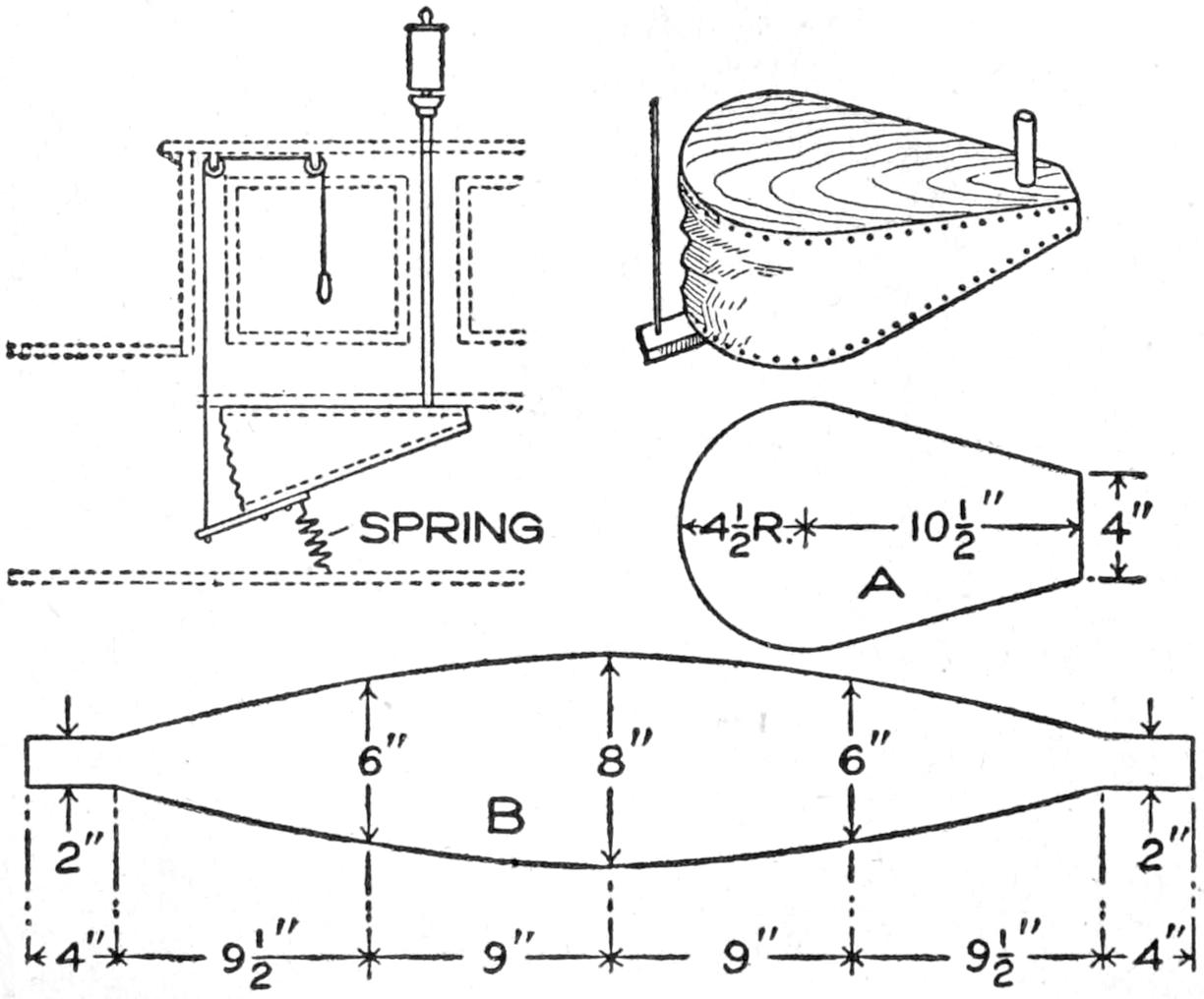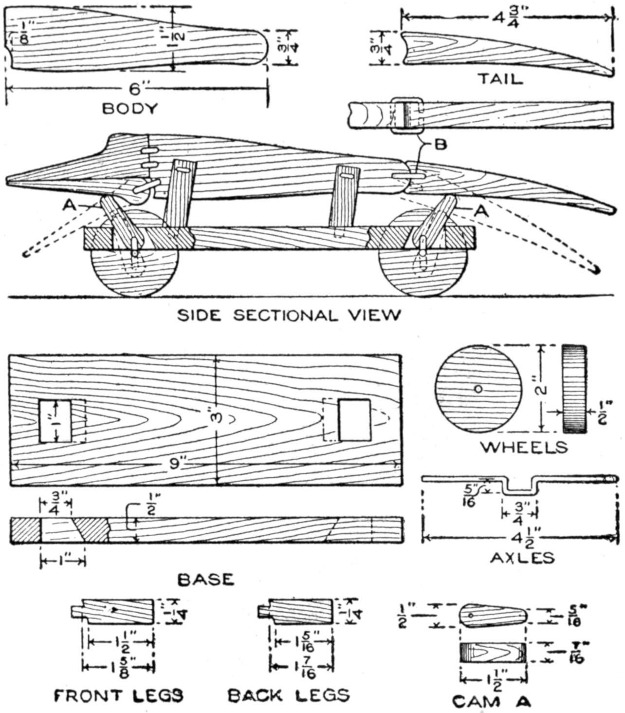 A toy alligator that opens its mouth and wags its tail as it is pulled along can be made of wood by a boy, with a jackknife. The various parts, as shown, are cut from soft wood, ¹⁄₂ in. thick. The method of fastening the parts is shown in the side sectional view. When the wheels turn, the cams A, set on the crank portions of the wheel axles, raise and lower the jaw and tail. The upper jaw is 1 in. wide at the widest part, and 3 in. long. The lower jaw is smaller, and the same length. The body is 6 in. long, and tapering in width from 1¹⁄₂ to ³⁄₄ in. The tail is 4³⁄₄ in. long, and ³⁄₄ in. wide. Holes are drilled in each piece near the edge, at joining points, through which wires are drawn, and clamped, as at B. The legs are shown in detail. They are attached to the body by drilling a ¹⁄₁₆-in. hole in each, and a hole through the body, through which the fastenings are passed. The lower end of the legs are fastened to the base, which is 3 by 9 in. long. Square holes, 1 in. wide, near each end, are provided for the cams A. The axles and wheels are made as shown. The axles fit tightly in the wheels, so that the latter can move the axles around with each turn. The axles are made from ¹⁄₈-in. wire, bent as shown, and should be long enough, after passing through the bottom, to extend through the wheels on each side.—Charles C. Wagner, Los Angeles, Calif.
