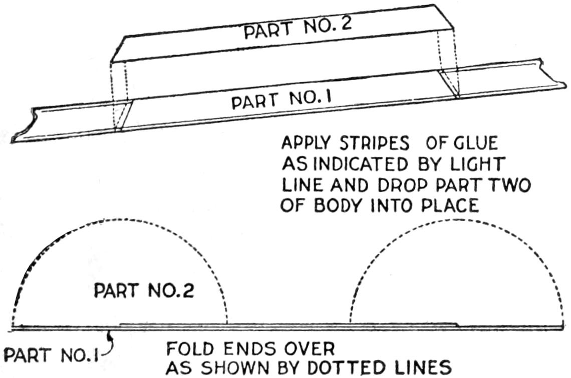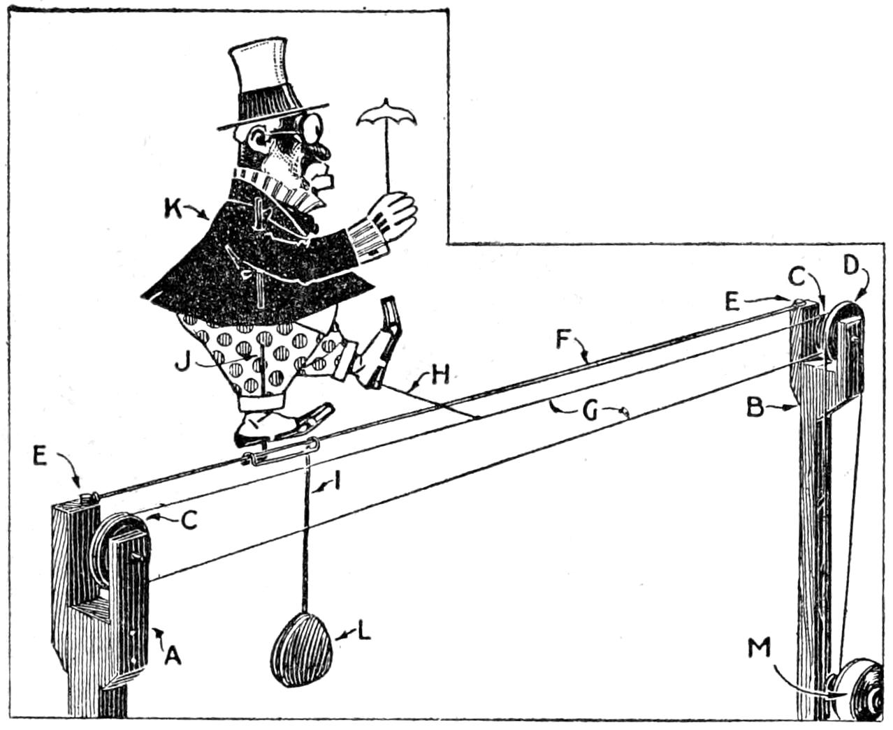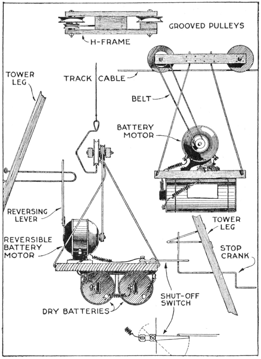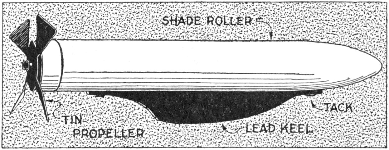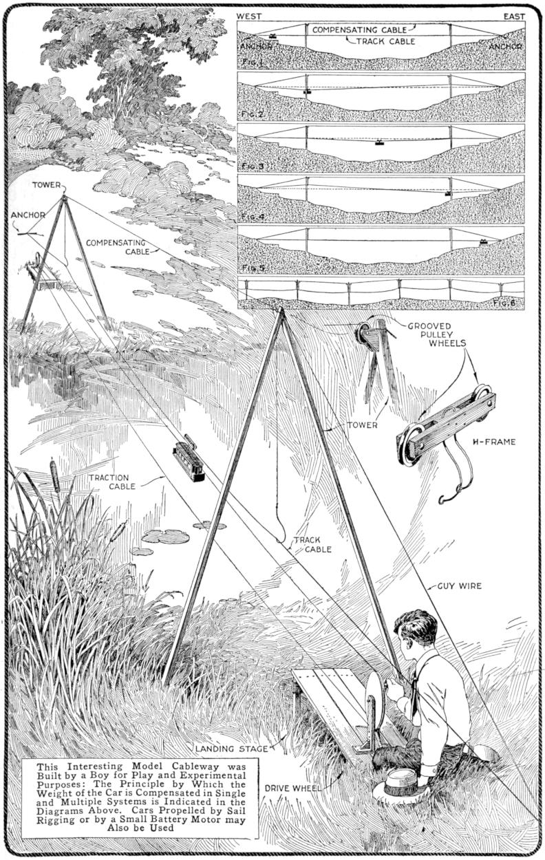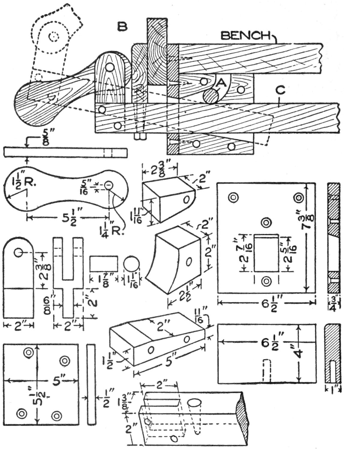 A toy alligator that opens its mouth and wags its tail as it is pulled along can be made of wood by a boy, with a jackknife. The various parts, as shown, are cut from soft wood, ¹⁄₂ in. thick. The method of fastening the parts is shown in the side sectional view. When the wheels turn, the cams A, set on the crank portions of the wheel axles, raise and lower the jaw and tail. The upper jaw is 1 in. wide at the widest part, and 3 in. long. The lower jaw is smaller, and the same length. The body is 6 in. long, and tapering in width from 1¹⁄₂ to ³⁄₄ in. The tail is 4³⁄₄ in. long, and ³⁄₄ in. wide. Holes are drilled in each piece near the edge, at joining points, through which wires are drawn, and clamped, as at B. The legs are shown in detail. They are attached to the body by drilling a ¹⁄₁₆-in. hole in each, and a hole through the body, through which the fastenings are passed. The lower end of the legs are fastened to the base, which is 3 by 9 in. long. Square holes, 1 in. wide, near each end, are provided for the cams A. The axles and wheels are made as shown. The axles fit tightly in the wheels, so that the latter can move the axles around with each turn. The axles are made from ¹⁄₈-in. wire, bent as shown, and should be long enough, after passing through the bottom, to extend through the wheels on each side.—Charles C. Wagner, Los Angeles, Calif.