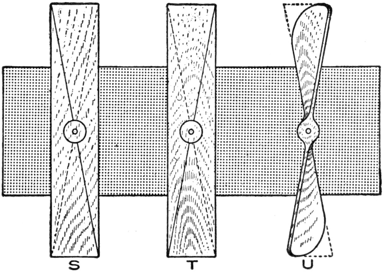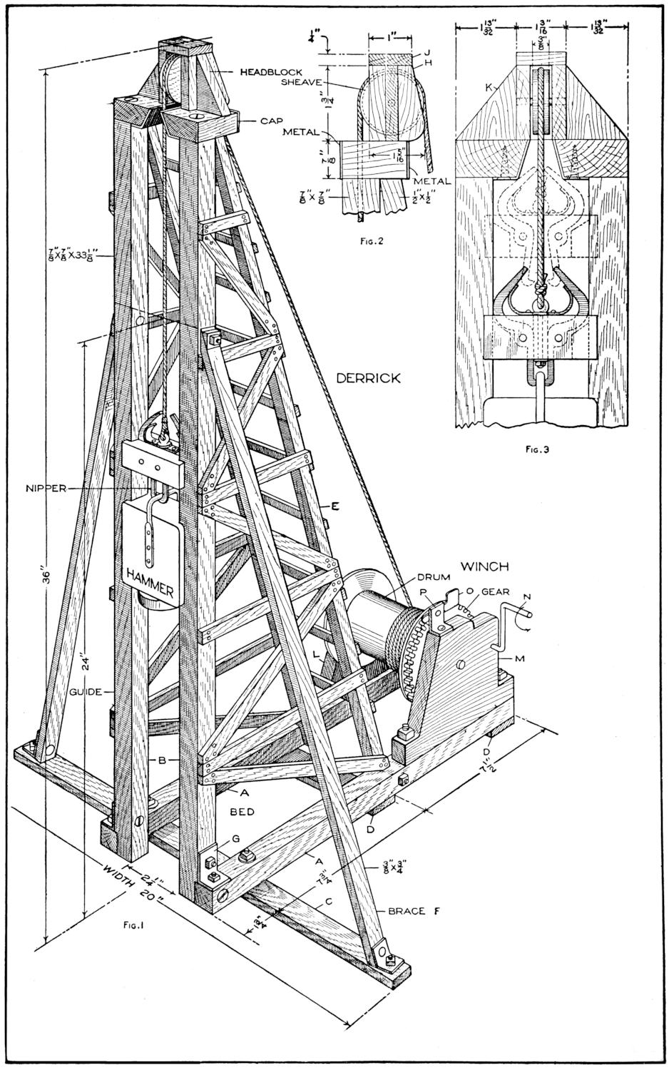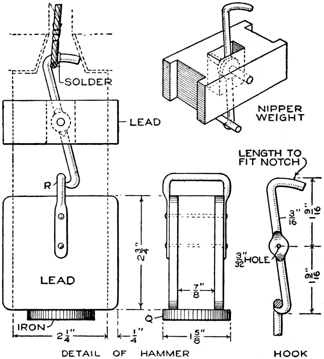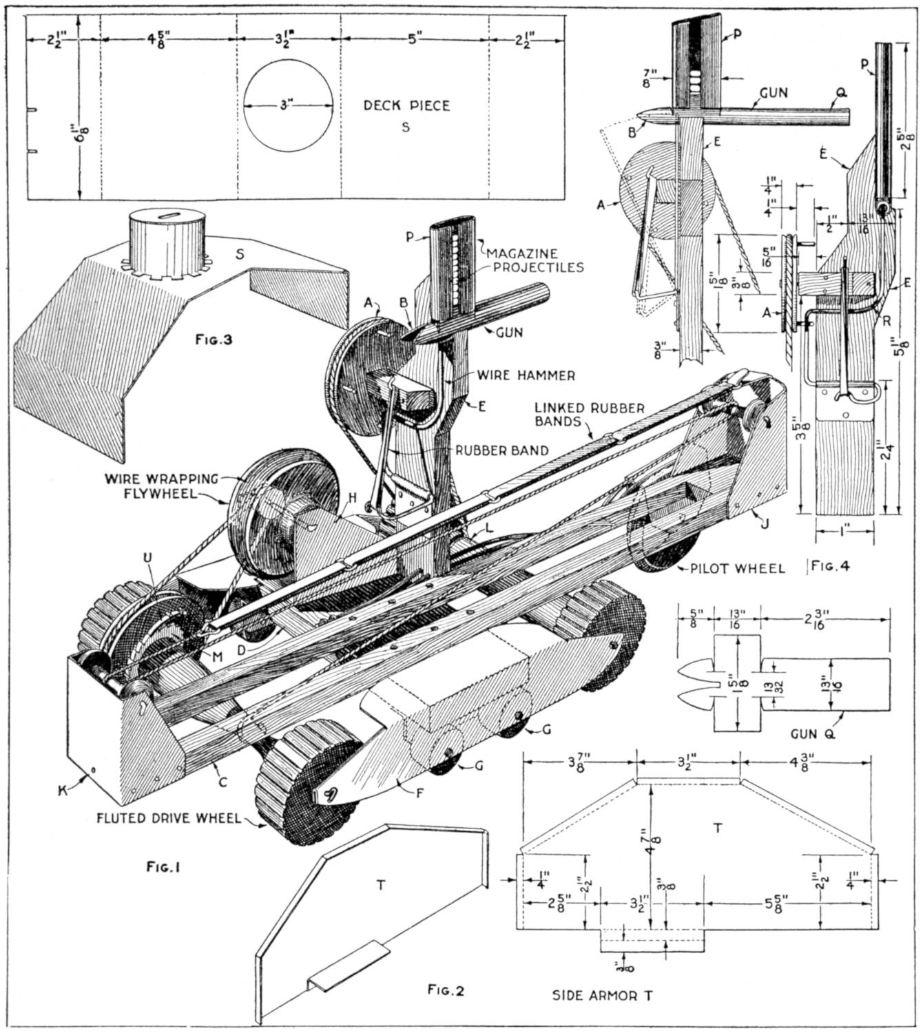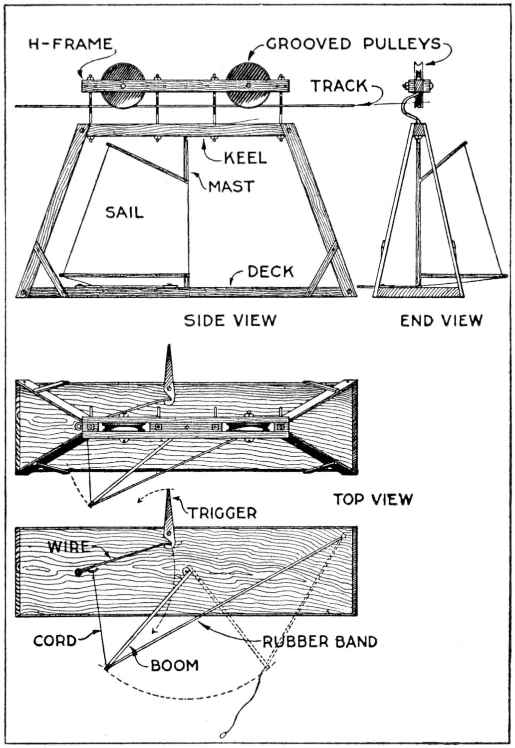 A toy alligator that opens its mouth and wags its tail as it is pulled along can be made of wood by a boy, with a jackknife. The various parts, as shown, are cut from soft wood, ¹⁄₂ in. thick. The method of fastening the parts is shown in the side sectional view. When the wheels turn, the cams A, set on the crank portions of the wheel axles, raise and lower the jaw and tail. The upper jaw is 1 in. wide at the widest part, and 3 in. long. The lower jaw is smaller, and the same length. The body is 6 in. long, and tapering in width from 1¹⁄₂ to ³⁄₄ in. The tail is 4³⁄₄ in. long, and ³⁄₄ in. wide. Holes are drilled in each piece near the edge, at joining points, through which wires are drawn, and clamped, as at B. The legs are shown in detail. They are attached to the body by drilling a ¹⁄₁₆-in. hole in each, and a hole through the body, through which the fastenings are passed. The lower end of the legs are fastened to the base, which is 3 by 9 in. long. Square holes, 1 in. wide, near each end, are provided for the cams A. The axles and wheels are made as shown. The axles fit tightly in the wheels, so that the latter can move the axles around with each turn. The axles are made from ¹⁄₈-in. wire, bent as shown, and should be long enough, after passing through the bottom, to extend through the wheels on each side.—Charles C. Wagner, Los Angeles, Calif.