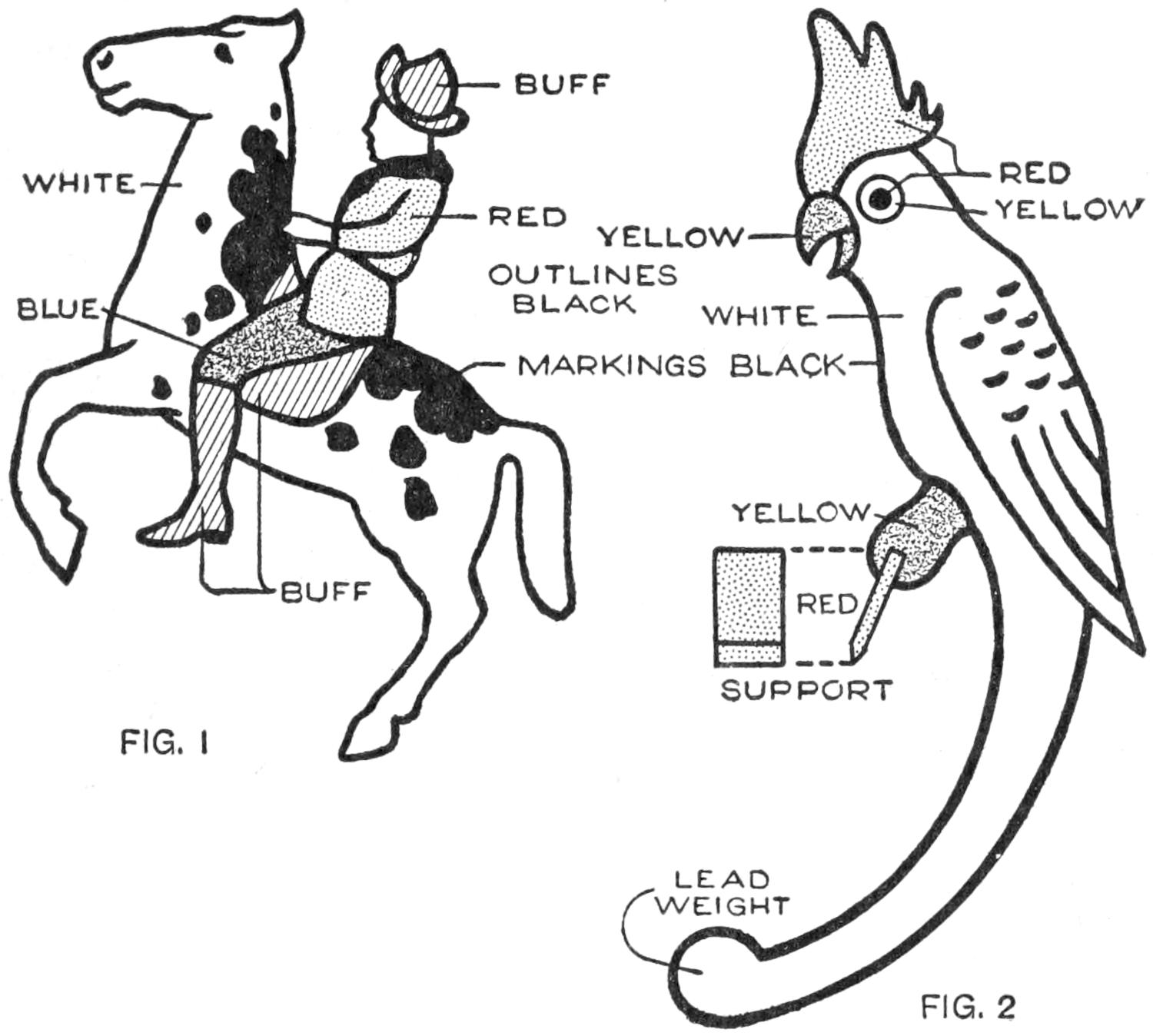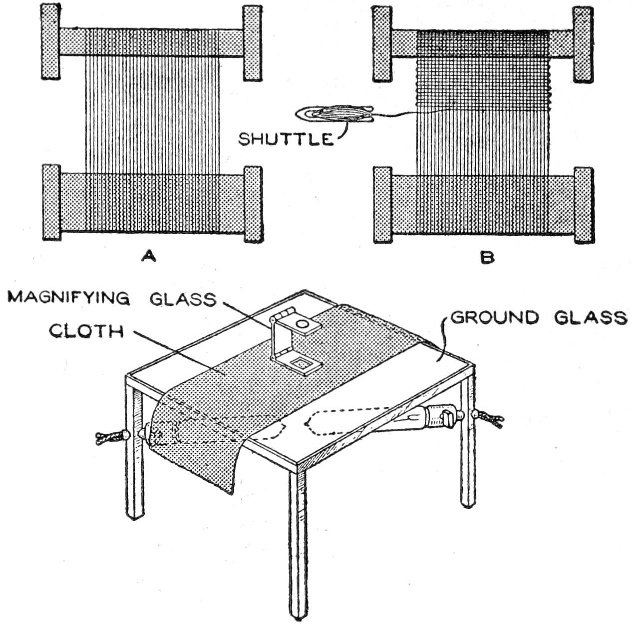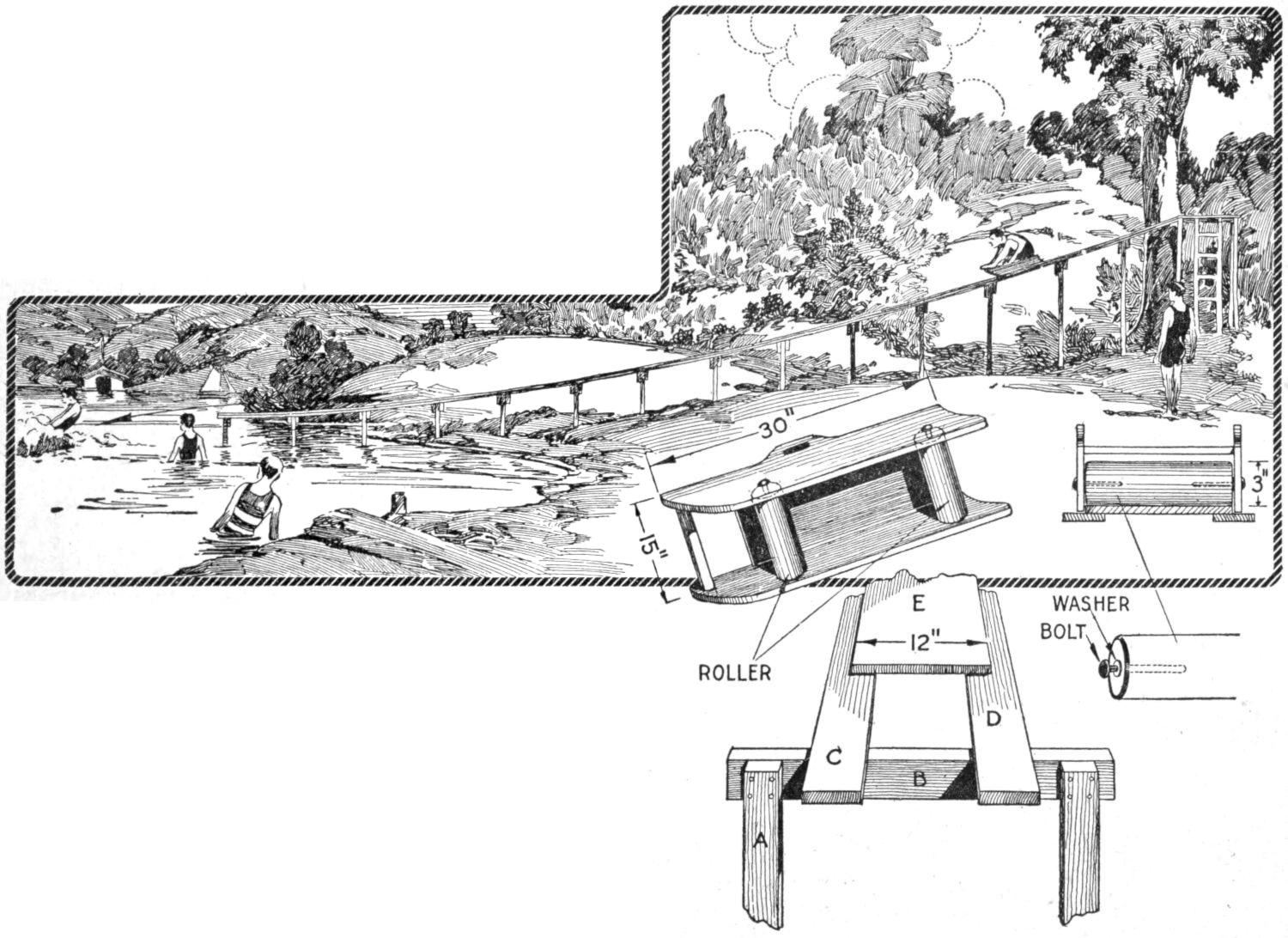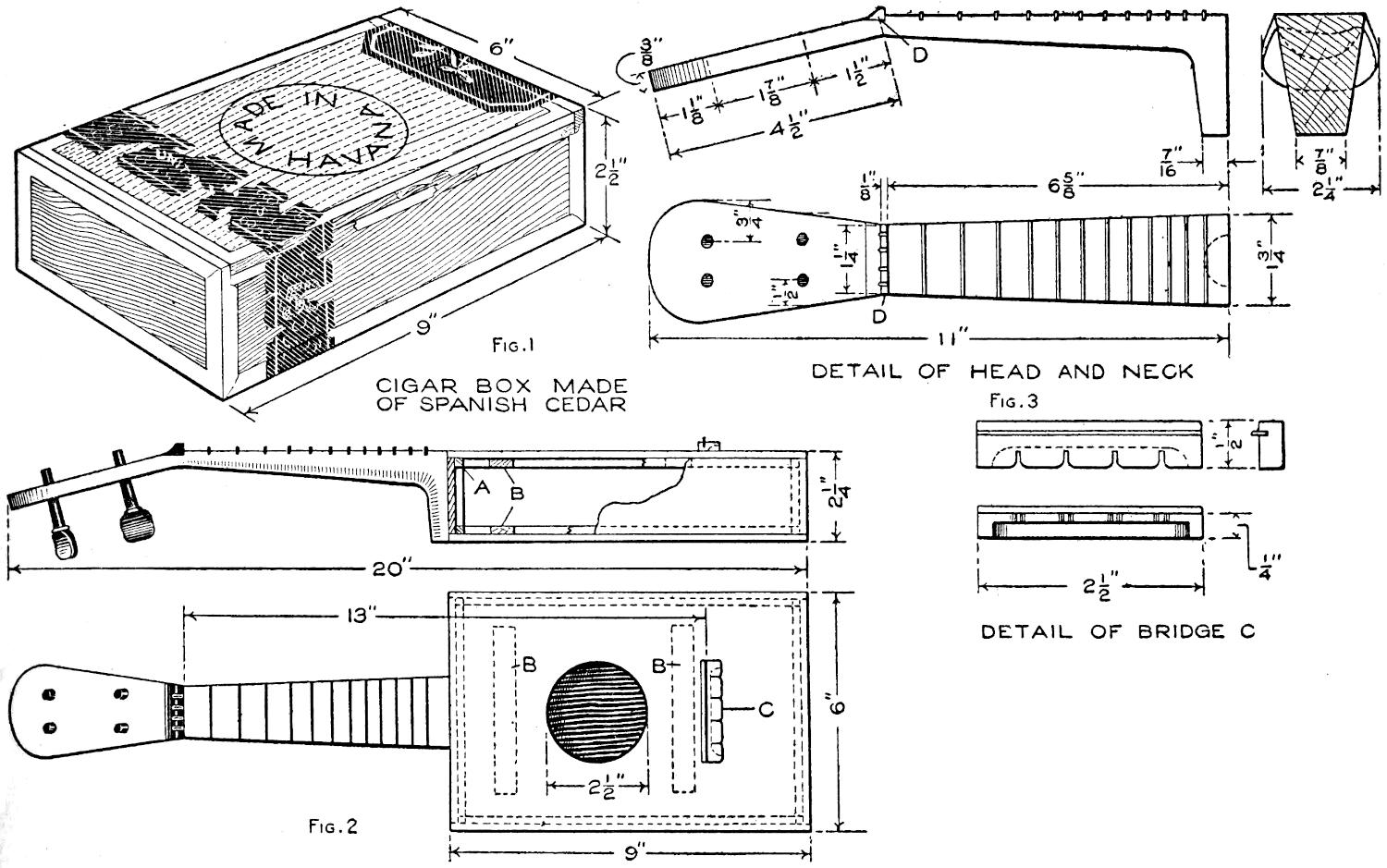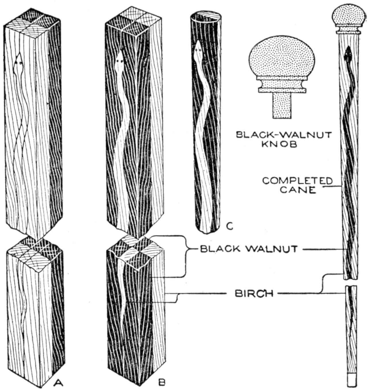 A toy alligator that opens its mouth and wags its tail as it is pulled along can be made of wood by a boy, with a jackknife. The various parts, as shown, are cut from soft wood, ¹⁄₂ in. thick. The method of fastening the parts is shown in the side sectional view. When the wheels turn, the cams A, set on the crank portions of the wheel axles, raise and lower the jaw and tail. The upper jaw is 1 in. wide at the widest part, and 3 in. long. The lower jaw is smaller, and the same length. The body is 6 in. long, and tapering in width from 1¹⁄₂ to ³⁄₄ in. The tail is 4³⁄₄ in. long, and ³⁄₄ in. wide. Holes are drilled in each piece near the edge, at joining points, through which wires are drawn, and clamped, as at B. The legs are shown in detail. They are attached to the body by drilling a ¹⁄₁₆-in. hole in each, and a hole through the body, through which the fastenings are passed. The lower end of the legs are fastened to the base, which is 3 by 9 in. long. Square holes, 1 in. wide, near each end, are provided for the cams A. The axles and wheels are made as shown. The axles fit tightly in the wheels, so that the latter can move the axles around with each turn. The axles are made from ¹⁄₈-in. wire, bent as shown, and should be long enough, after passing through the bottom, to extend through the wheels on each side.—Charles C. Wagner, Los Angeles, Calif.