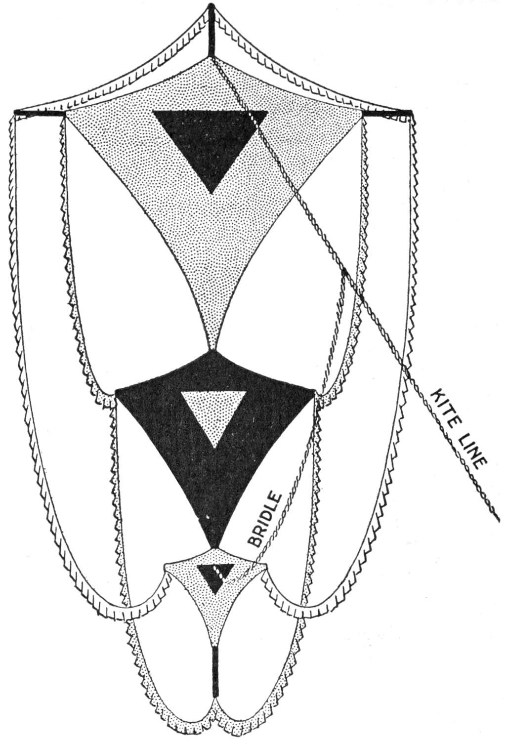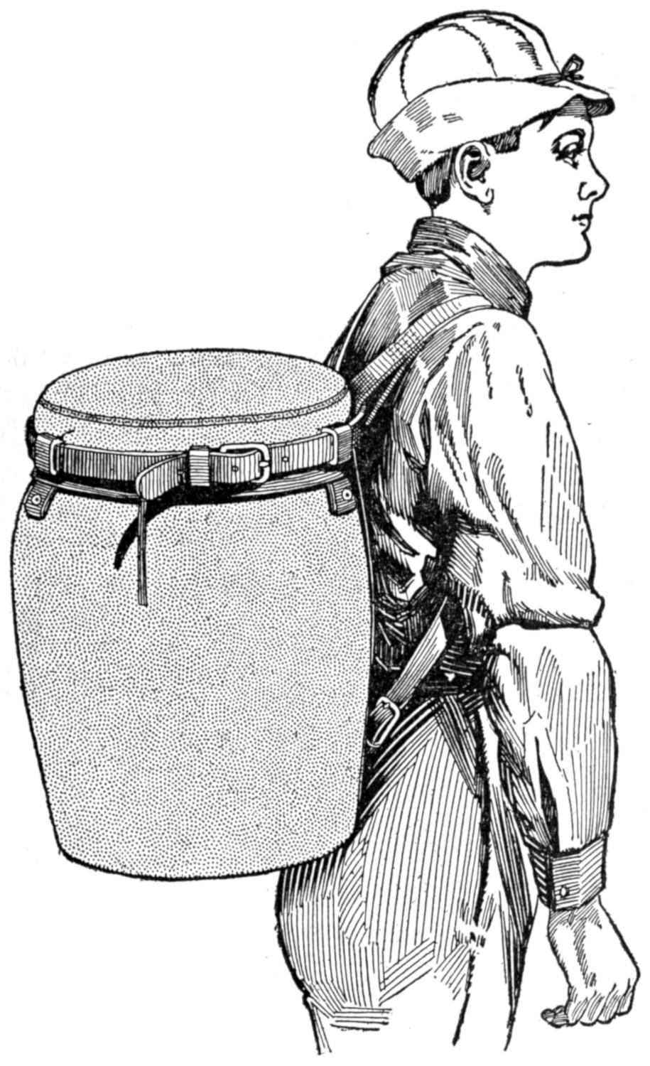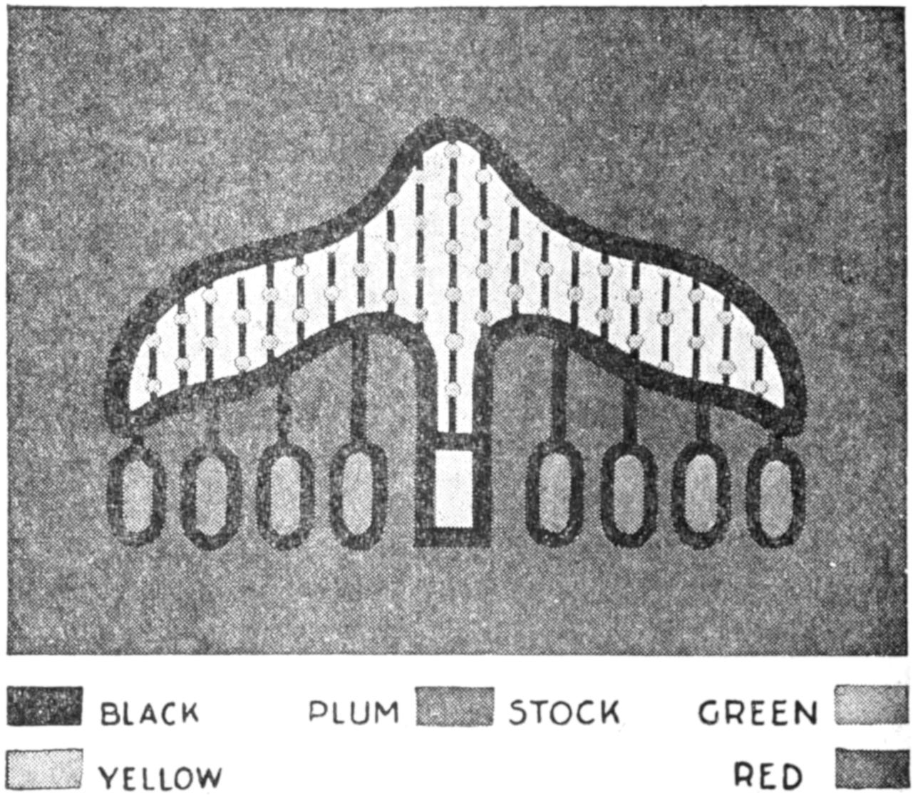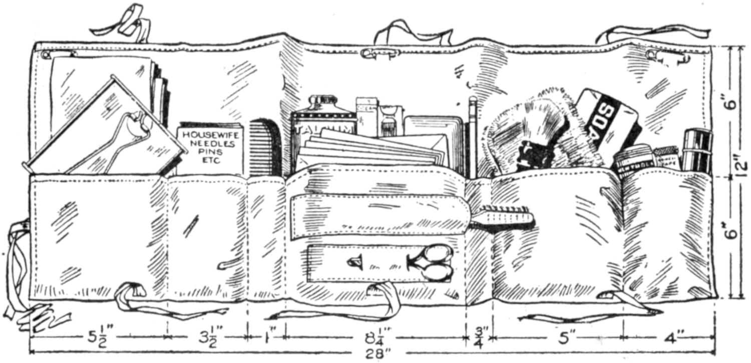 A soldier’s kit approved by a colonel of the national guard because of its compactness, can be made easily of a band of khaki cloth. The kit, including the “housewife,” requires cloth, 27 in. wide. Cut 12 in. from one end for the housewife, which is 12 by 5 in. wide. To make the housewife, fold under the edges ¹⁄₄ in., and fold one end over 2¹⁄₂ in. and the other 1¹⁄₂ in. for pockets. In the larger center pocket can be placed court plaster, adhesive tape, photographs, letters, etc. Bind the edges ¹⁄₄ in., and form other pockets, as shown. The entire kit weighs 1¹⁄₄ lb. and can be carried by the soldier in his army blanket. The housewife, if necessary, can be removed and taken to the firing line. Handy articles to be fitted in the kit are mirror that can be hung up, comb, box of talcum powder, cold cream, tooth paste, pencil, wash cloth, soaps, shaving brush, toothbrush, and scissors. Three safety pins at the top of the bag enable it to be hung up in the tent. Strong binding tapes are sewed to the bag, and it can be folded handily in three sections.—Kate Thomen, Topeka, Kans.