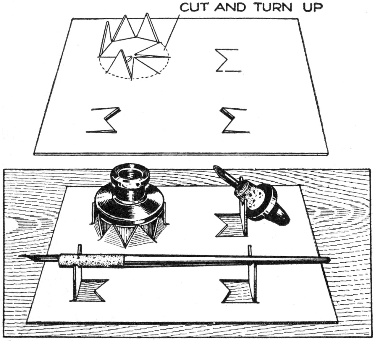 A stove lighter for gasoline or similar stoves can be made quickly. Cut a piece of tin, 7 in. long and 1 in. wide. Place a lamp, wick on the tin so that a part of it projects from the end of the tin. Fold the tin so that the wick is held, but so that it can be drawn out when needed. Saturate the wick in kerosene, or other thicker oil. When wishing to light one or more burners of the stove, light the wick and apply it to the burners. The stove can be lighted with less danger of burning the hands than when a match is used directly.—Lee M. Delzell, Maroa, Ill.
