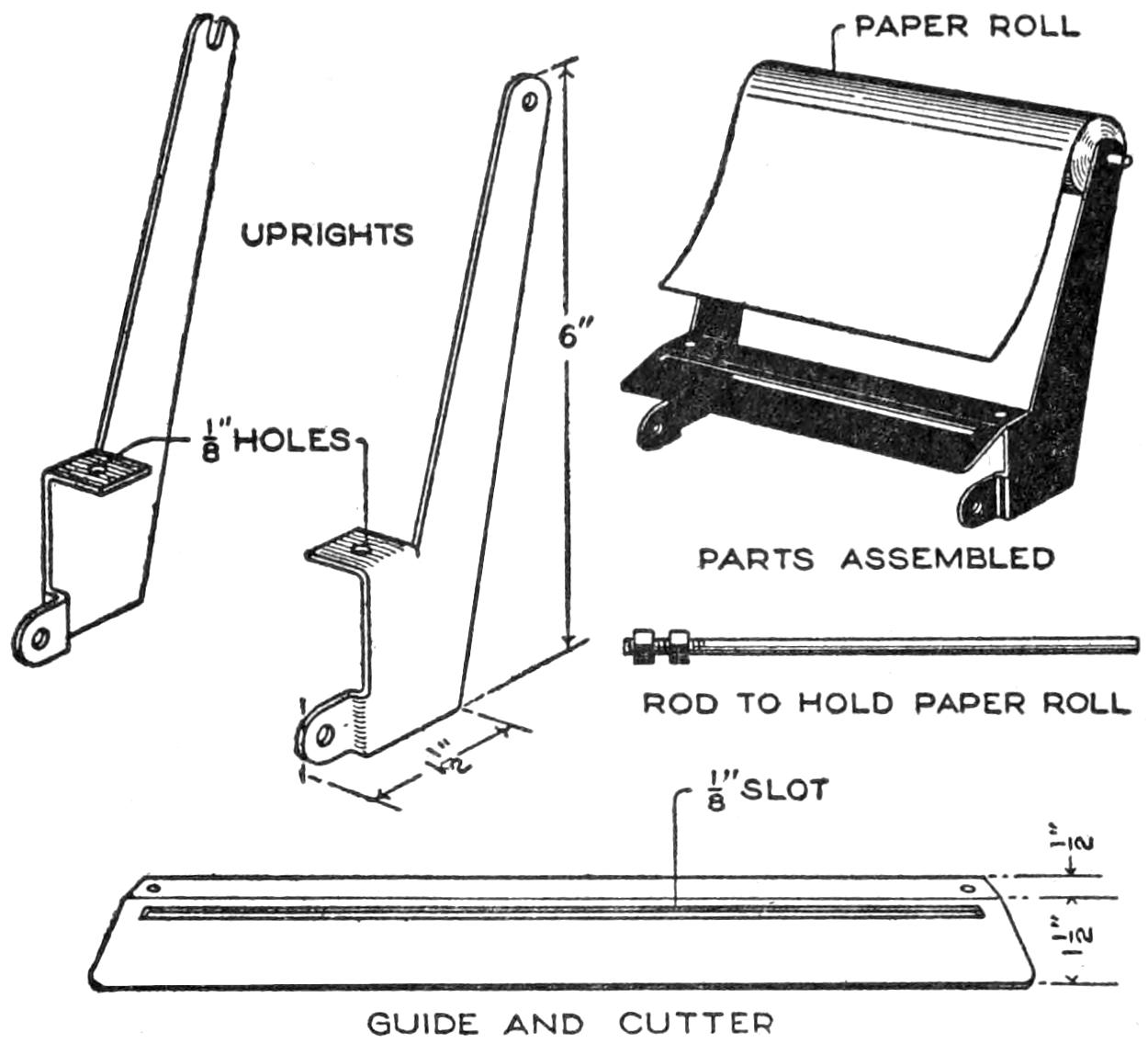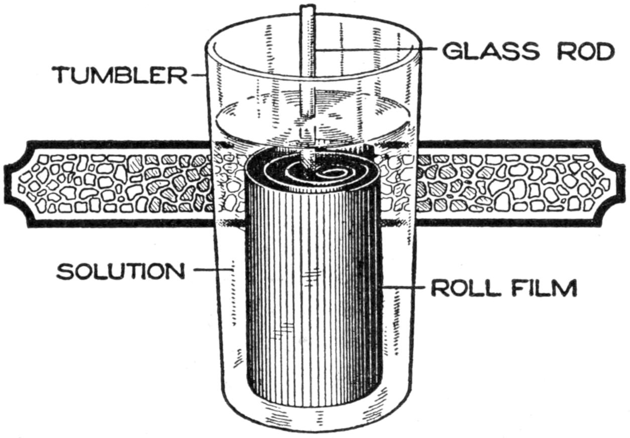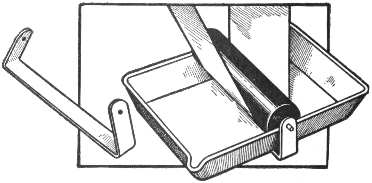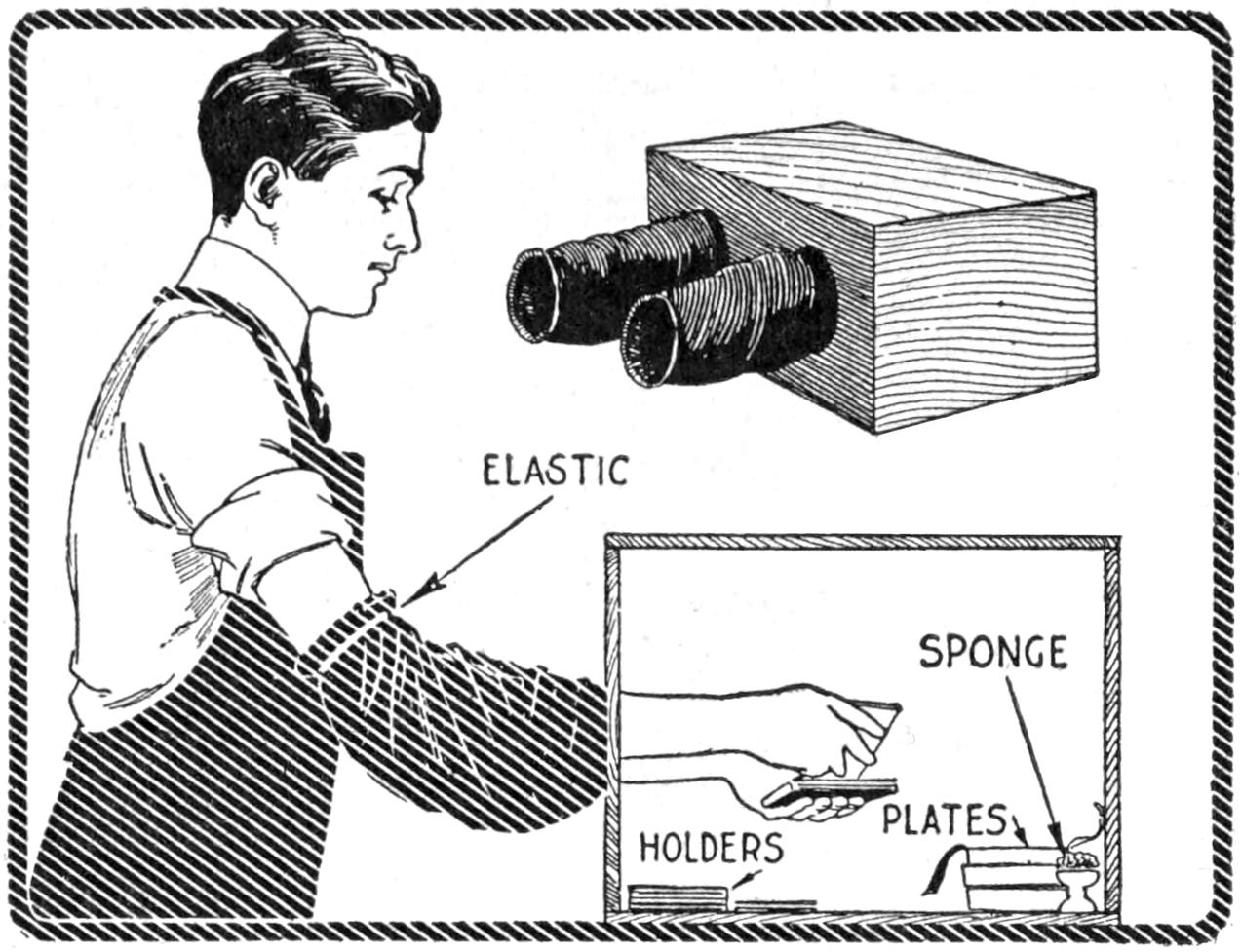 The amateur photographer who uses roll film and who does his developing by the tray method, will find this device a simple and reliable means for holding the film spool while removing the film, duplex paper, autographic carbon paper, gummed labels, etc. Once the spool is properly placed in the holder, there is little danger of its dropping. The holder takes various sizes of film spools. The side fingers are ³⁄₁₆ by ³⁄₄ by 23 in. long. A small peg is set in each finger, 1¹⁄₈ in. from the end, to engage the spool. The upper ends of the fingers are nailed to a tapered block of wood, ⁷⁄₈ by 3¹⁄₄ and 2¹⁄₂ in. wide, and 8 in. long. The holder can be conveniently fastened to a wall, door casing, or to the under side of a shelf in the dark room.—John Hoeck, Alameda, Calif.