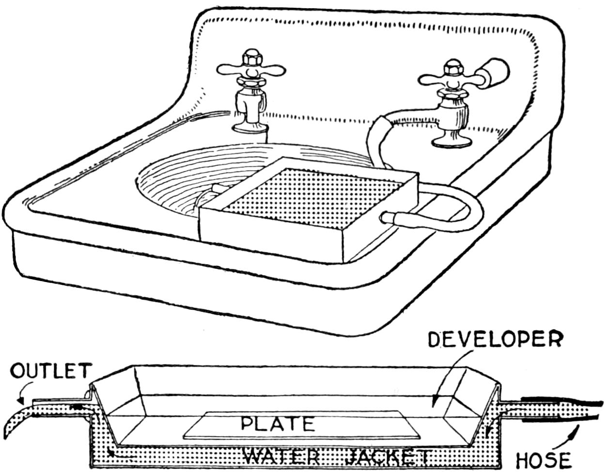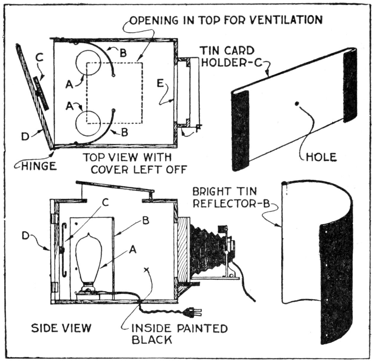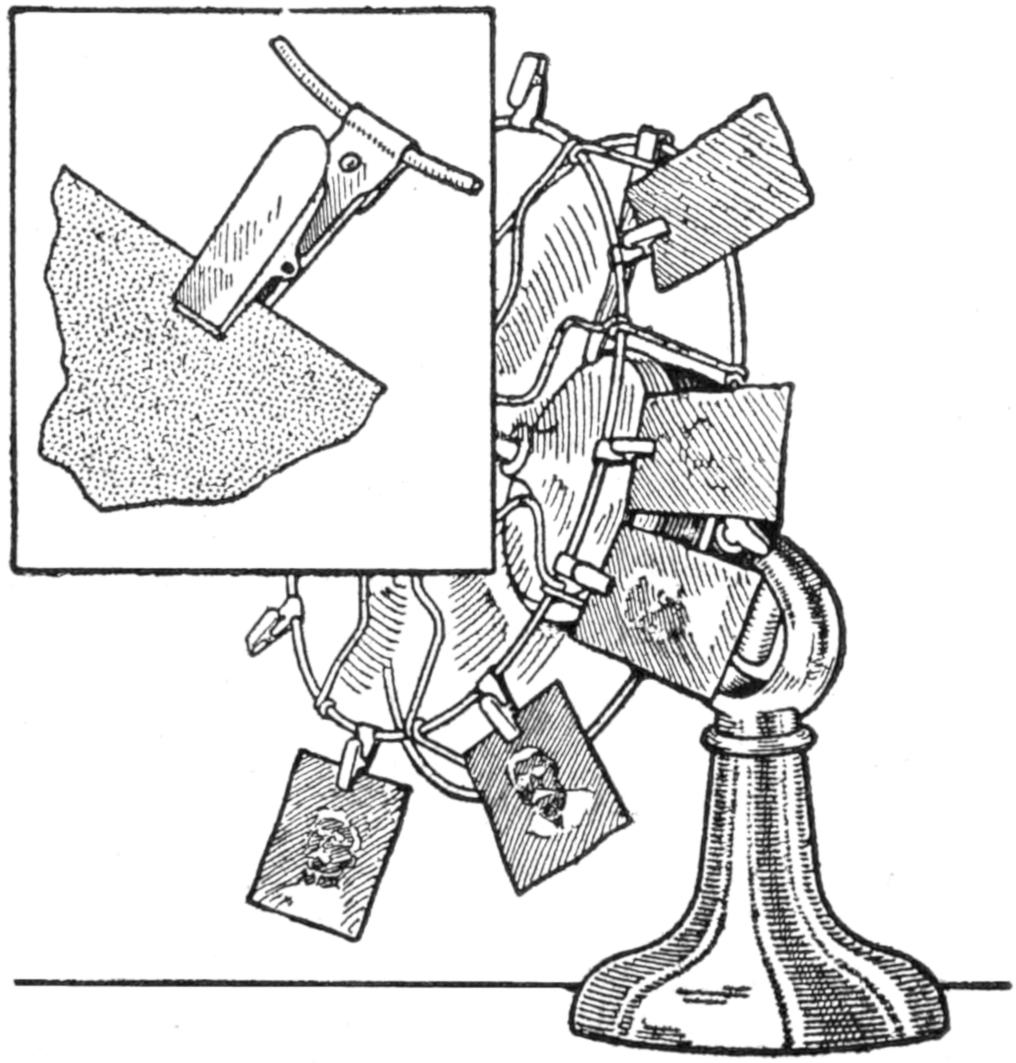 The amateur photographer who uses roll film and who does his developing by the tray method, will find this device a simple and reliable means for holding the film spool while removing the film, duplex paper, autographic carbon paper, gummed labels, etc. Once the spool is properly placed in the holder, there is little danger of its dropping. The holder takes various sizes of film spools. The side fingers are ³⁄₁₆ by ³⁄₄ by 23 in. long. A small peg is set in each finger, 1¹⁄₈ in. from the end, to engage the spool. The upper ends of the fingers are nailed to a tapered block of wood, ⁷⁄₈ by 3¹⁄₄ and 2¹⁄₂ in. wide, and 8 in. long. The holder can be conveniently fastened to a wall, door casing, or to the under side of a shelf in the dark room.—John Hoeck, Alameda, Calif.