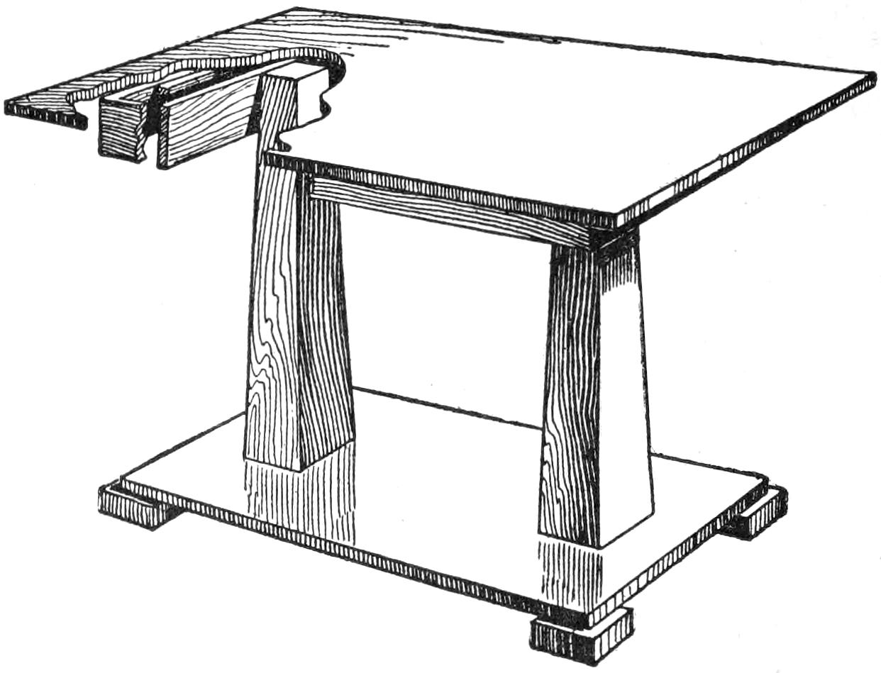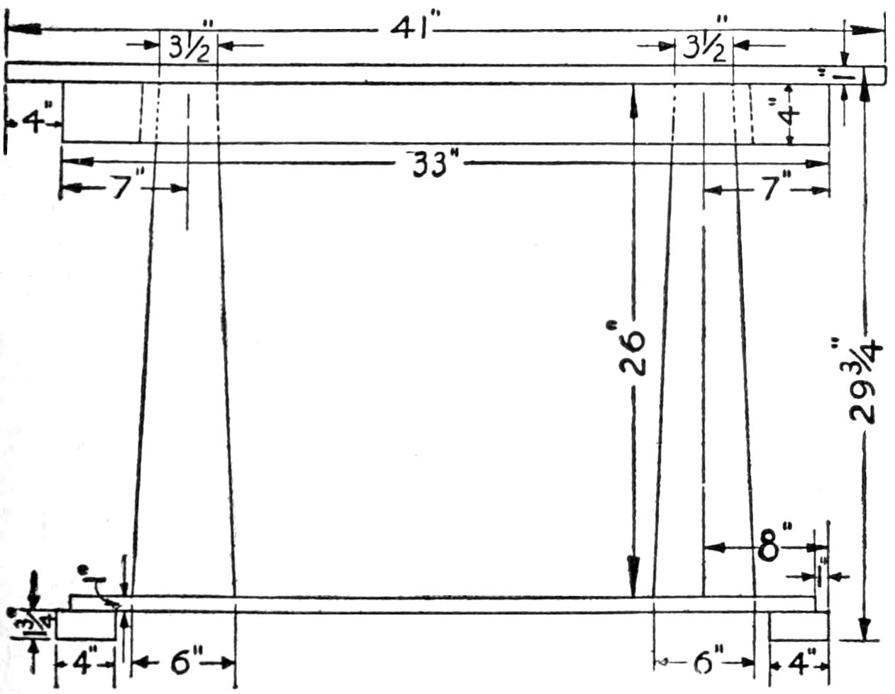 Begin the construction by gluing up the pieces for the top and the shelf. While they are drying, make the pieces for the legs, the lower braces, and the strips for the edging of the top. The upper portion of the legs is of double thickness, ⁷⁄₈-in. stock being used throughout. Fit the lower supporting framework together as shown in the bottom view of the shelf, two of the braces extending across the bottom and the others butting against them.