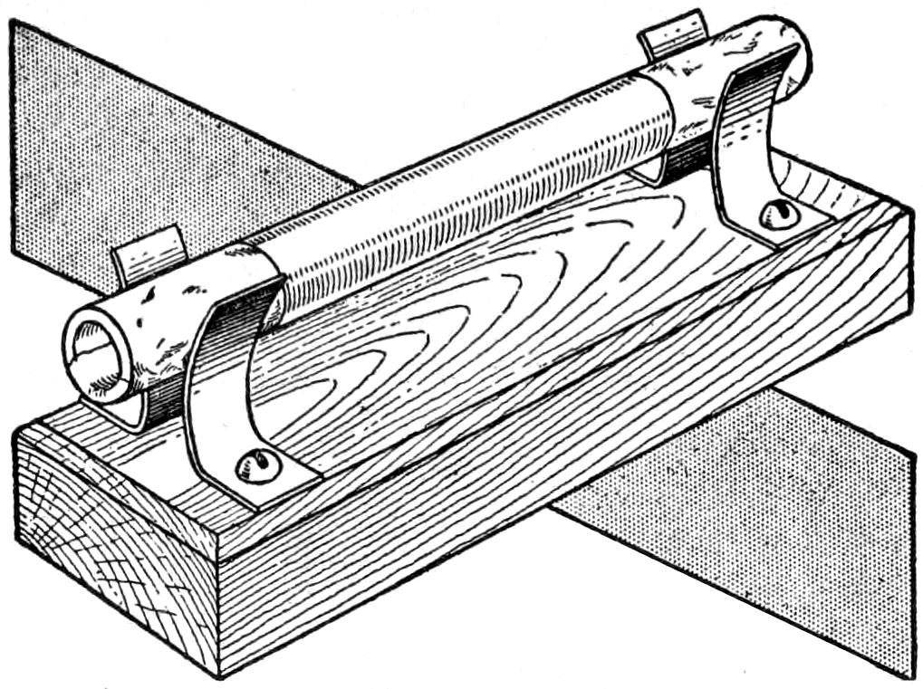 Footgear is injured when not properly dried out after use in water or in rough weather, and to care for the shoes, rubbers, etc., I made a rack fitted behind a stove on which they are dried out quickly and thoroughly. The rack consists of a row of brackets made of strap iron, bent as shown in the sketch, and the shoes are slipped on them. The brackets are mounted on a strip of wood, which is fastened to the wall with screws. A thin piece of board or sheet metal protects the wall.—Edgar Morgan, Robbinsdale, Minn.