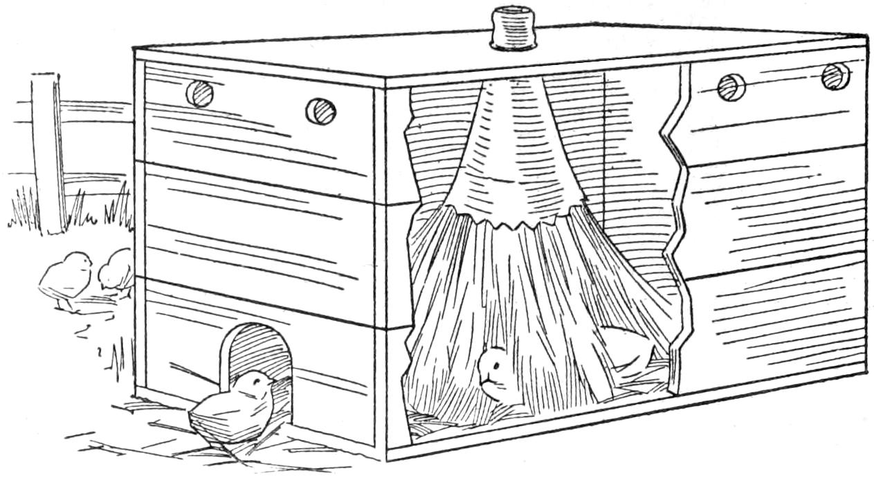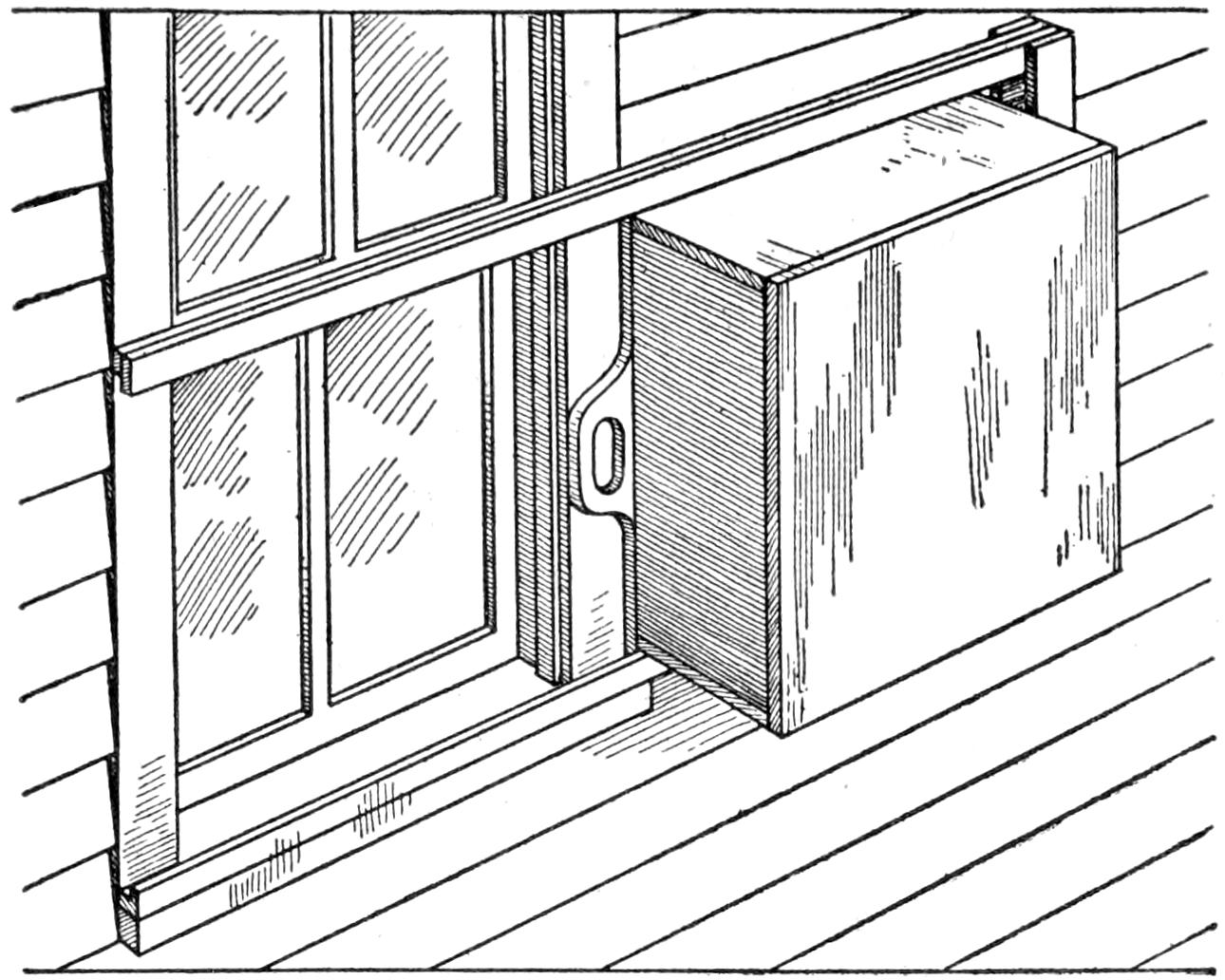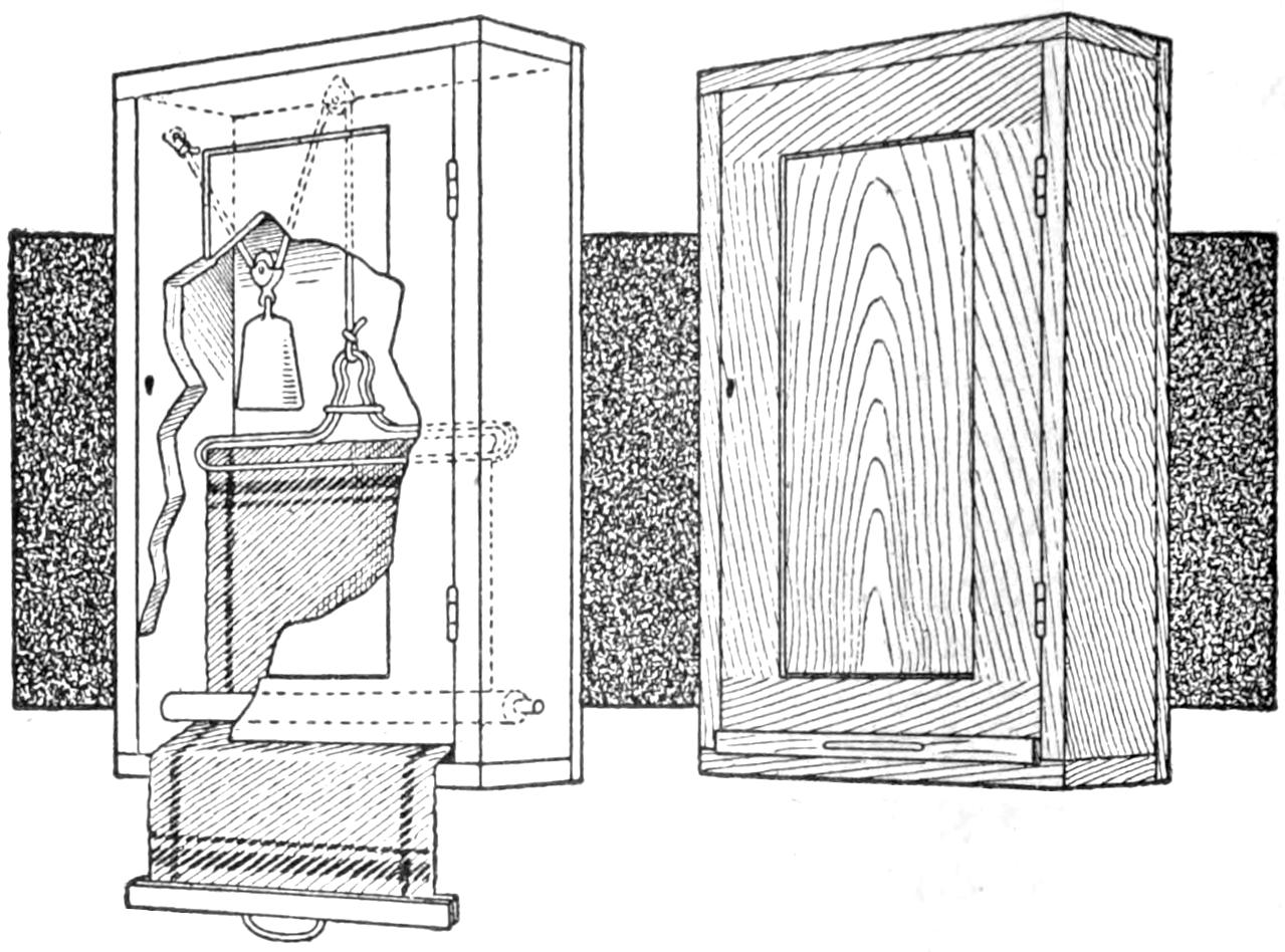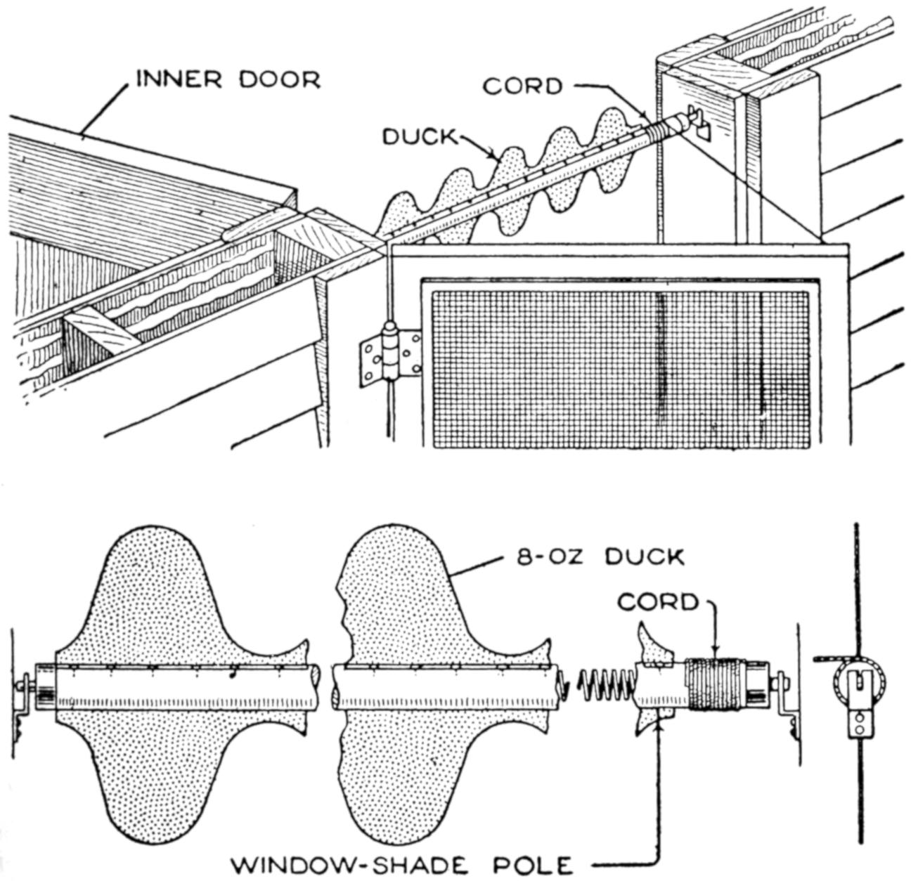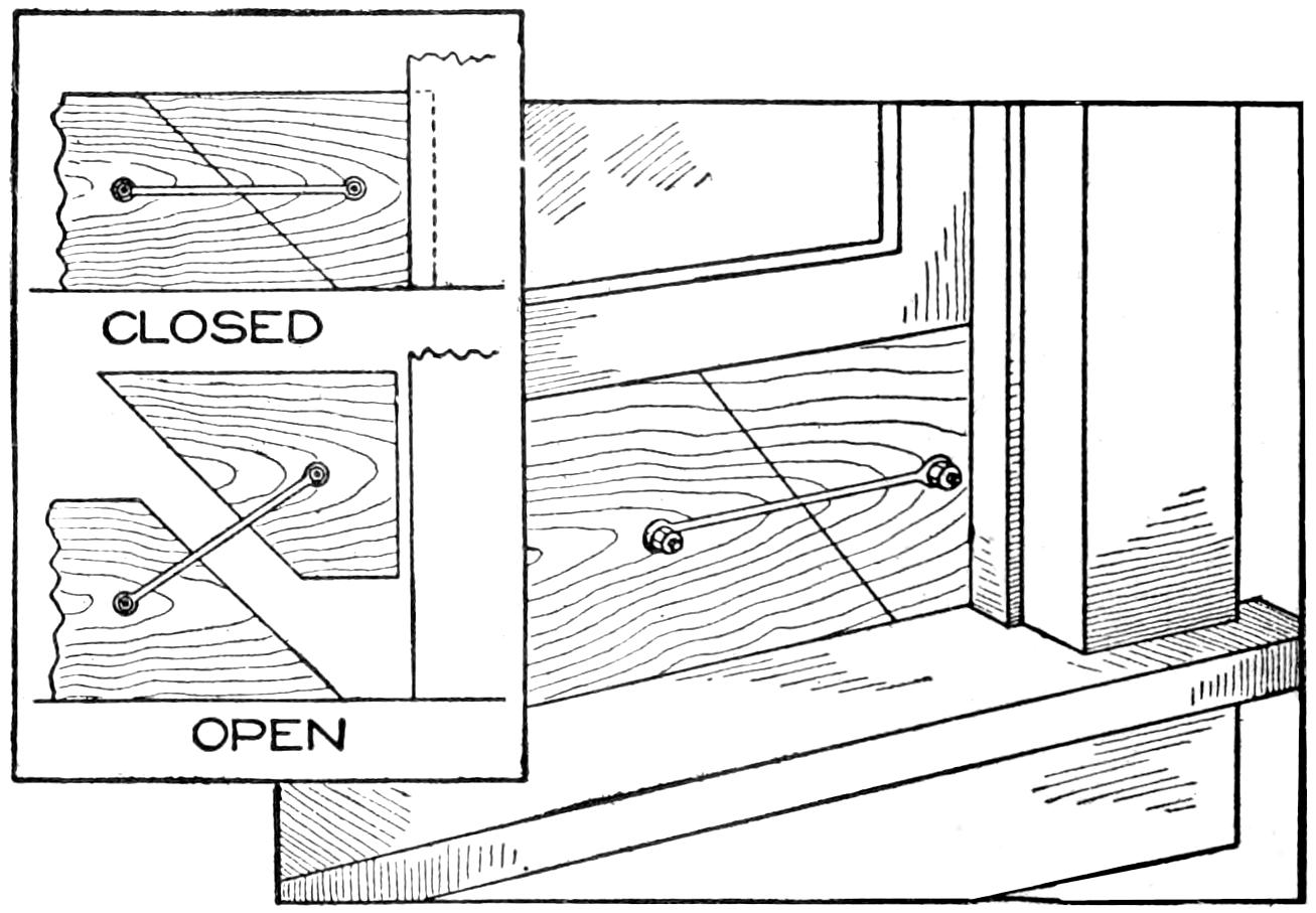 Those in the habit of shutting their poultry houses at night to prevent disturbance or loss by night-prowling animals, will be interested in a contrivance that makes this unnecessary. The principle of the mechanism, as illustrated is that the opening to the poultry house is closed after the fowls have gone to roost, and in the morning when they descend from the roost, the door automatically opens, and they are free to go out. The spring door opens inside with hinges at the side, and a suitable bumper. The spring has just sufficient tension to cause the door to open when the catch is released.