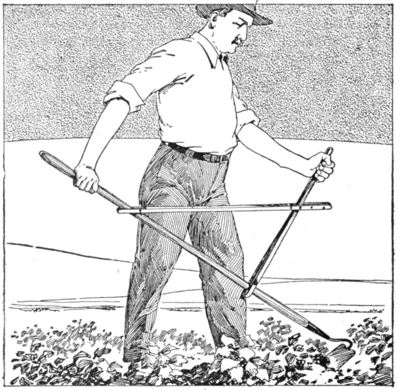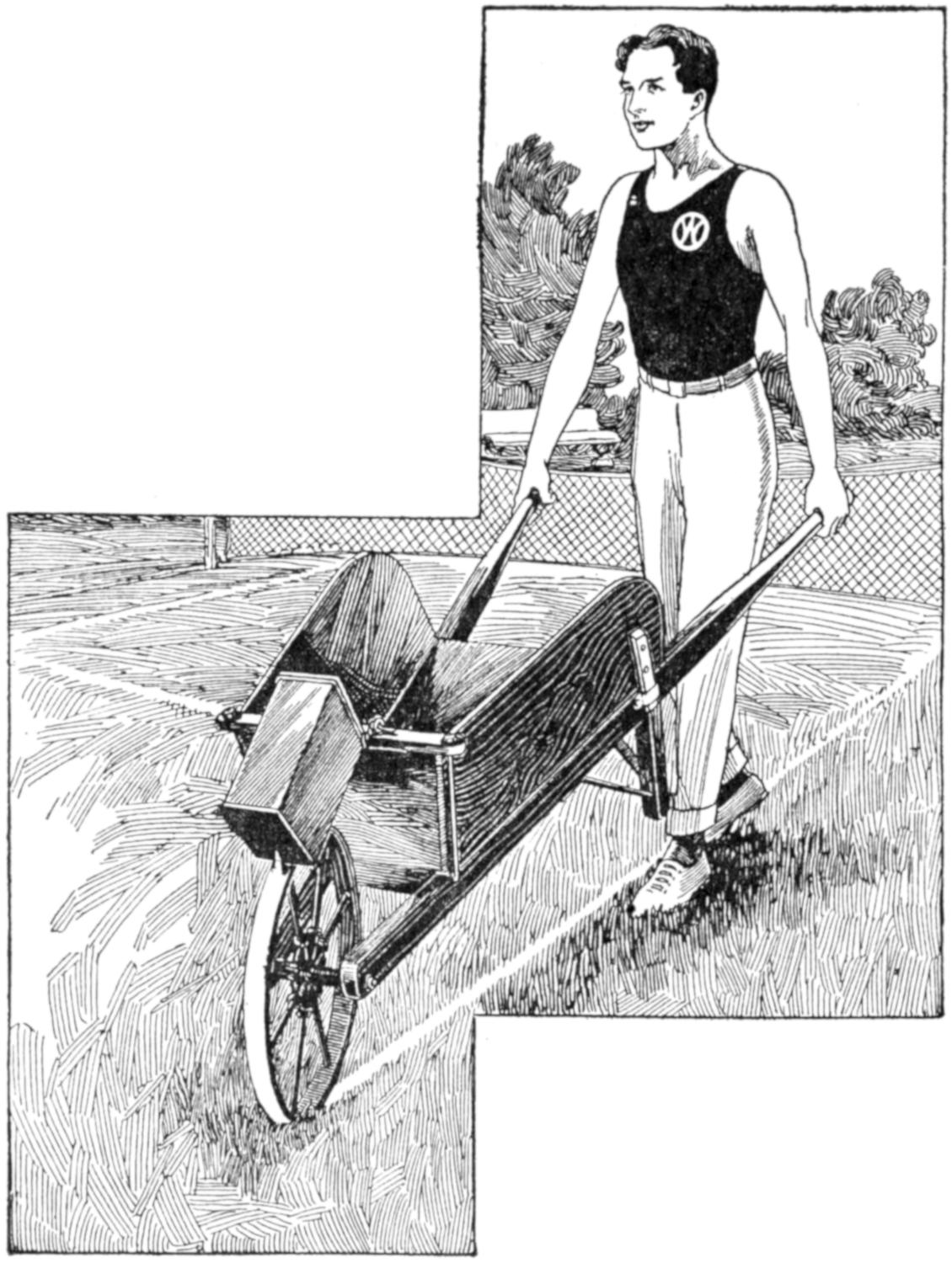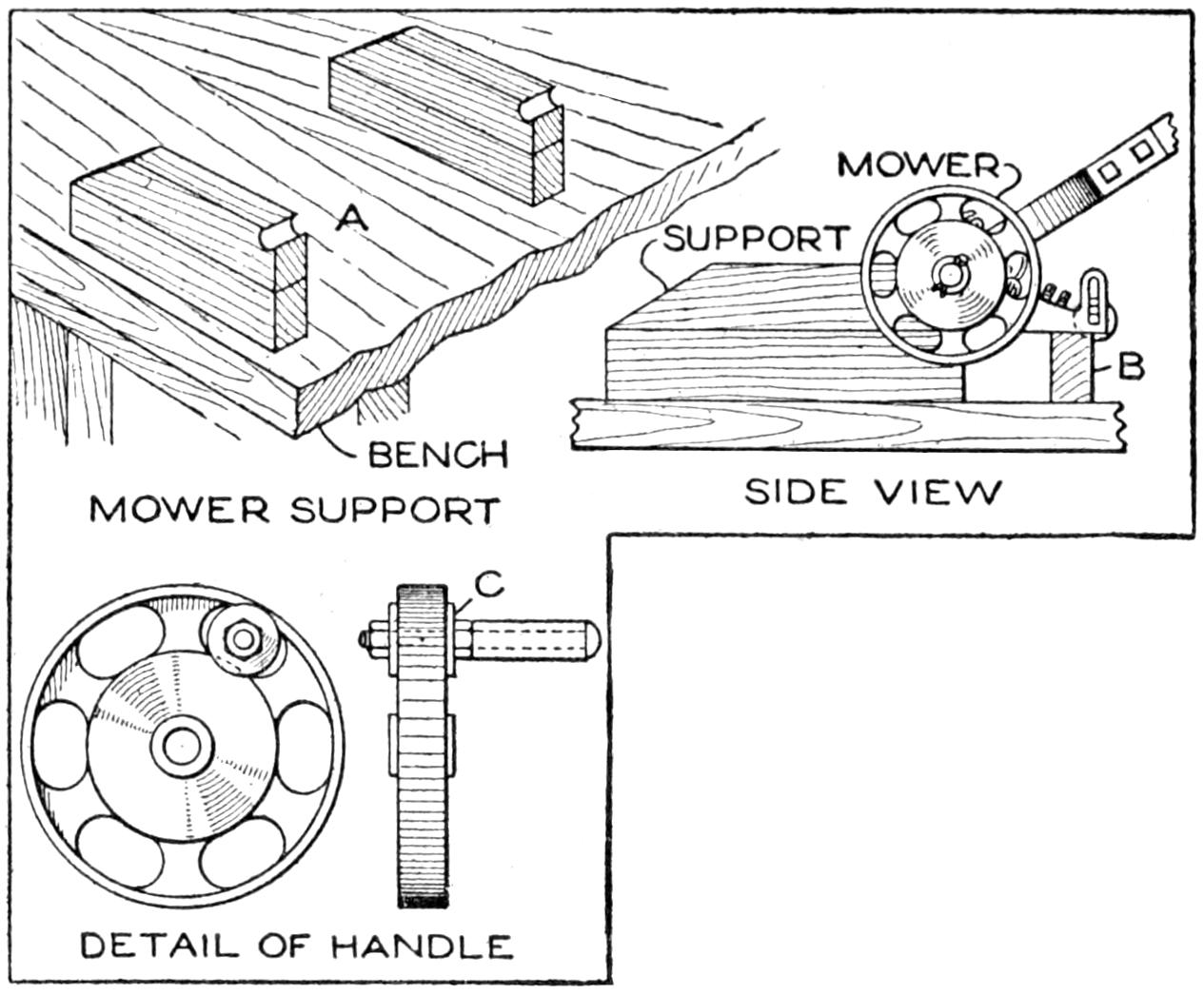 With this device, one can quickly sharpen the lawn mower, or perhaps earn money sharpening the neighbors’ machines. Because several knives in a lawn mower work against the cutting blade, it is difficult to sharpen a mower satisfactorily with a file or stone. A usual method is to reverse the cutting-wheel cogs, turn the mower upside down, and run it backward over the ground. By the use of grinding paste on the cutting blade the cutting wheel tends to sharpen itself. This process can be improved by supporting the mower, as shown at A, the blocks permitting the mower’s driving wheels to rest outside them. A block, B, supports the wooden roller. Remove the driving wheels, and the gears which turn the cutting wheel. Take the gear from one end and put it in the other end, replacing the driving wheel. By revolving the latter backward, the cutting wheel will also turn backward. Apply a paste of emery powder and lubricating oil to the cutting blade, and adjust the blade so that it comes fairly into contact with the cutting wheel. Turn the driving wheel backward, and gradually tighten the adjustment until a good edge on the cutting blade and the knives is produced.