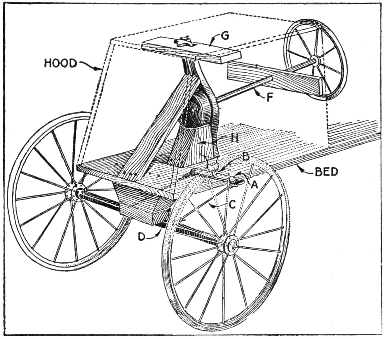 The lighting arrangement may next be installed, gas or electric lamps, run on batteries, being used. Mudguards are desirable if the car is to be used on muddy roads. Strong bicycle mudguards can be installed, the guard braces being bolted on the axles. A strong pipe, with a drawbolt passing through its length, is mounted across the front of the frame. The body is built of ⁷⁄₈-in. stock, preferably white wood, and is 2 ft. 4 in. wide. A priming coat should be applied to the woodwork, followed by two coats of the body color, and one or two coats of varnish. The metal parts, except at the working surfaces, may be painted, or enameled.