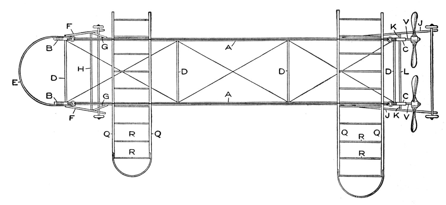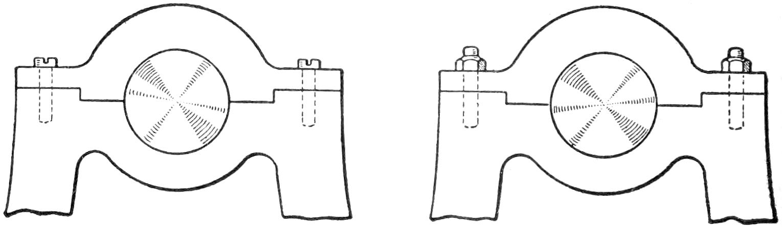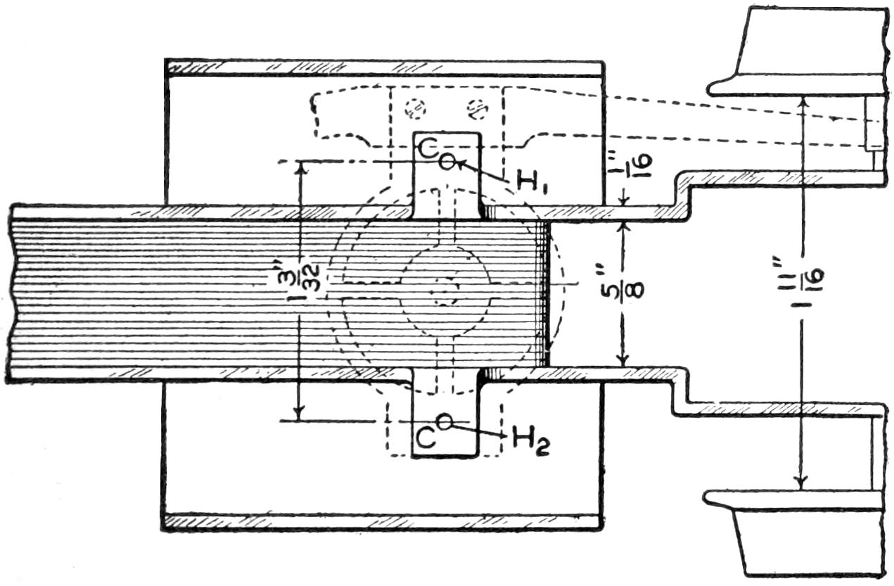 The engine is set so that the crankshaft extends across the main frame. Other methods may be devised for special motors, and the power transmission changed correspondingly. One end of the crankshaft is extended beyond the right side of the frame, as shown in Fig. 3. This extension is connected to the shaft by means of an ordinary setscrew collar coupling. A block M, Figs. 3 and 7, is bolted to the frame, and a section of heavy brass pipe fitted as a bearing.