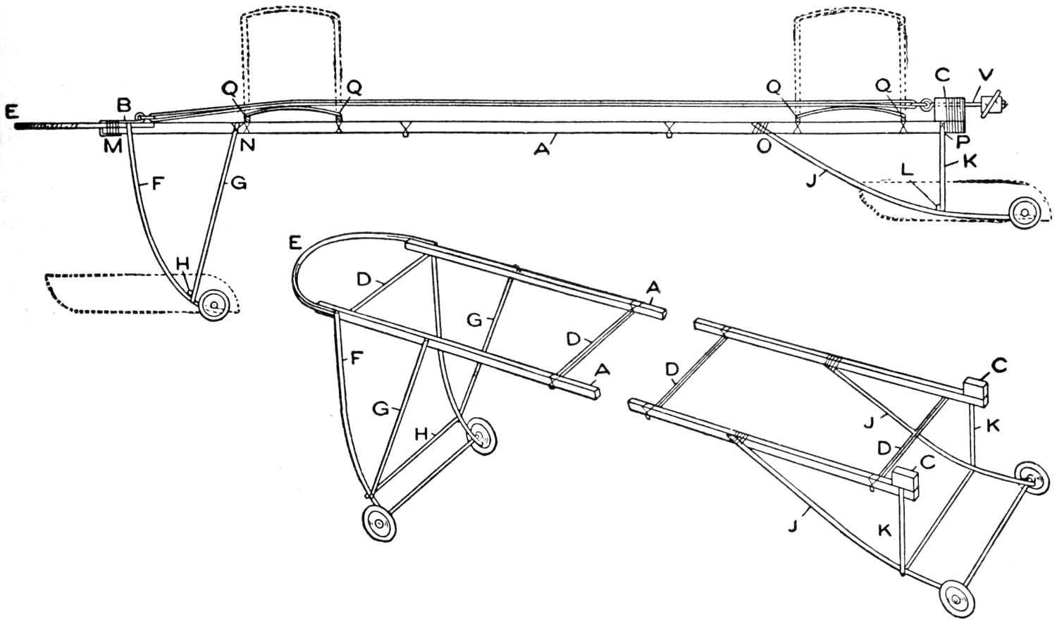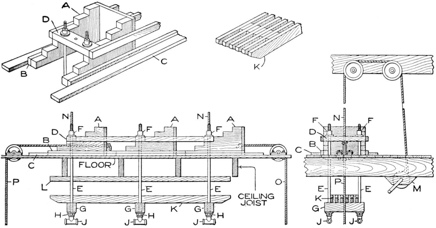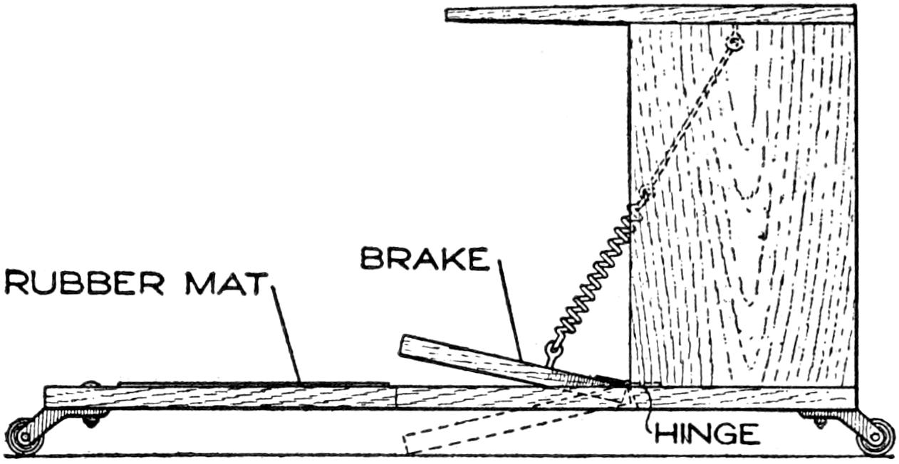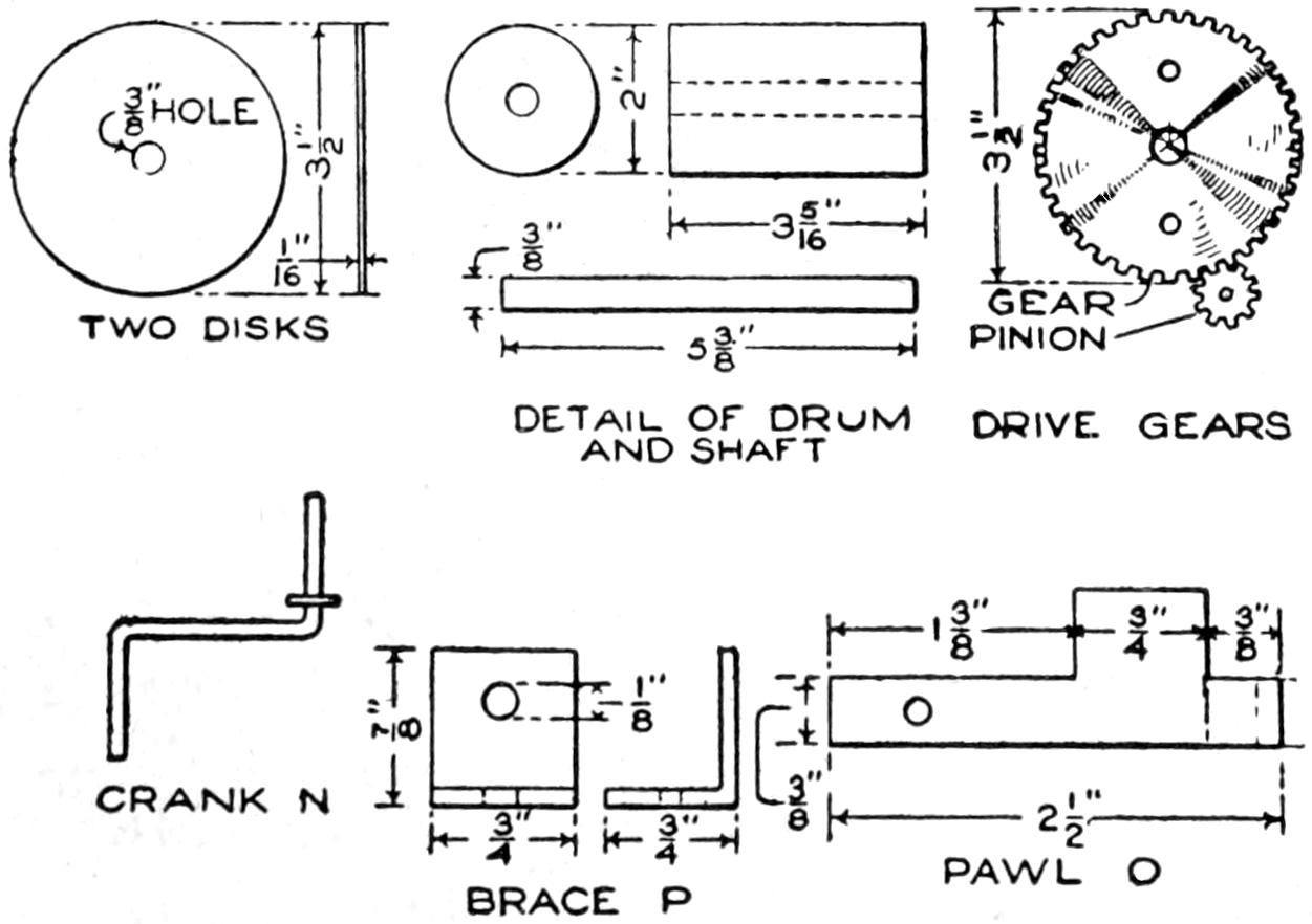 The brake is shown in Figs. 1 and 3, and detailed in Figs. 4 and 9. The fittings on the rear wheel and axle are made of wood, and bolted, with a tension spring, as shown. The brake drum is supported on iron bands, riveted to the wheel, and to the pulley rim. The brake arm is connected to the brake wheel by a flexible wire. When the pedal is forced down, the wire is wound on the brake wheel, thus permitting of adjustment. The pedal is of iron and fixed on its shaft with a setscrew. An iron pipe is used as a casing for the central shaft, the shaft carrying the clutch lever, and the pipe carrying the brake pedal and the brake wheel. The quadrant O is mounted on a block, fastened to the main frame. The central shaft is carried in wooden blocks, with iron caps. A catch of strap iron can be fitted on the floor, to engage the pedal, and lock the brake when desired.