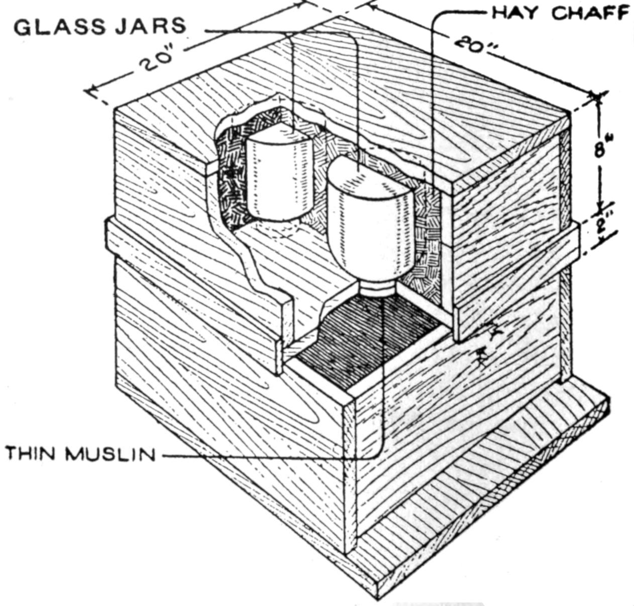 It is not always necessary to keep milk and butter, or other foodstuffs, in refrigerator temperature to preserve hem, for 50 or 60° will often serve quite as well where the articles are to be consumed within a short time. To accomplish this slight degree of cooling, wrap a moist linen cloth, single thickness, snugly about the dish or package, and place it in a shallow pan of water, in an open window, out of the sun. The brick of butter should be placed on a support to hold it out of the water. The cooling is due to evaporation from the moist cloth. Not infrequently on a warm summer day, a thermometer with a bulb, wetted as suggested, will be 20° cooler in a breeze, than a dry-bulb thermometer.