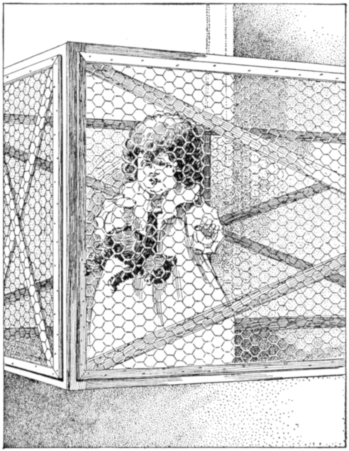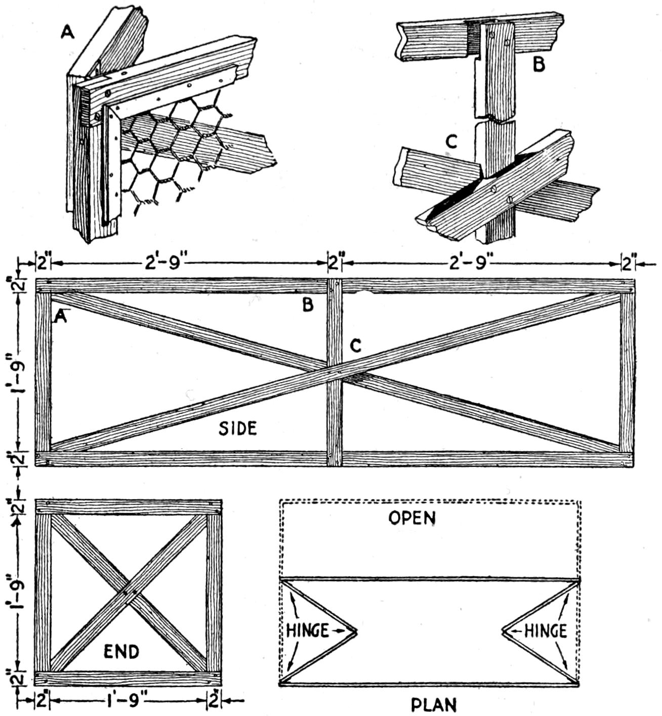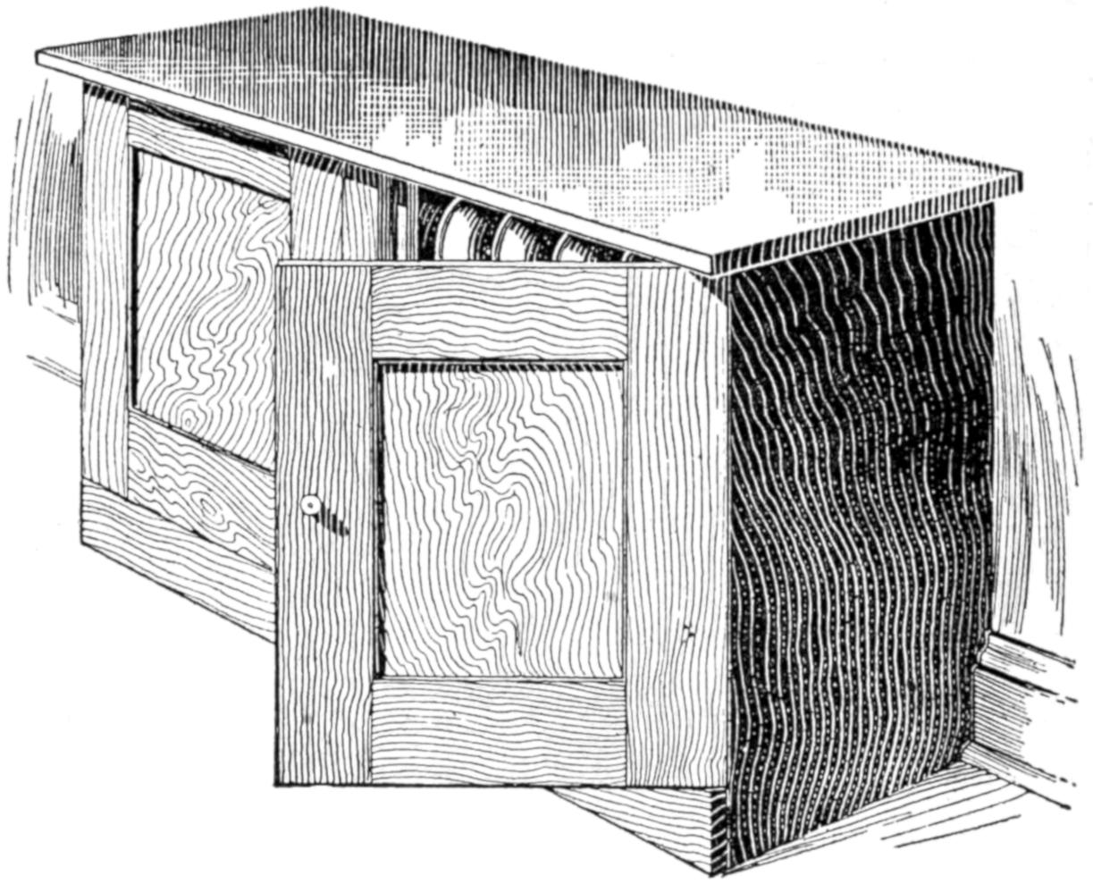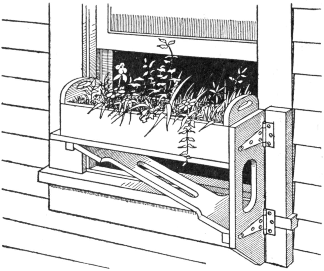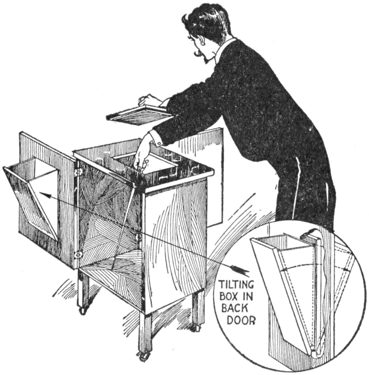 Poultry raisers find a trap nest useful, and one can be made quickly by fitting an old packing box with a suitable sliding gate. In the arrangement shown, the gate is raised slightly as the hen enters the nest box, releasing the spring and causing the gate to drop.[456] The gate and spring can be adjusted to various-sized breeds of poultry. The two grooved uprights can be cut from flooring and the other wooden parts made from laths or wooden strips. The trigger is made of wire.—A. J. Call, Hartsville, Mass.
