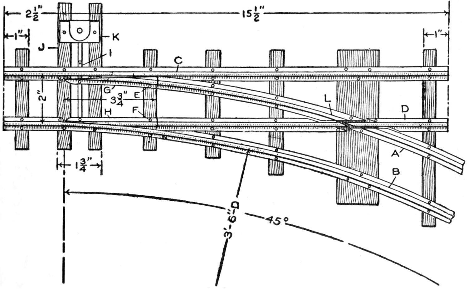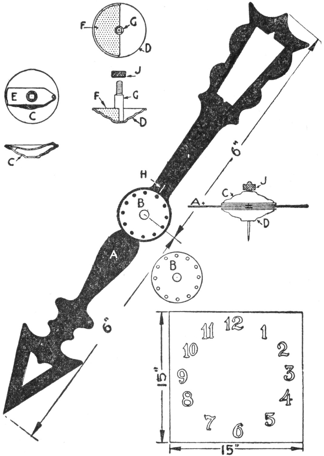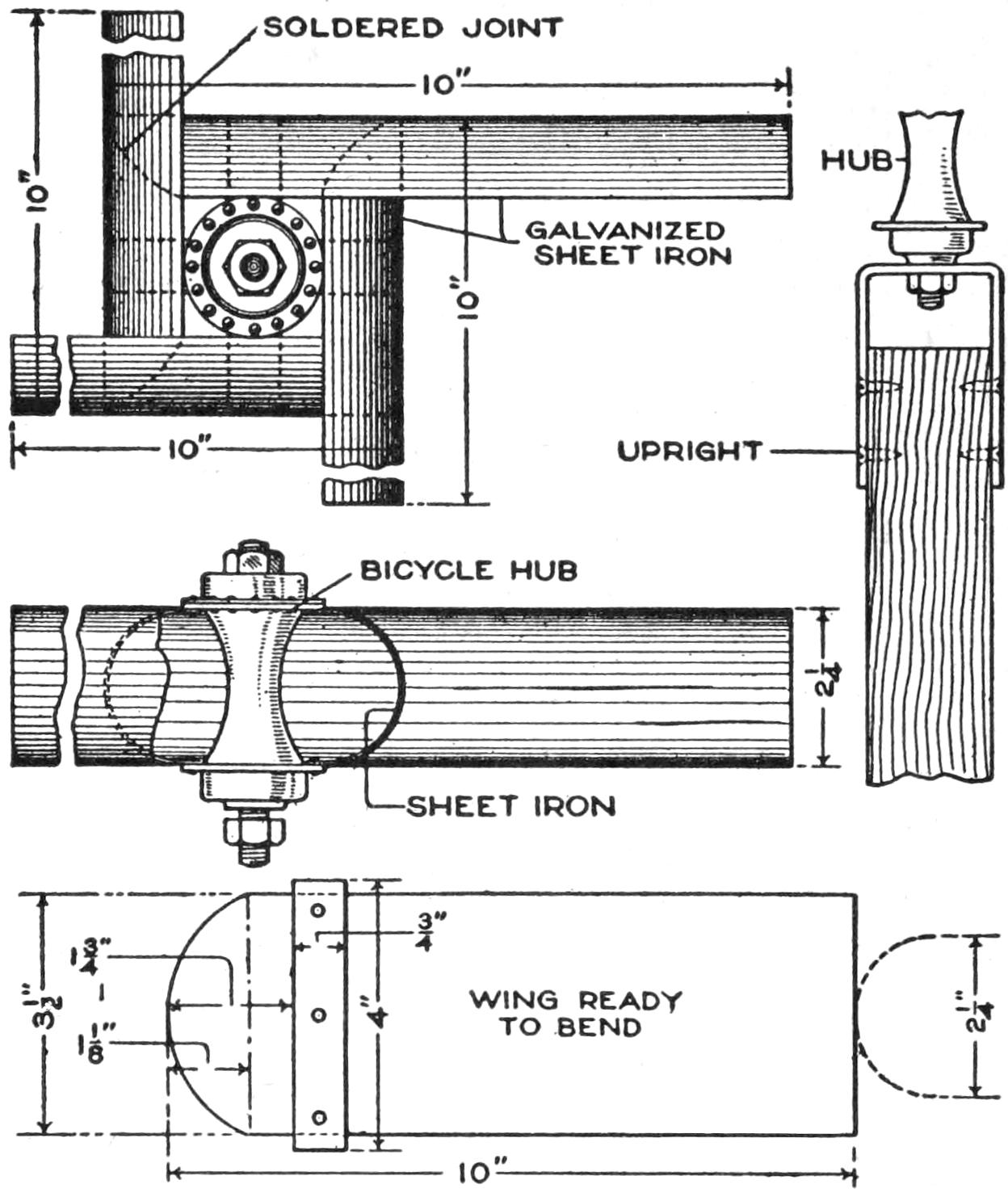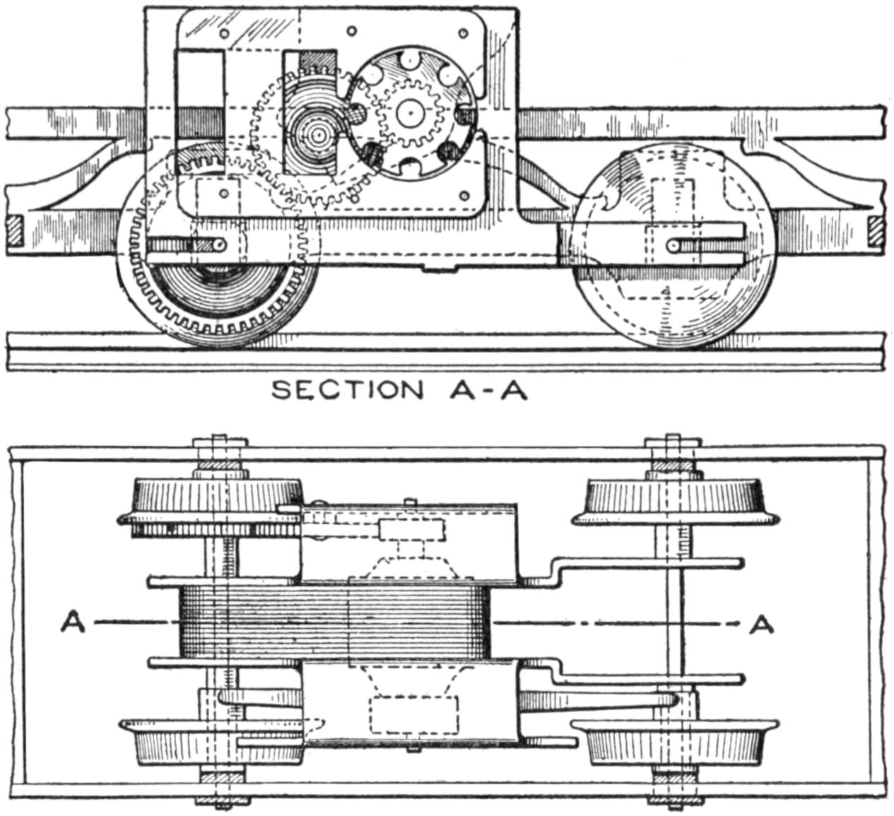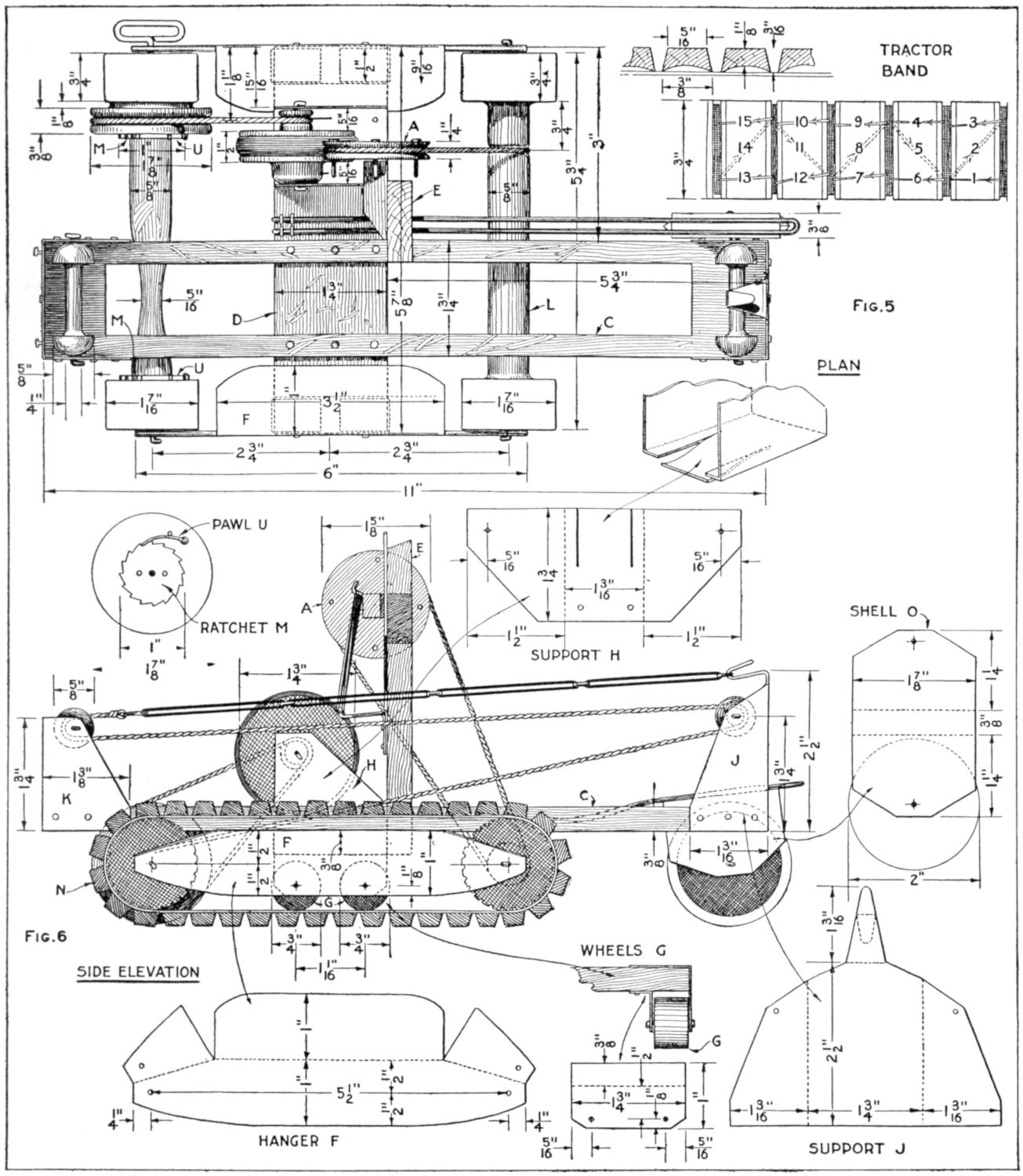 Finish only the supporting structure of the chassis in the preliminary woodwork. Set the front-axle and steering-rigging supports C and D, and adjust the spacers F between them. Bore the hole for the kingbolt, as detailed in Fig. 6, and fit the bevel gears and the fifth wheel G, of ¹⁄₄-in. steel, into place, as shown in Fig. 5. The gear H is bolted to the axle support. The[2] pinion J is set on the end of a short ³⁄₄-in. shaft. The latter passes through the support D, and is fitted with washers and jam nuts, solidly, yet with sufficient play. A bracket, K, of ¹⁄₄ by 1³⁄₄-in. strap iron, braces the shaft, as shown in Fig. 3. The end of this short shaft is joined to one section of the universal coupling, as shown, and, like the other half of the coupling, is pinned with a ³⁄₁₆-in. riveted pin. The pinion is also pinned, and the lower end of the kingbolt provided with a washer and nut, guarded by a cotter pin. Suitable gears can be procured from old machinery. A satisfactory set was obtained from an old differential of a well-known small car.