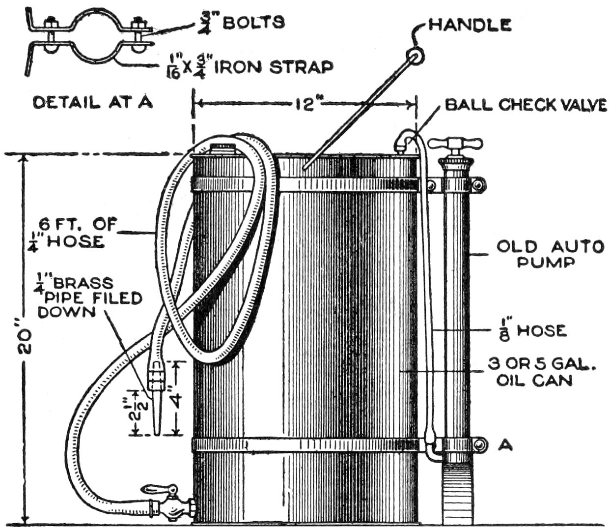 In setting the gasoline tank, make only as much of the body woodwork as is necessary to support it, as shown in Figs. 1, 3, and 7. The tank may be made of a can, properly fitted, and heavy enough, as determined by comparison with gasoline tanks in commercial cars. The feed is through a copper tube, as shown in Fig. 1. A small venthole, to guard against a vacuum in the tank, should be made in the cap. The muffler from a motorcycle is used, fitted with a longer pipe, and suspended from the side of the frame.