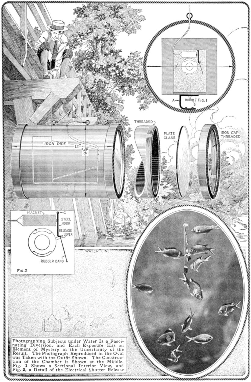The release device is operated as follows: Slip the plunger tube, with the shutter release cable, into its slot. Keeping the jaws wide open, place the trigger in the slots of the two compressed handles. It is only necessary to jerk a thread attached to the trigger to free the two handles, which in turn snap the plunger. If the tension on the jaws is too strong, put a rubber band around the handles to act as a check.—Werner W. Baumeister, Walla Walla, Wash.