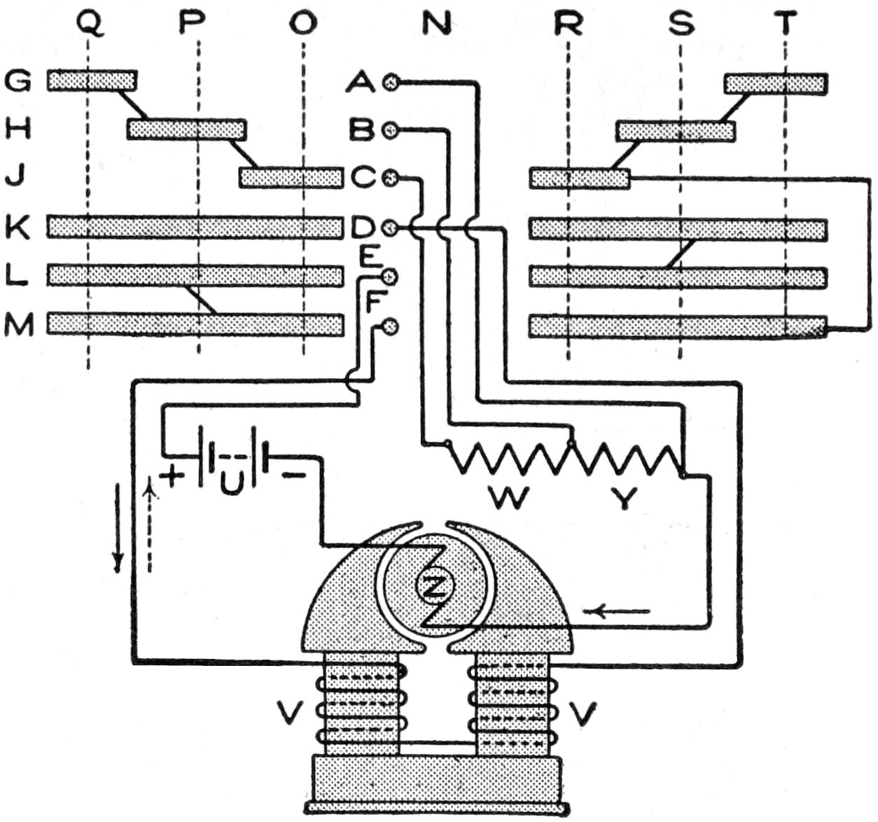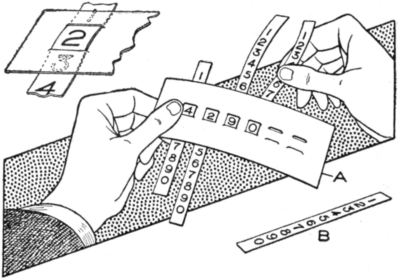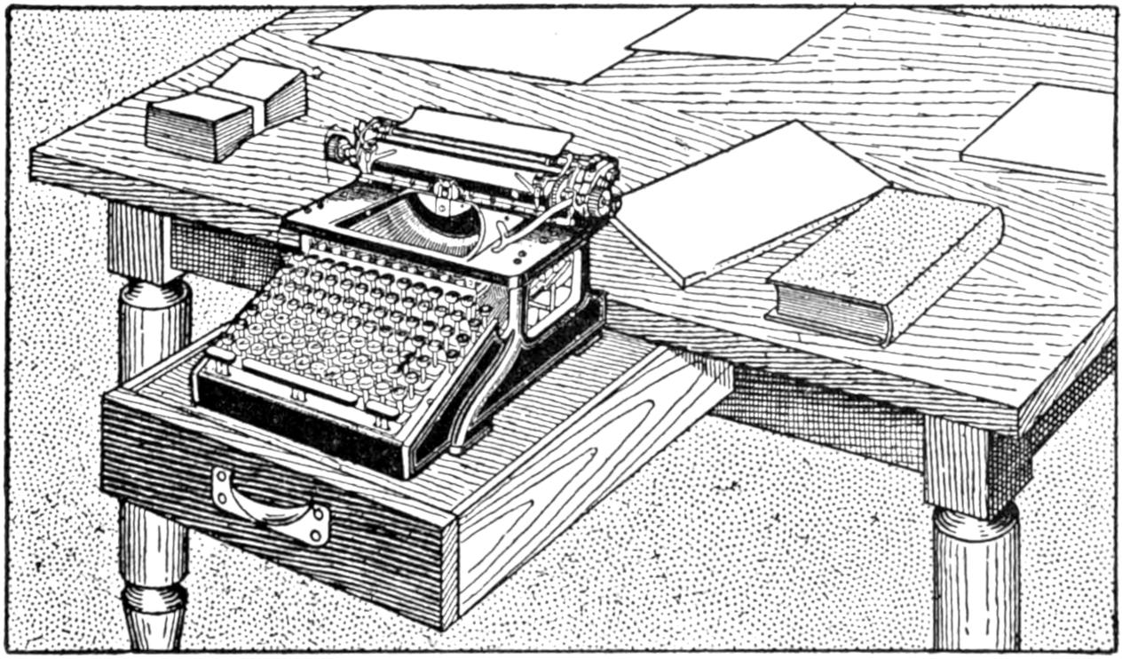 If the band that draws the typewriter carriage should break, the operator can continue to write until proper repairs are made by a temporary substitute for the spring tension. Tie a string to the carriage, where it will not become entangled in the mechanism, and attach a weight, about equal to the pull of the spring, to the string. Let the weight hang over the edge of the desk, to the left of the machine. It will pull the carriage along, as does the usual tension device.