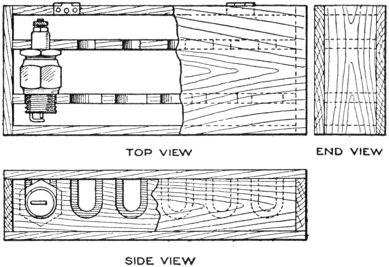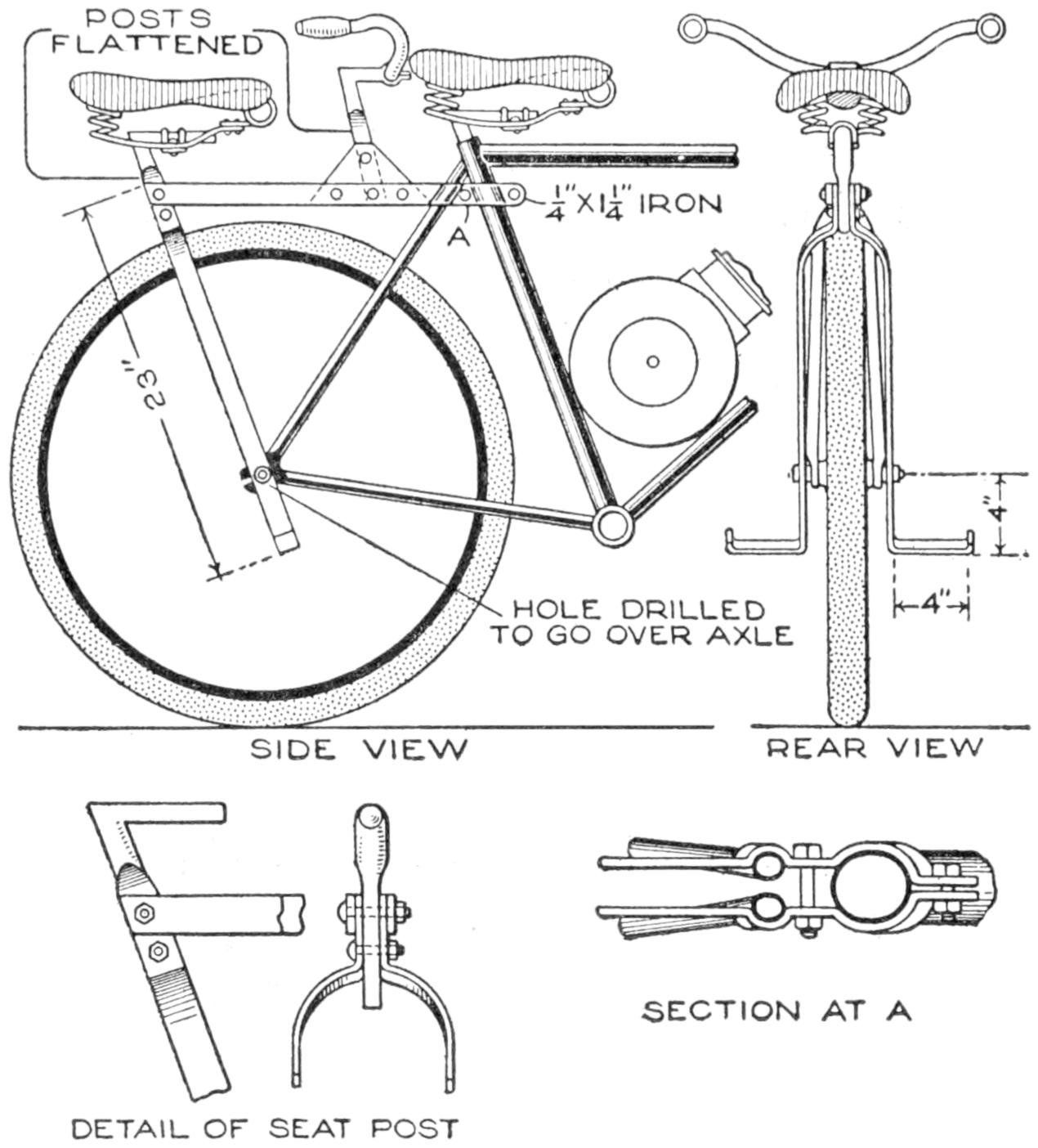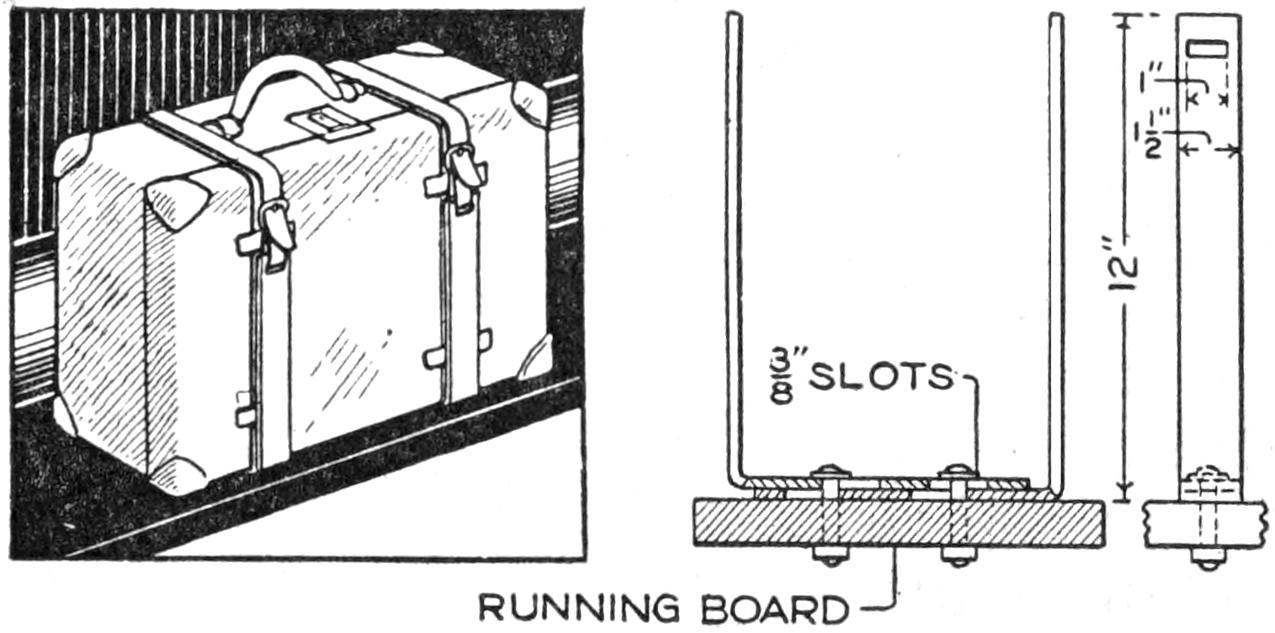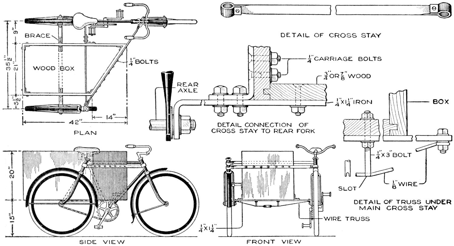Even though the home-built “bearcat” roadster, or other favorite model, does not compare in every detail with the luxurious manufactured cars, it has an individuality that puts it in a class by itself. The amateur mechanic, or the ambitious boy, who is fairly skilled with tools, can build at least the main parts for his own small car, of the simple, practical design shown in the sketch and detailed in the working drawings. If necessary, he can call more skilled mechanics to his aid. A motorcycle engine, or other small gasoline motor, is used for the power plant. The control mechanism of the engine and the electrical connections are similar to those of a motorcycle. They are installed to be controlled handily from the driver’s seat. The car is built without springs, but these may be included, if desired, or the necessary comfort provided—in part at least—by a cushioned seat. Strong bicycle wheels are used, the 1¹⁄₂ by 28-in. size being suitable. The hood may be of wood, or of sheet metal, built over a frame of strap iron. The top of the hood can be lifted off, and the entire hood can also be removed, when repairs are to be made. The tool box on the rear of the frame can be replaced by a larger compartment, or rack, for transporting loads, or an extra seat for a passenger.