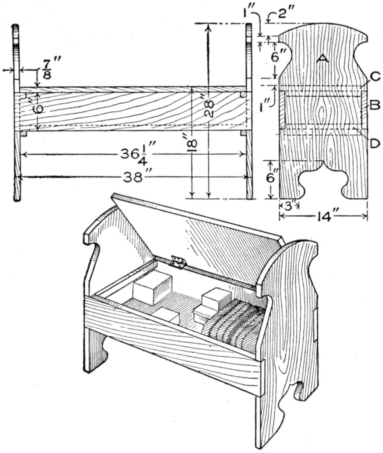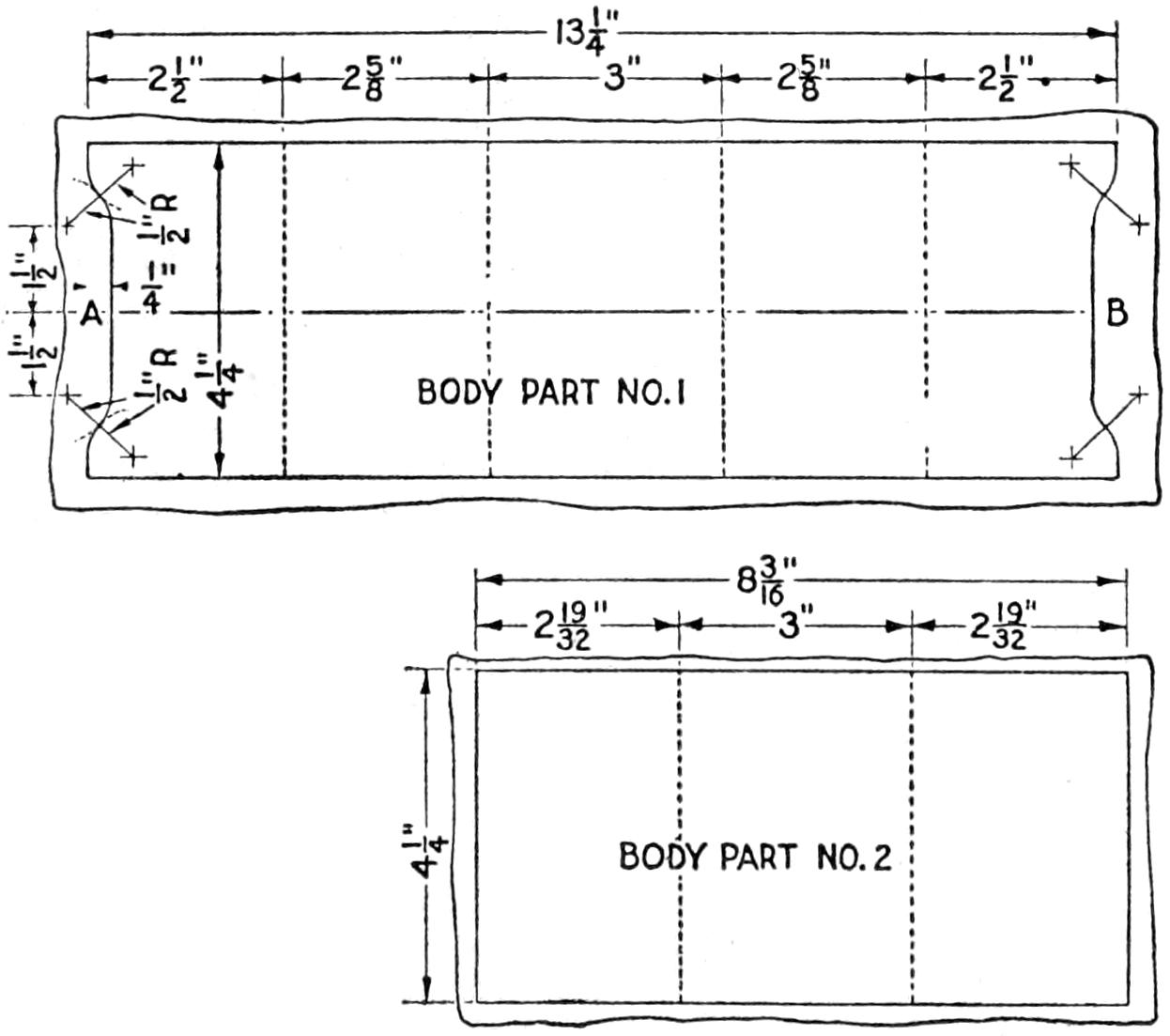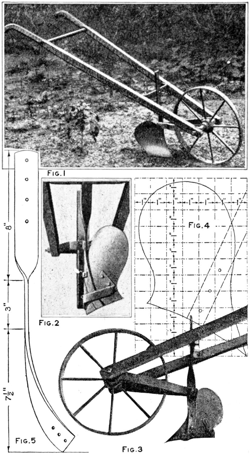 Even though the home-built “bearcat” roadster, or other favorite model, does not compare in every detail with the luxurious manufactured cars, it has an individuality that puts it in a class by itself. The amateur mechanic, or the ambitious boy, who is fairly skilled with tools, can build at least the main parts for his own small car, of the simple, practical design shown in the sketch and detailed in the working drawings. If necessary, he can call more skilled mechanics to his aid. A motorcycle engine, or other small gasoline motor, is used for the power plant. The control mechanism of the engine and the electrical connections are similar to those of a motorcycle. They are installed to be controlled handily from the driver’s seat. The car is built without springs, but these may be included, if desired, or the necessary comfort provided—in part at least—by a cushioned seat. Strong bicycle wheels are used, the 1¹⁄₂ by 28-in. size being suitable. The hood may be of wood, or of sheet metal, built over a frame of strap iron. The top of the hood can be lifted off, and the entire hood can also be removed, when repairs are to be made. The tool box on the rear of the frame can be replaced by a larger compartment, or rack, for transporting loads, or an extra seat for a passenger.