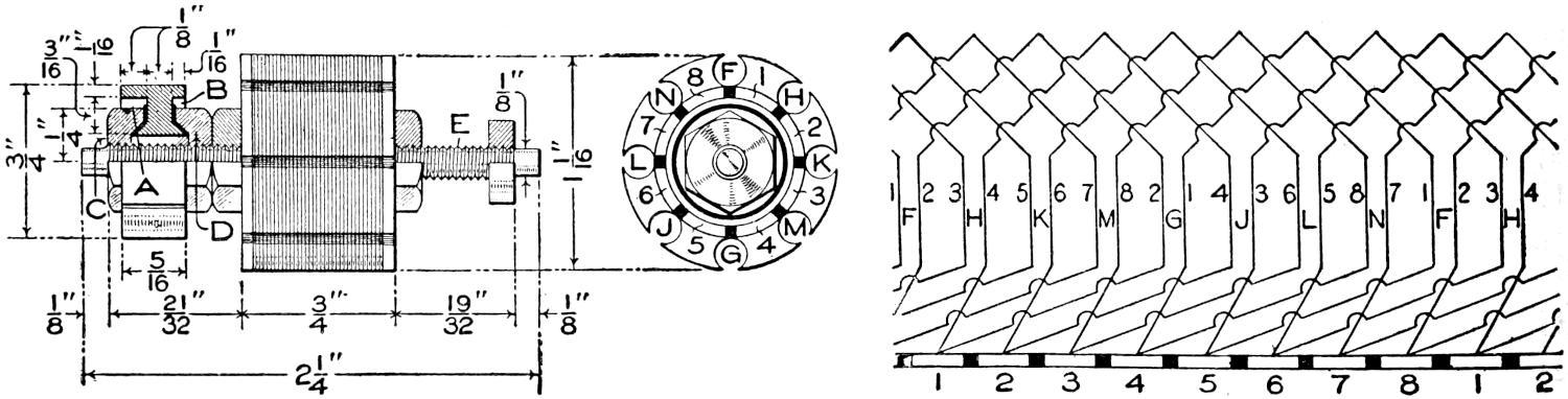 Before fitting the steering column into place, make the dashboard, of ⁷⁄₈-in. oak, as shown in the assembly view, and in detail in Fig. 7. It is 19¹⁄₂ in. high and 2 ft. 4 in. wide, and set on the frame and braced to it with 4 by 4 by 1¹⁄₂-in. angle irons, ¹⁄₄ in. thick. Fit a ⁷⁄₈-in. strip of wood around the edge of the dashboard, on the front side, as a rest for the hood, as shown in Figs. 1 and 7, at L. A brass edging protects the dashboard, and gives a neat appearance. Lay out carefully the angle for the steering column, which is of ⁷⁄₈-in. shafting, so as to be convenient for the driver. Mark the point at which it is to pass through the dashboard, and reinforce the hole with an oak block, or an angle flange, of iron or brass, such as is used on railings, or boat fittings. A collar at the flange counteracts the downward pressure on the steering post. The 12-in. steering wheel is set on the column by a riveted pin.