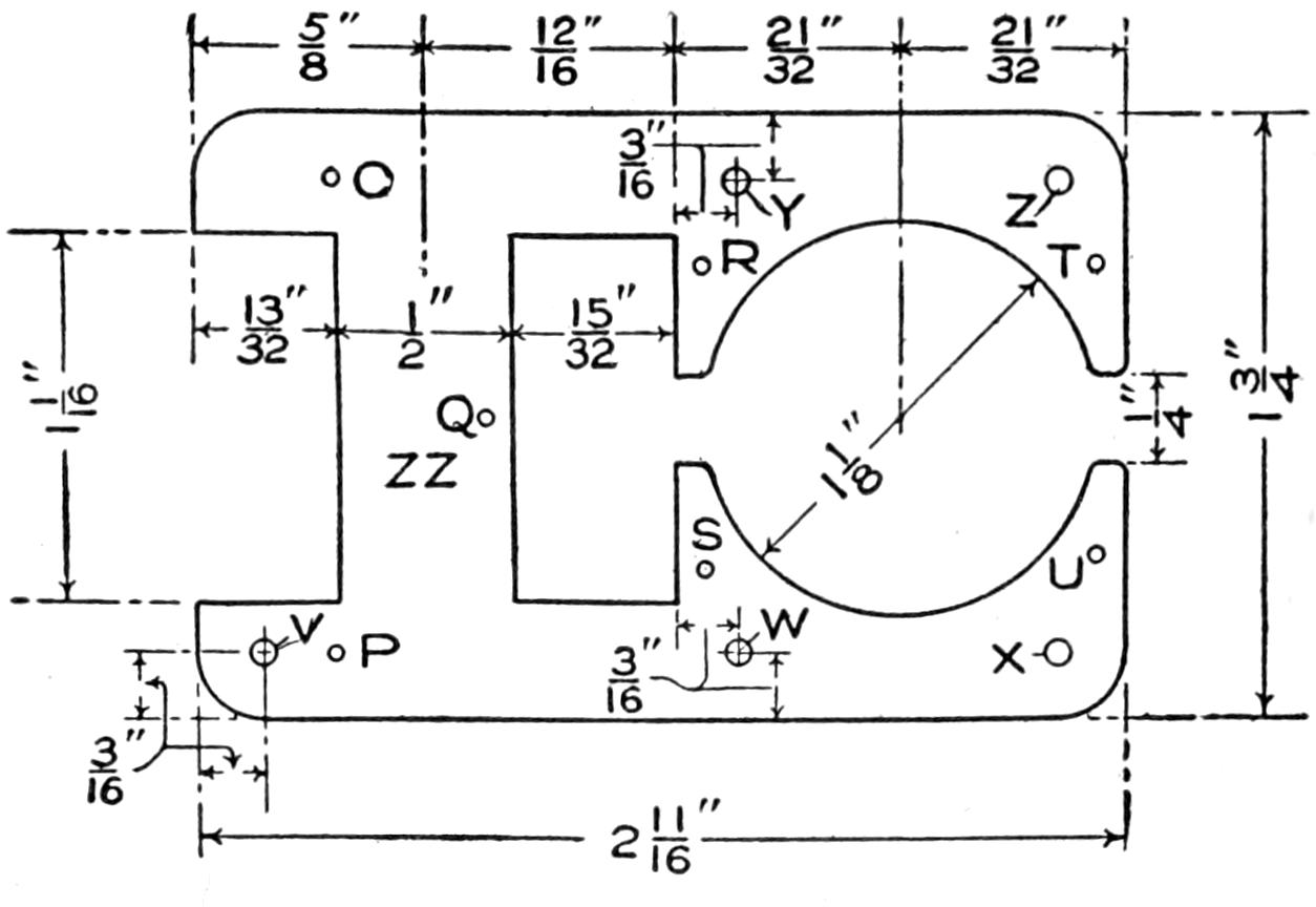 The transmission of the power from the motor shaft to the right rear wheel is accomplished by means of a leather motorcycle belt, made by fitting leather washers close together over a bicycle chain, oiling the washers with neat’s-foot oil. A grooved iron pulley is fitted on the end of the motor shaft, and a grooved pulley rim on the rear wheel, as shown in Figs. 1 and 3, and detailed in Fig. 4. The motor is started by means of a crank, and the belt drawn up gradually, by the action of a clutch lever and its idler, detailed in Fig. 9. The clutch lever is forged, as shown, and fitted with a ratchet lever, N, and ratchet quadrant, O. The idler holds the belt to the tension desired, giving considerable flexibility of speed.