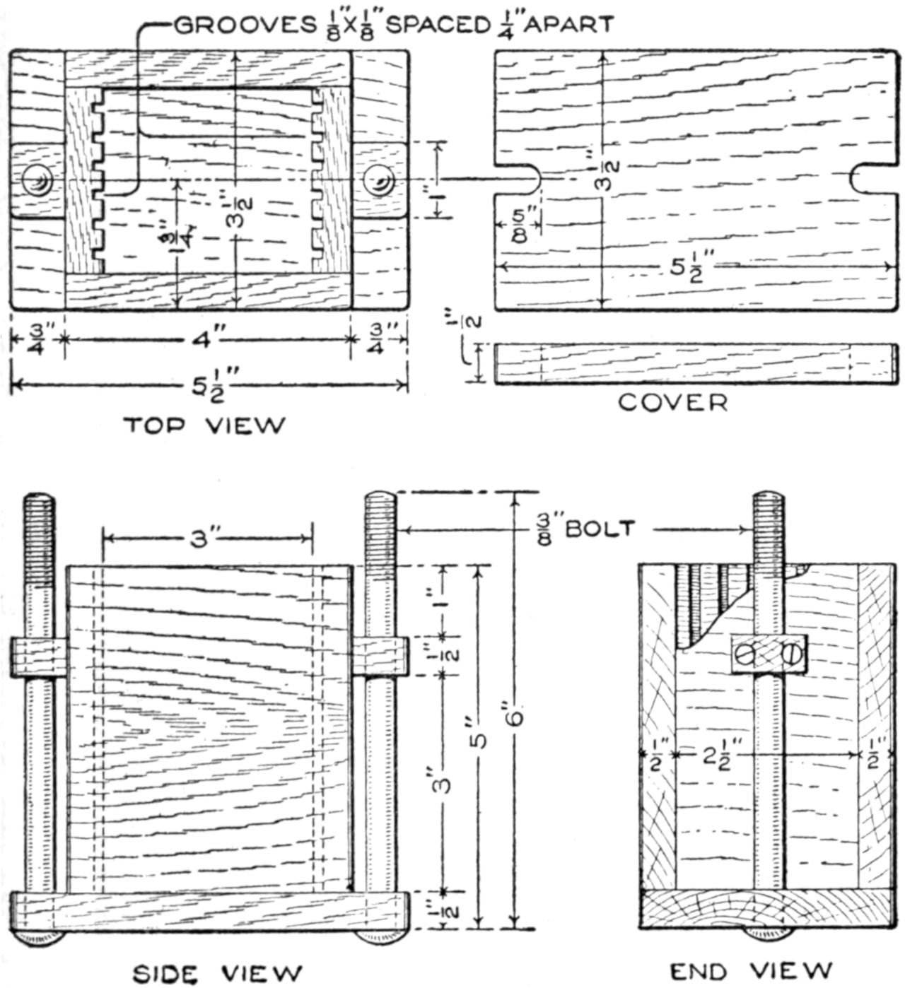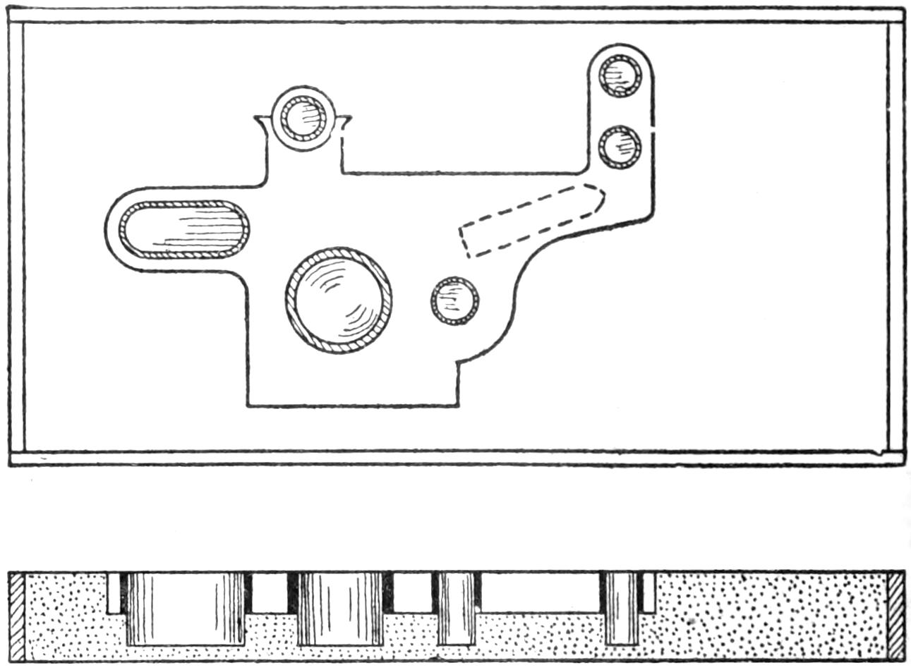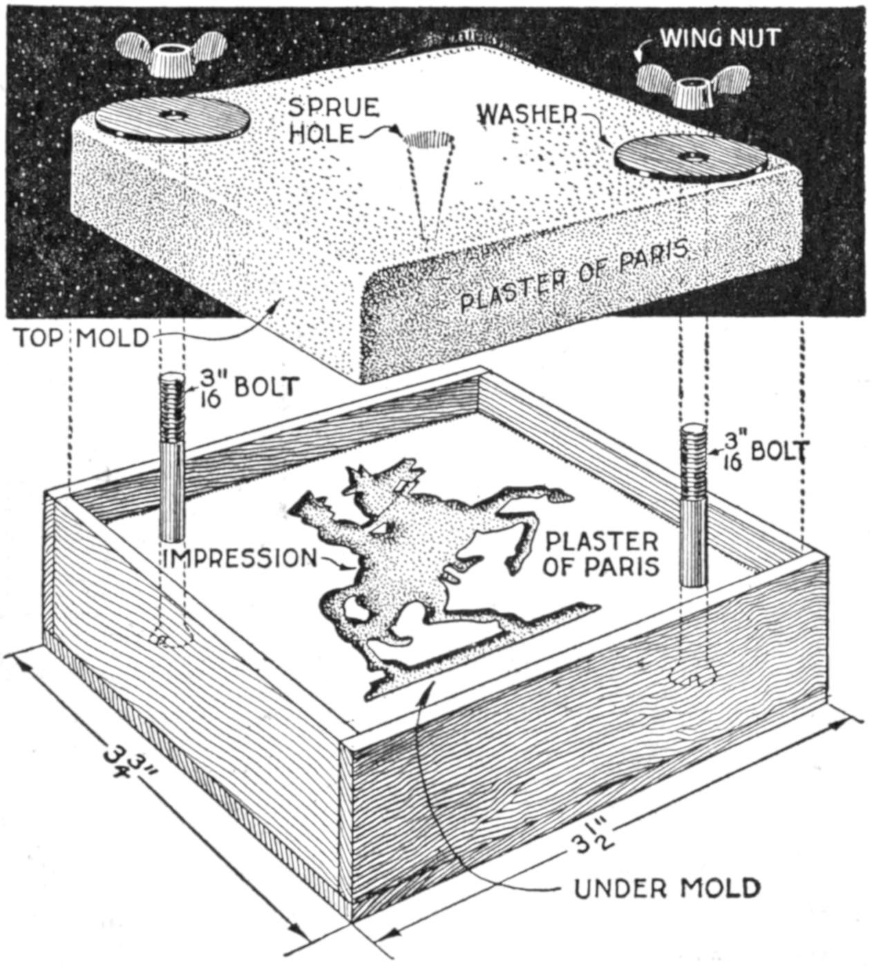 First obtain a small lead soldier, and coat it with shellac. Make a box somewhat larger than the pattern for the soldier, as shown in the sketch. Make it about 1¹⁄₂ in. deep, and set bolts near the corners, as shown, pouring the plaster around them. Fill the box half full of plaster of Paris. While still soft, press the pattern into the center of the plaster so that half its thickness is imbedded. Permit the under mold to dry, and remove the pattern. Shellac the surface of the plaster and the impression. Wrap a layer of oiled paper around the bolts. Replace the pattern in the impression and fill the remaining half of the box with plaster, and permit it to dry.