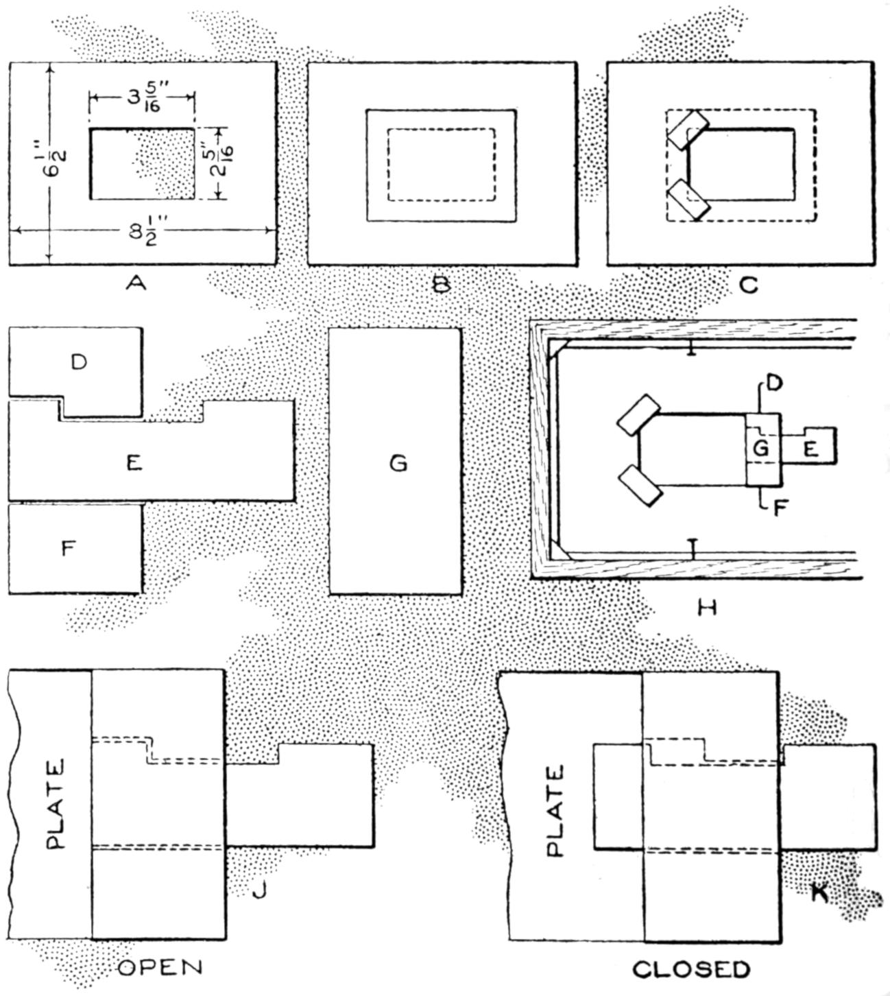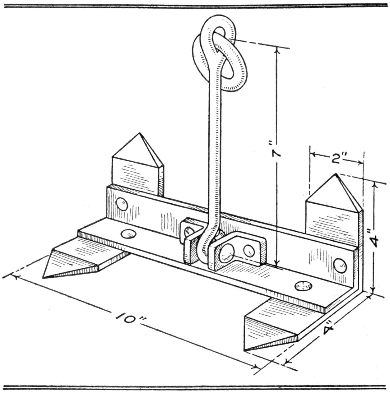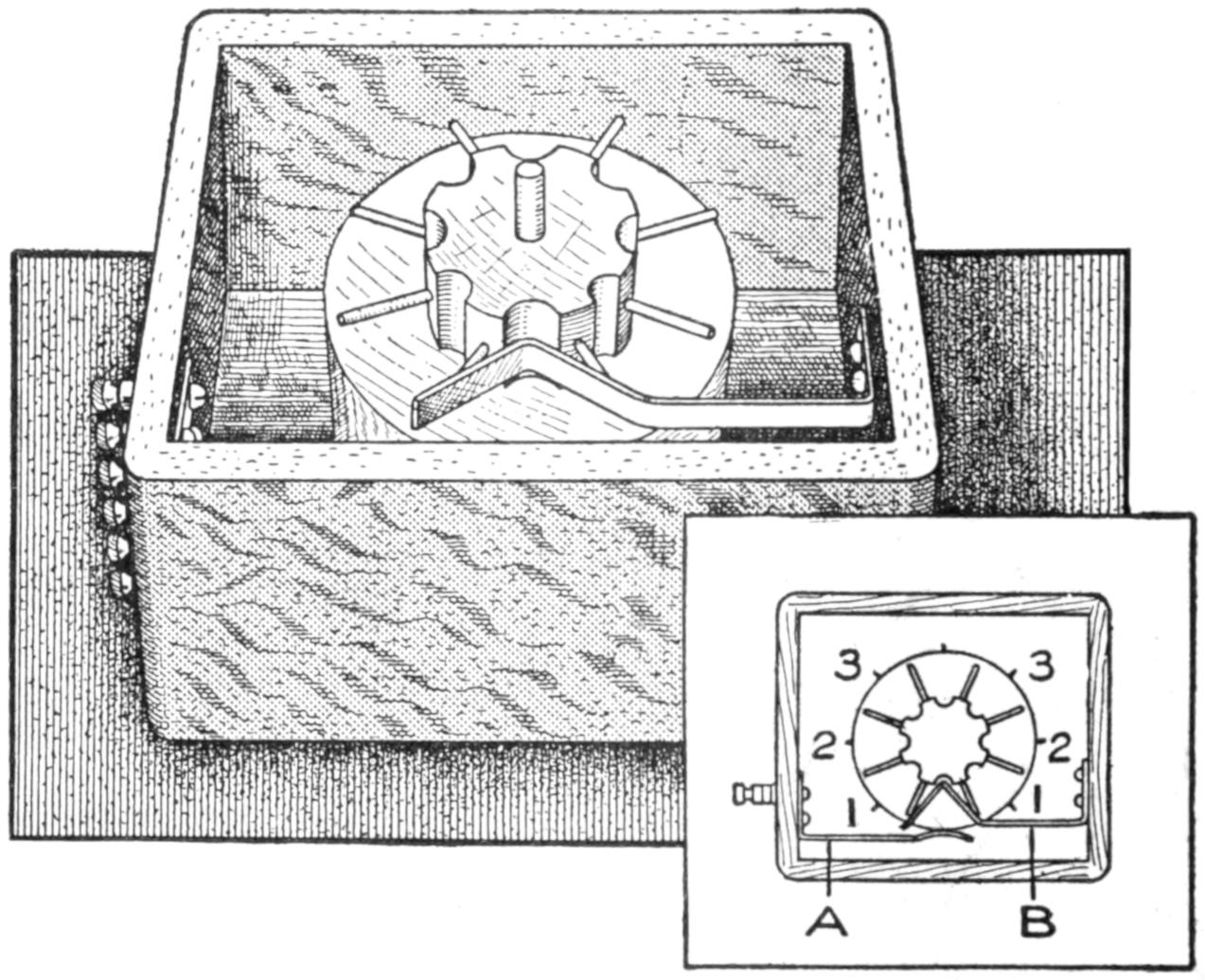 First obtain a small lead soldier, and coat it with shellac. Make a box somewhat larger than the pattern for the soldier, as shown in the sketch. Make it about 1¹⁄₂ in. deep, and set bolts near the corners, as shown, pouring the plaster around them. Fill the box half full of plaster of Paris. While still soft, press the pattern into the center of the plaster so that half its thickness is imbedded. Permit the under mold to dry, and remove the pattern. Shellac the surface of the plaster and the impression. Wrap a layer of oiled paper around the bolts. Replace the pattern in the impression and fill the remaining half of the box with plaster, and permit it to dry.