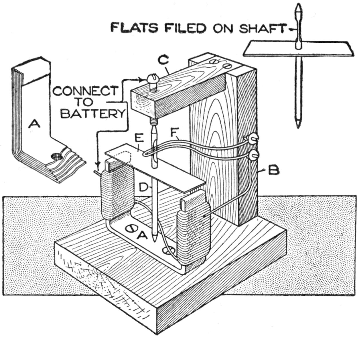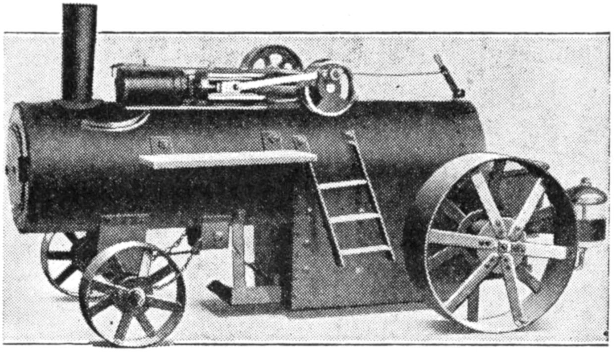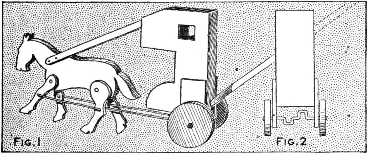 An ordinary two-volt dry cell, a small motor, and the necessary wooden parts, as shown in the illustration, are all that is needed for the making of a toy tractor that will give its builder a great deal of fun. A good feature is that the parts can be taken down quickly and used for other purposes when desired. A base, ¹⁄₂ by 3 by 9 in. long, is made of wood, and two axles of the same thickness are set under it, as shown. The wheels are disks cut from spools, or cut out of thin wood for the rear wheels, and heavier wood for the front ones. They are fastened with screws and washers, or with nails. The dry cell is mounted on small strips and held by wires. The motor is fastened with screws and wired to the dry cell in the usual manner. One of the front wheels serves as the driver, and is grooved to receive the cord belt.—J. E. Dalton, Cleveland, O.