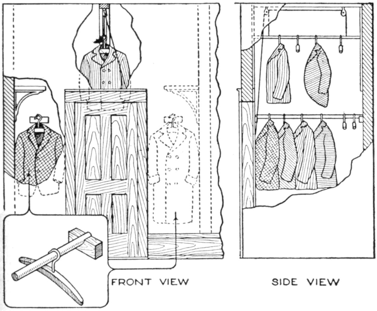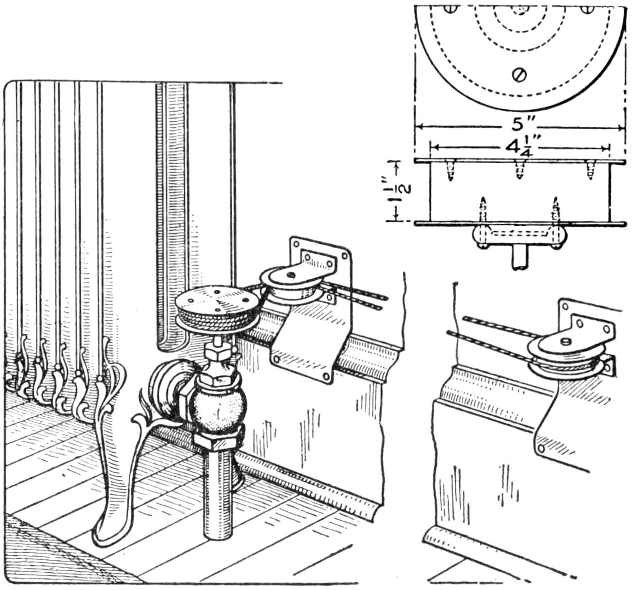 The master latch may be attached at any place on the bar, and should be placed at the bottom drawer, for cases too high to be reached handily. To make the device for a small space, a ¹⁄₄-in. metal rod, with metal fingers clamped on, can be used. Metal striking plates are then put on the back edges of the drawers.—G. A. Luers, Washington, D. C.