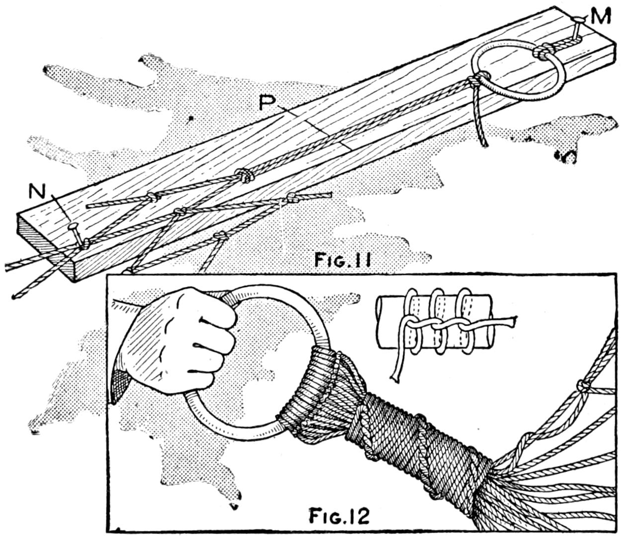 Persons having to tie a large number of packages or parcels soon find that their fingers become sore from breaking the heavy cord in the usual manner by wrapping it around the finger to form a cutting loop. A handy device, that can easily be made, is a string-cutting ring fashioned from a horseshoe nail, as shown. The point of the nail is curled into a hook, and the inner edge of the hook is sharpened. The string is quickly looped around the hook and cut by a slight pull on the free end. The ring is worn on the little finger.—C. C. Spreen, Flint, Mich.
