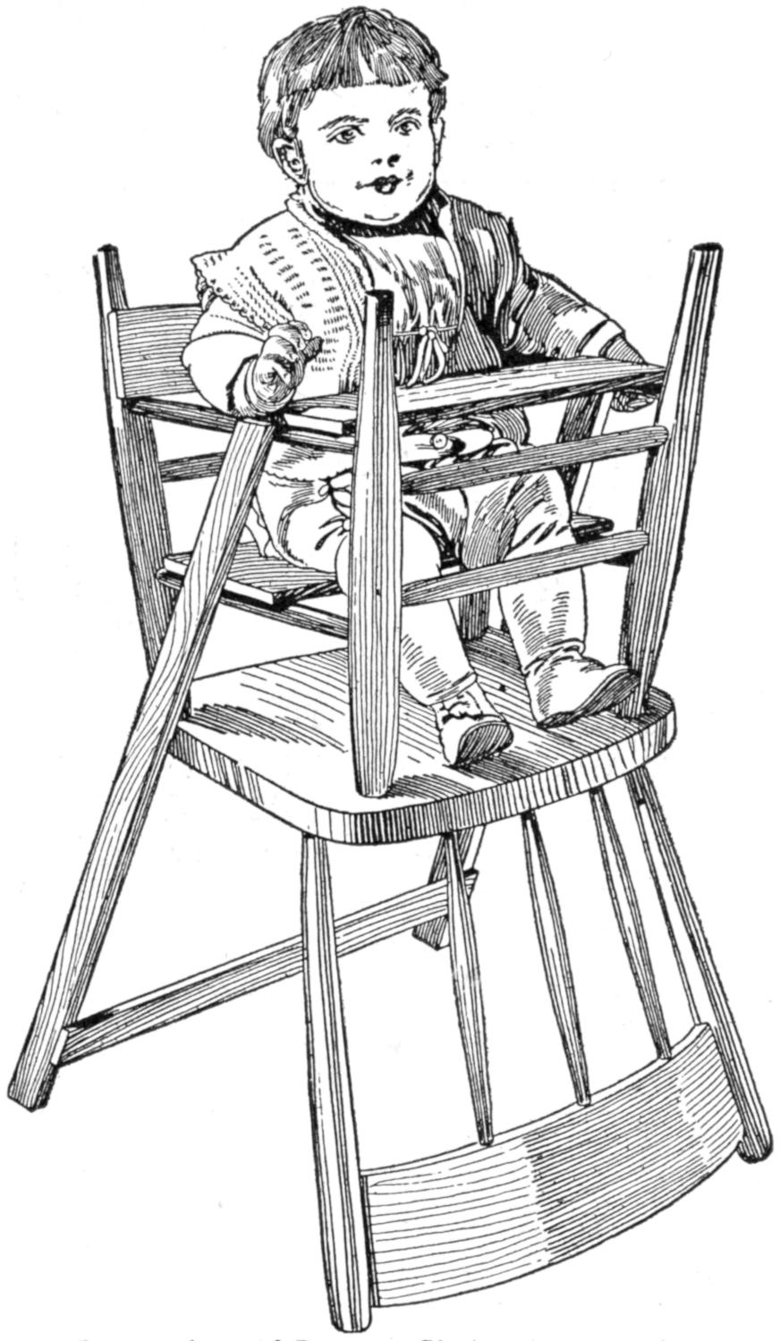 A contrivance that keeps the baby entertained, by the hour, at intervals, and is a big help to a busy mother, was made in a short time. I mounted four wooden arms on a small motor, as shown. On the ends of two of the arms, I fixed small pin wheels, one blue and the other yellow. The other arms hold curious-shaped pieces of bright cardboard, one red and the other green. The driving motor is run by one two-volt cell. The revolving colored pin wheels amuse baby in his high chair, and the device has well repaid the little trouble of making it.—A. H. Lange, St. Paul, Minn.