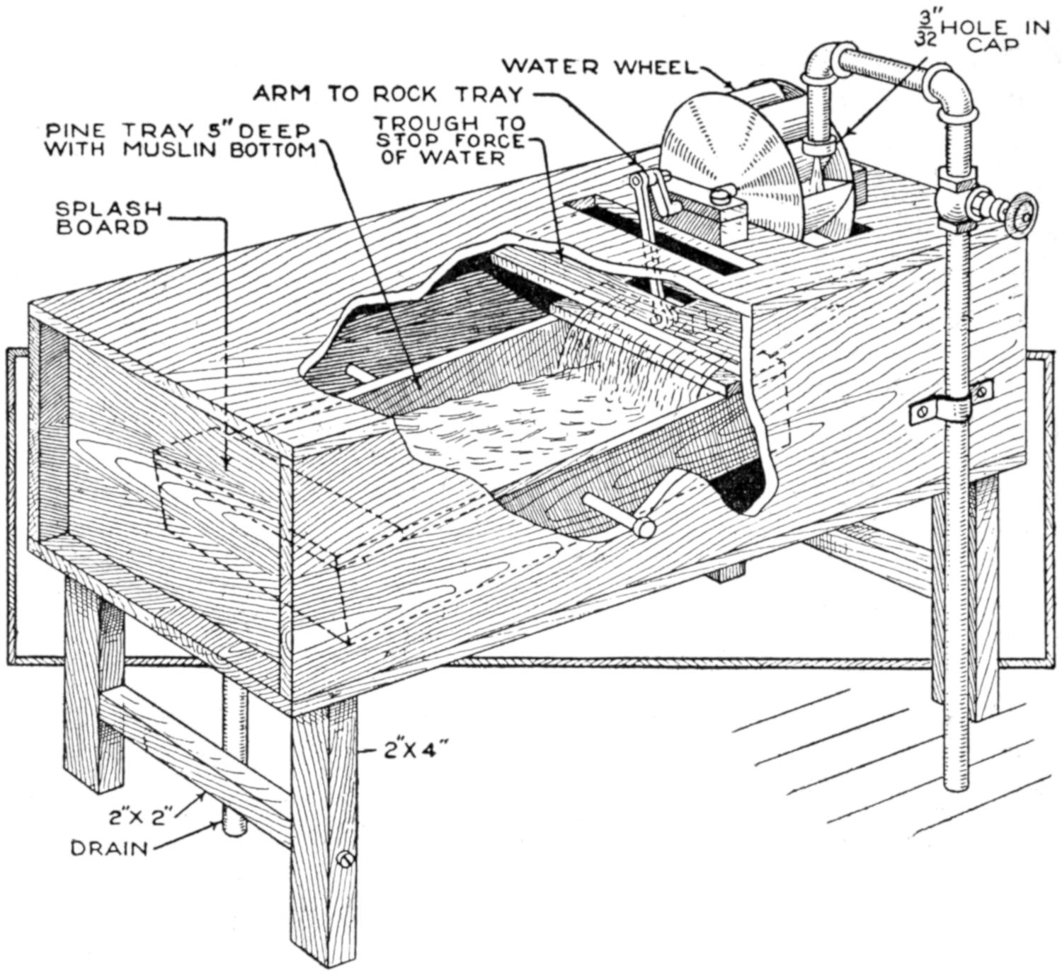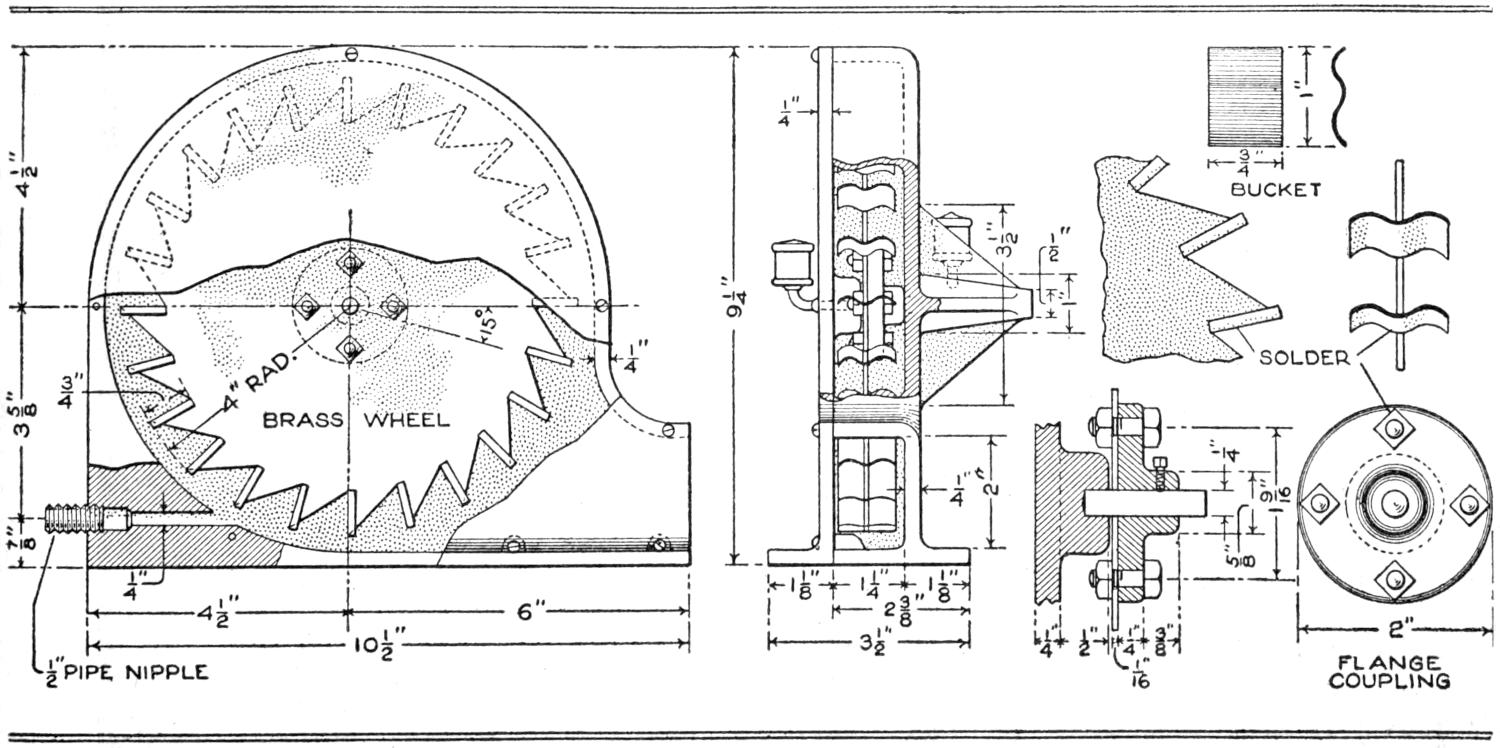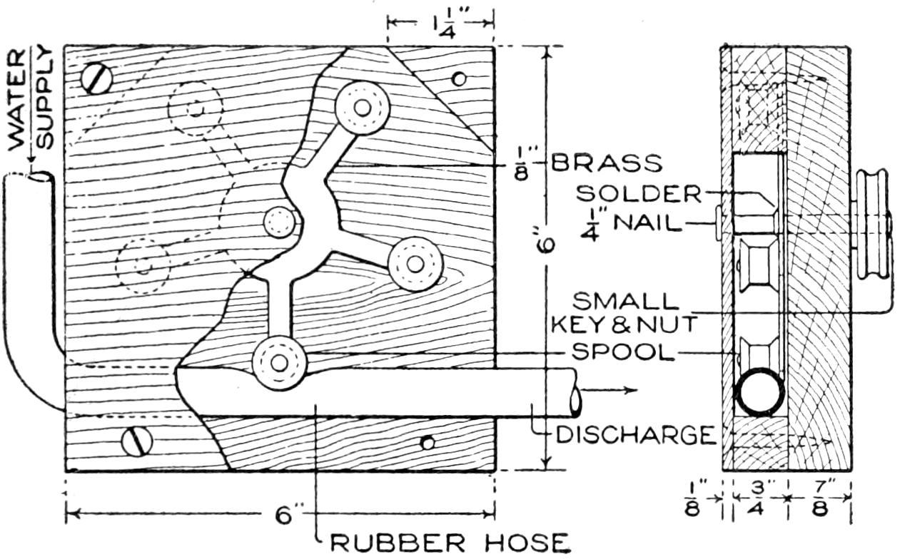 This small power pump is made from a block of wood, a piece of rubber hose, and a 5-arm rotor of brass, with small spools attached to it. The base of the casing is 6 in. square, and of ⁷⁄₈-in. wood. A ³⁄₄-in. triangular block is set at each corner, and a ¹⁄₈-in. cover of wood, fastened at the four corners with screws. A large nail is used as a shaft for the rotor, which is cut from brass, ¹⁄₃₂ to ¹⁄₁₆ in. thick. Small spools are mounted on the arms of the rotor, and the small pulley wheel is fixed on the end of the axle. The action is simple: As the rollers on the arms revolve against the hose, the force of the stream at the discharge end is increased, the device acting as a pump. Such an arrangement was used for moving targets in a rifle range, and can be built on a larger scale if desired. A small water, or electric, motor is used to drive the pump.—S. A. Hardy, St. Paul, Minn.