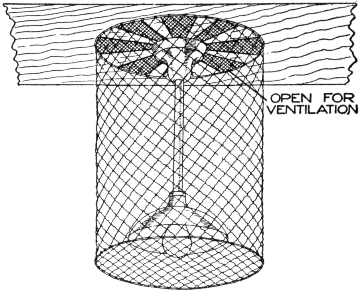 Oftentimes the fisherman takes a pail along on a fishing excursion so that he may bring back his catch alive, to put it in a water tank, or to keep the fish fresh. The water in an ordinary pail soon becomes stale, and the fish may die before he reaches home. They should be kept in the water of the lake or stream until the fisherman goes home. A good means of caring for them, superior to the common string, is to make a wire-mesh container, to fit inside the water pail, as shown. The mesh form can be lifted out, carrying with it all of the fish in the pail, and be set in the fresh water.—Dale R. Van Horn, Milton, Wisconsin.