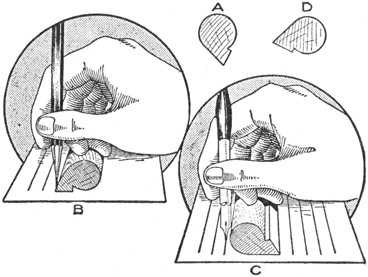 ¶Ruling pens often work improperly, or have a tendency to cut the paper because of tiny feather edges at the points. These should be carefully honed and stropped off.