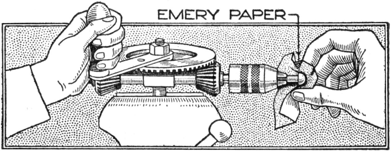 Irregularities in the feeding of the paper into a typewriter are often due to slippery spots on the platen. To overcome this trouble, clean the platen thoroughly with a mixture of two parts of denatured alcohol to one part of ether. Rub the polished parts with No. 2 emery cloth, then smooth the surface with No. 0 emery cloth. In cleaning a typewriter with gasoline, the effect is to leave the parts dry. A better method is to use a mixture of one part of typewriter oil to 50 parts gasoline. This will leave a fine coating of oil, which is too fine to collect dust, on the working parts.—William Doenges, Fort Sam Houston, Texas.