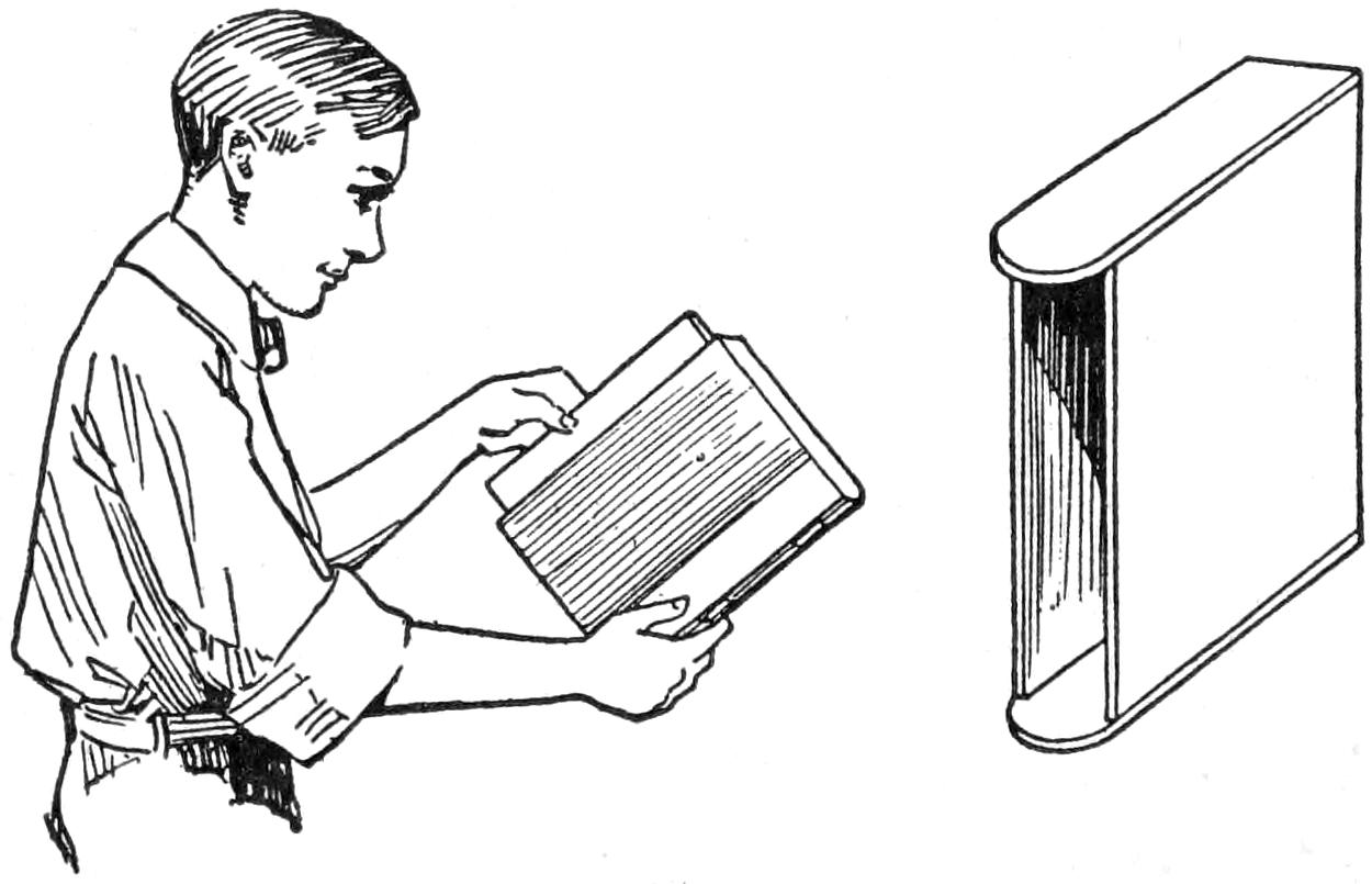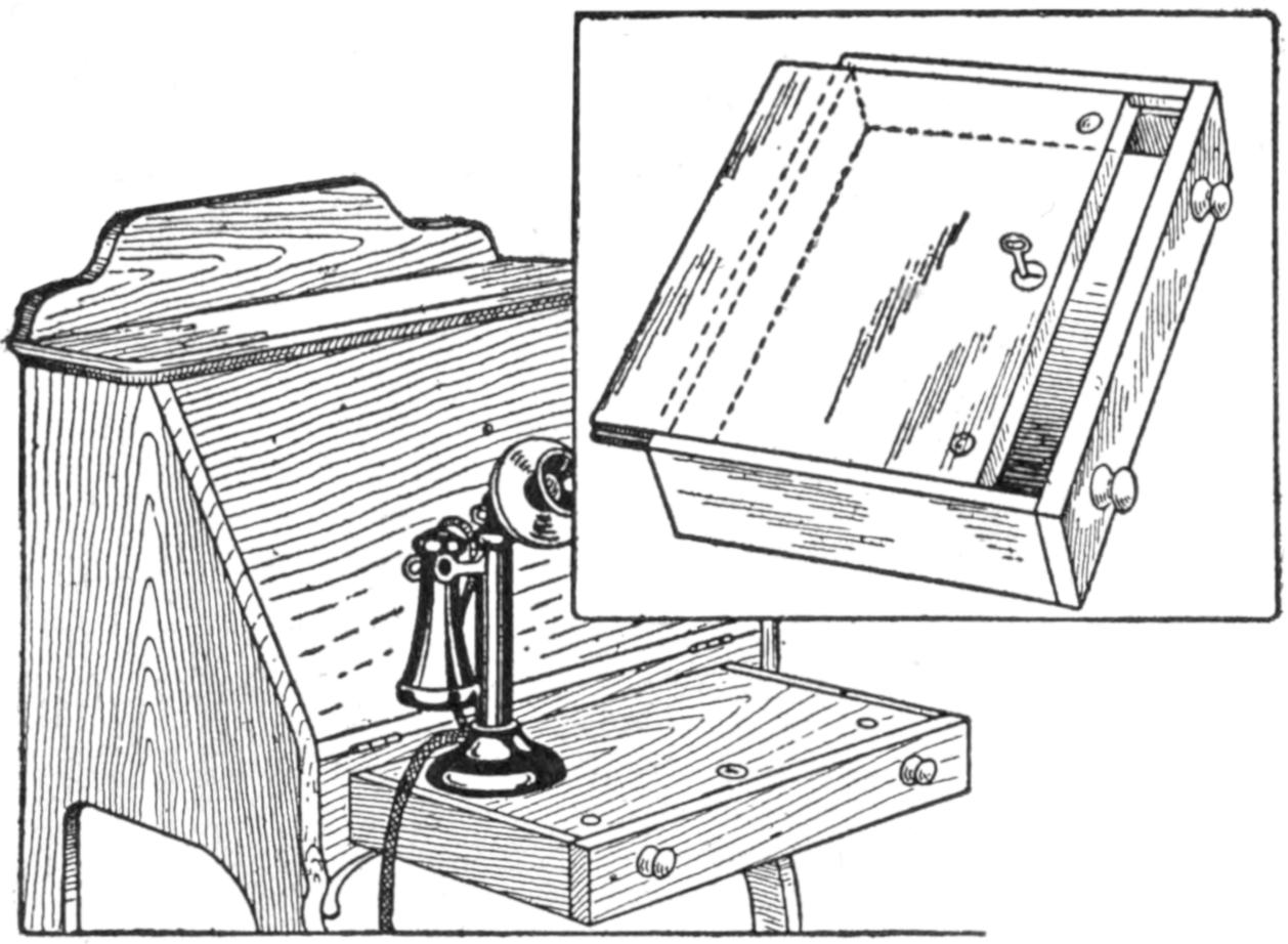 The job of addressing a large number of mailing tubes is an awkward one, unless the tube is set so that its upper edge is on a level with the hand. A convenient method of doing this, and a kink which is permanently useful where mailing tubes are to be addressed from time to time, is to arrange ordinary coat hooks at the side of the desk near the front corner, as shown. The tube is placed on the hooks, its upper edge even with the top of the desk, making the writing of the address as handy as in writing ordinarily.