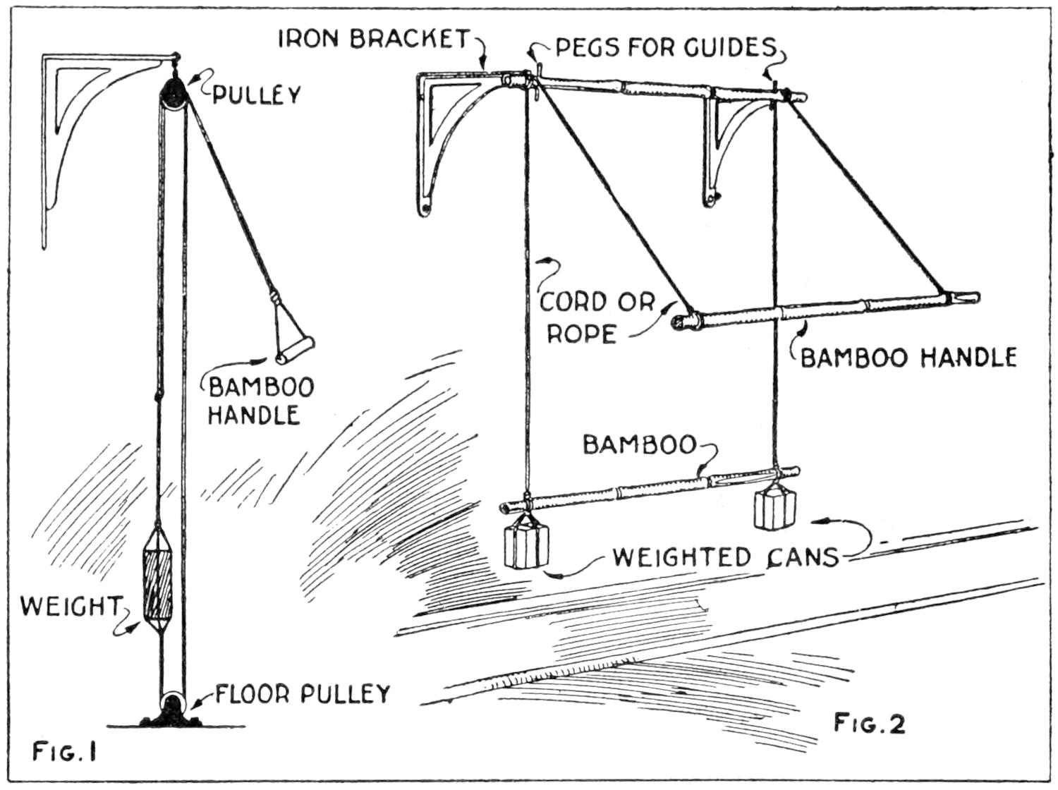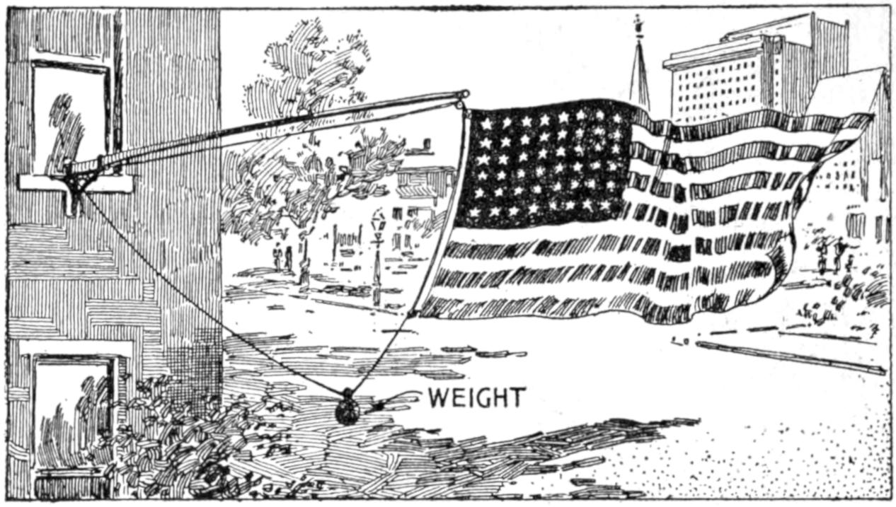 A householder devised a simple and effective method of keeping the flag upright when displayed from a nearly horizontal flagstaff. The cord which held the flag was run through pulleys, as indicated, and weighted with a pulley weight.—M. T. Kanary, Chicago, Illinois.