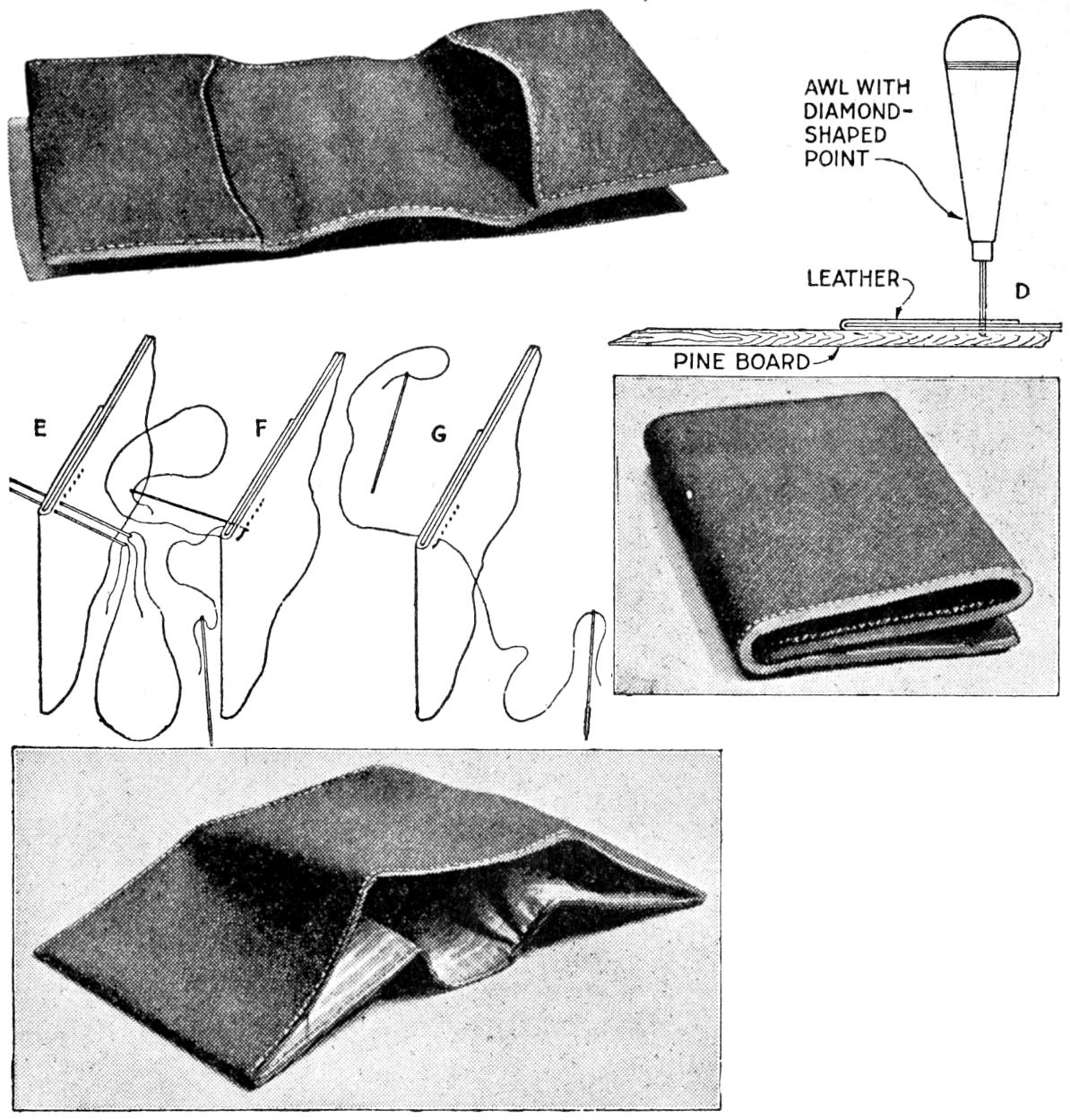 The neatness of the billfold will depend largely on the care with which the sewing is done, and the finish on the edges. Draw a straight line with a blunt-point tool along the edges to be sewed, ³⁄₁₆ in. from them. Mark the spacing for an inch of the stitches on a strip of paper and transfer them to the stitching line. Punch the holes, making certain that each is made with the awl held vertical, as shown at D. Back the open ends with strips of cardboard when punching holes in them. Heavy, waxed silk of a color to match the leather is used for the sewing. The work may be done by hand without a holder, clamped between two boards. Thread the two needles and start them from the right side, as at E. Pass the needle from the first hole through the second as at F. With the needles then in position, as at G, continue this stitch. Tie the ends of the thread neatly at the end of the stitching. Trim the edges and tool them to a smooth finish with a suitable metal tool, or rod, heated moderately, applying water with the finger tip.