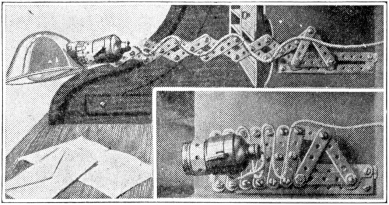The extension arm for an electric lamp shown in the illustration was made of strips from steel building toys. I installed it in my writing desk, and fastened it with one screw to the back of the desk inside the pigeonhole. When collapsed the arm measures 7¹⁄₂ in. from the fastened end to the front end of the socket, leaving only the globe protruding. Extended, it measures 16¹⁄₂ in. The lamp cord is taken through a hole in the back of the desk. If a very rigid arm is wanted, the strips can be doubled. I used screws with two nuts, but rivets can be used also, leaving the joints to move freely. The sliding feature at the inner end adds about 2 in. to the length of the arm when extended.—A. J. Viken, Waterloo, Ia.