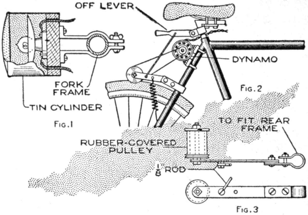 Rigging up a small dynamo on the bicycle is a simple job, the dynamo being belted from a friction pulley, making connections with the rubber tire of the rear wheel, as shown. Fig. 1 shows the make-up of the head lamp. It is composed of a tin cylinder, grooved at one end to hold the lens; at the other end of the cylinder is fastened a ³⁄₄-in. wooden disk, to which the lamp socket is fixed. Clamp straps hold the lamp on the fork frame. The small lamp, inserted in the socket, holds the reflector in place.
