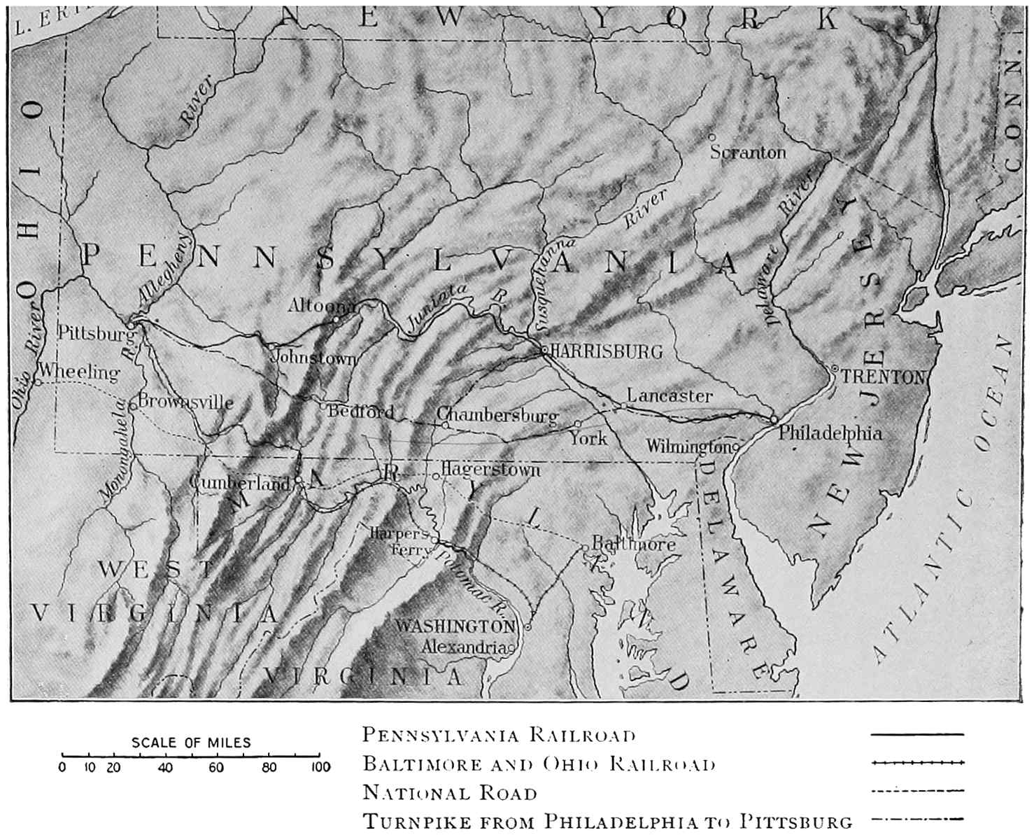 From the Berkshire country at the north to the southern end of the Appalachians, there are to-day thriving towns and fertile fields. No longer does the mountain wall cut off the products of the West from the markets of the East. Yet hardly a hundred years ago the eastern strip of country was practically shut off from the whole territory drained by the Ohio and Mississippi rivers. Indian trails and rough roads were the only means of communication between the two sections. Great as are the natural resources of both regions, their prosperity has been bound up in the development of roads and railways, and is due in large measure to the energy, foresight, and self-sacrifice of those who crossed the barrier and made it easy for others to follow them.