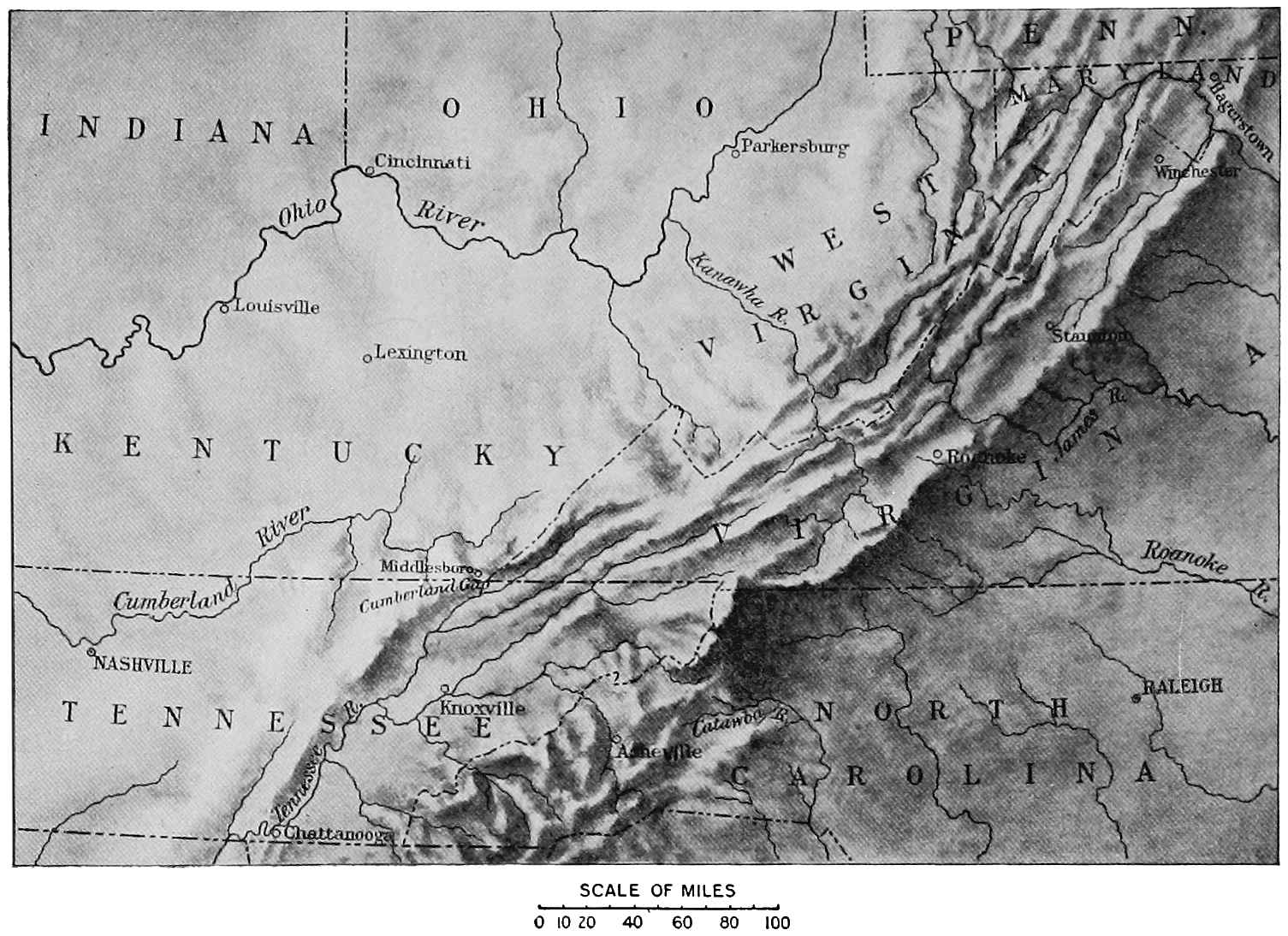If we go back to Cumberland Gap, we shall see that many things have happened since Boone’s time. In the pass and on the Pinnacle, a thousand feet above on the north, are ridges of earth, which show where busy shovels153 threw up defenses in the Civil War; for armies passed this way between Kentucky and the valley of Tennessee, and made the gap an important point to be seized and held.