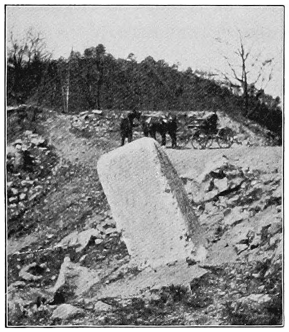 But if we climb through the gap as Boone did, or ride a horse to the Pinnacle, we may look out upon the wonderful valley below, stretching off to the foot of the Great154 Smoky mountains, whose rugged tops carry our eyes far over into North Carolina. Or we may turn the other way and follow Boone’s trail to the Blue Grass. Down in the gap is a rough, weather-beaten pillar of limestone about three feet high and leaning as the picture shows (Fig. 59). It is almost, but not quite, where three states come together, for it is here, at the Cumberland Gap, that the corners of Virginia and Kentucky meet on the edge of Tennessee.